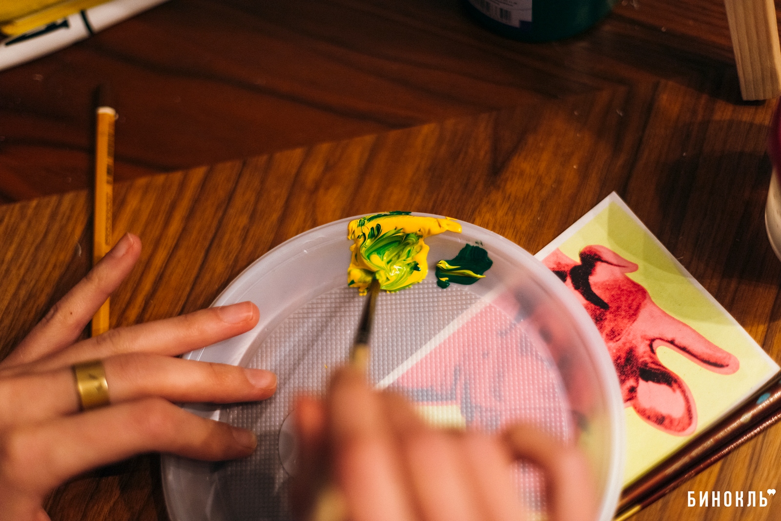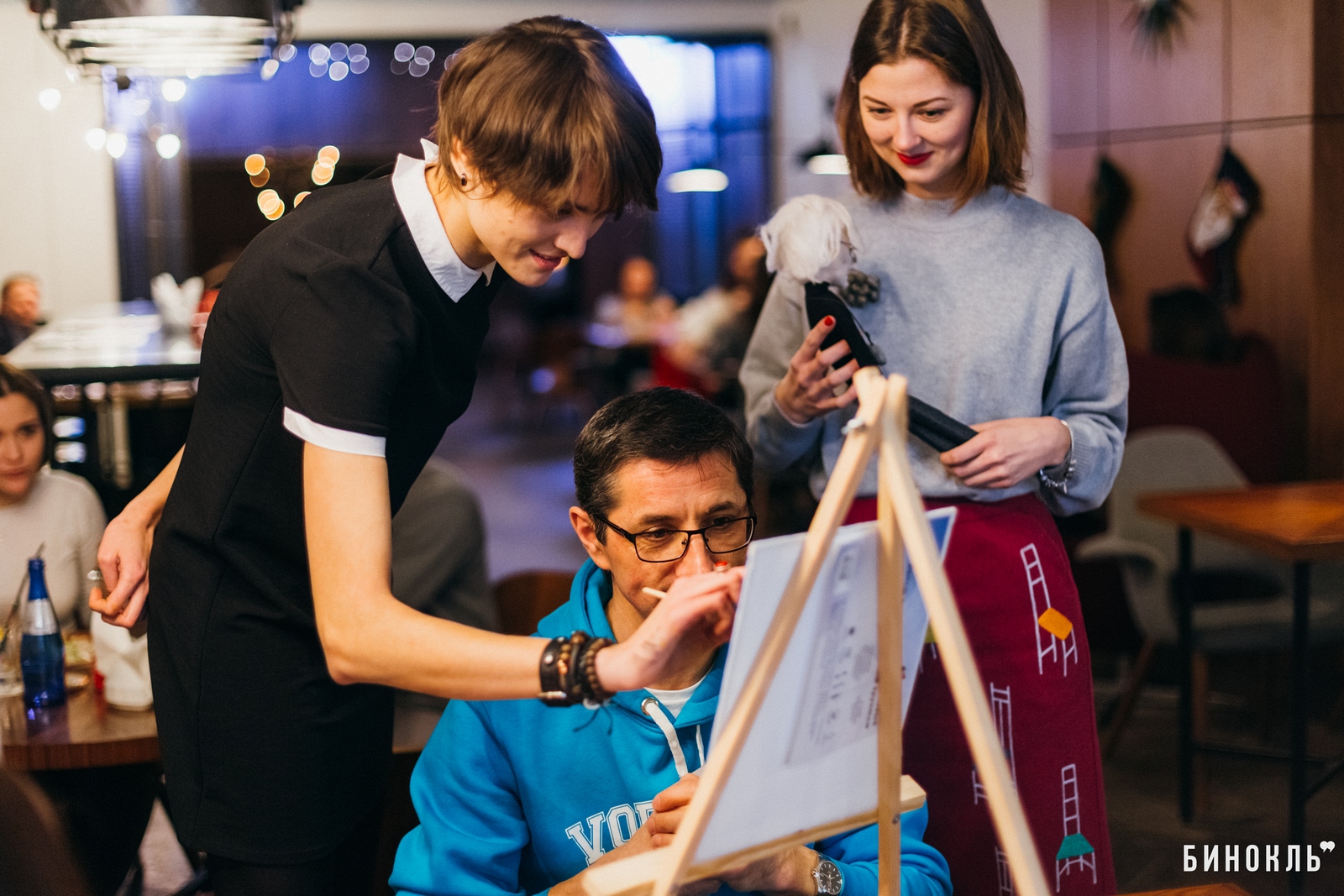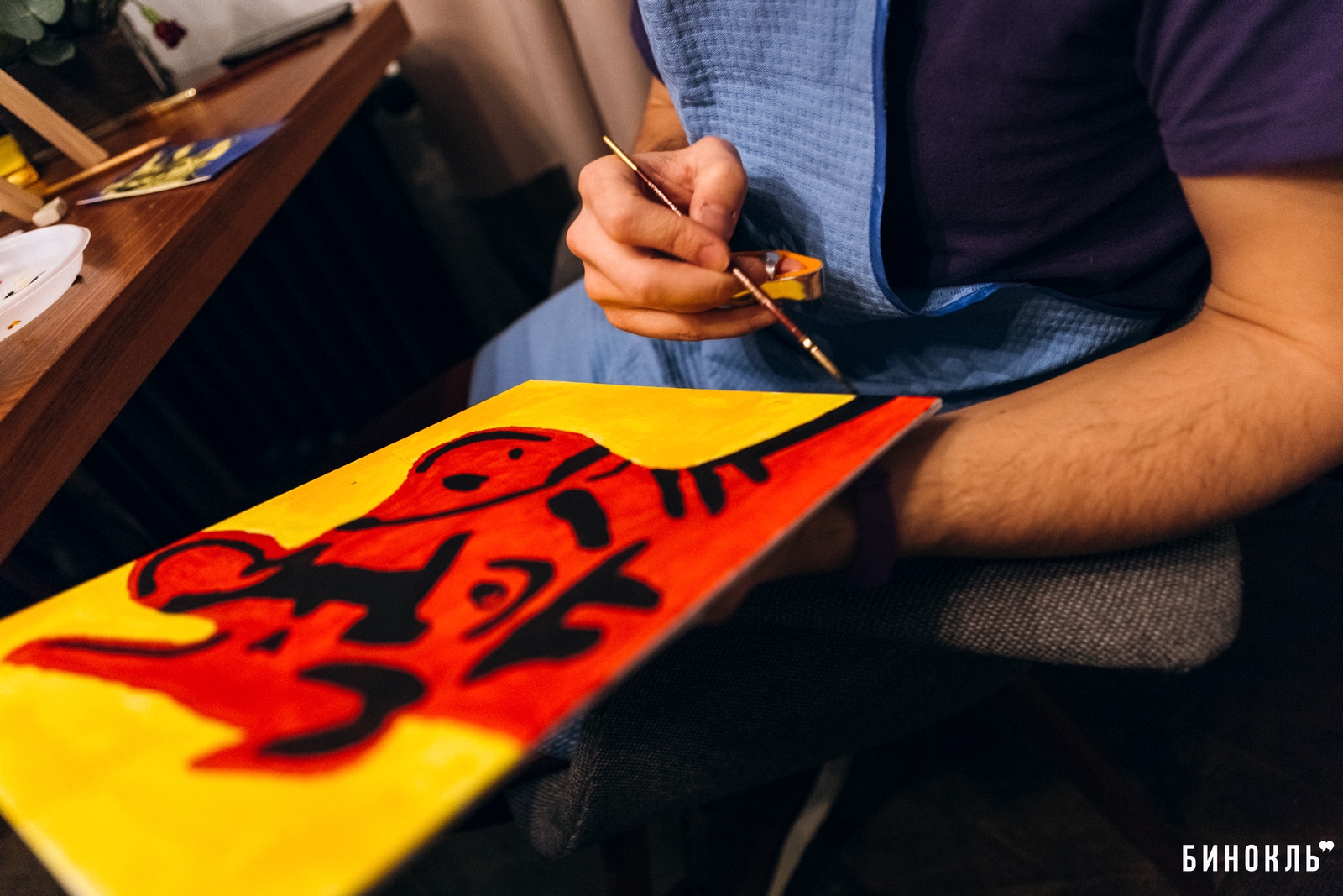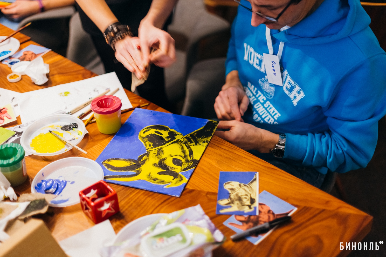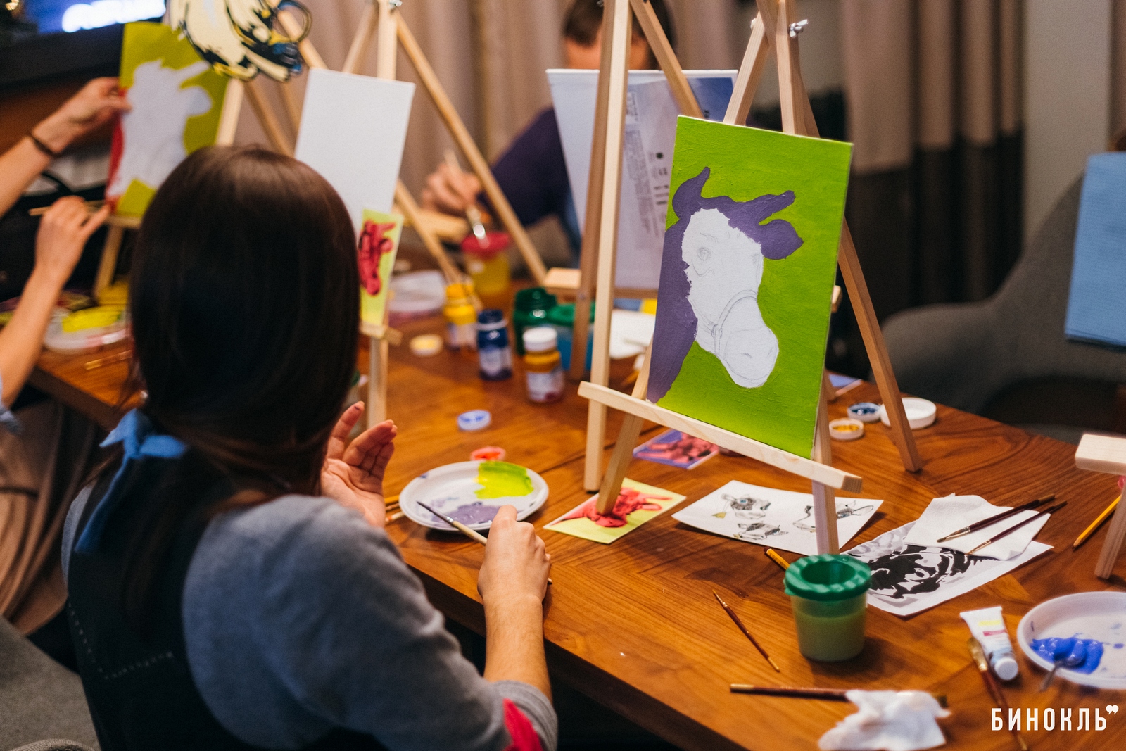 Бинокль” посетил одну из арт-встреч проекта “Hello ART”, на которой участники в приятной атмосфере, под руководством художника, создают собственные картины. Темами таких встреч становилась живопись мировой классики – работы Ван Гога, Марка Шагала, Густава Климта.
