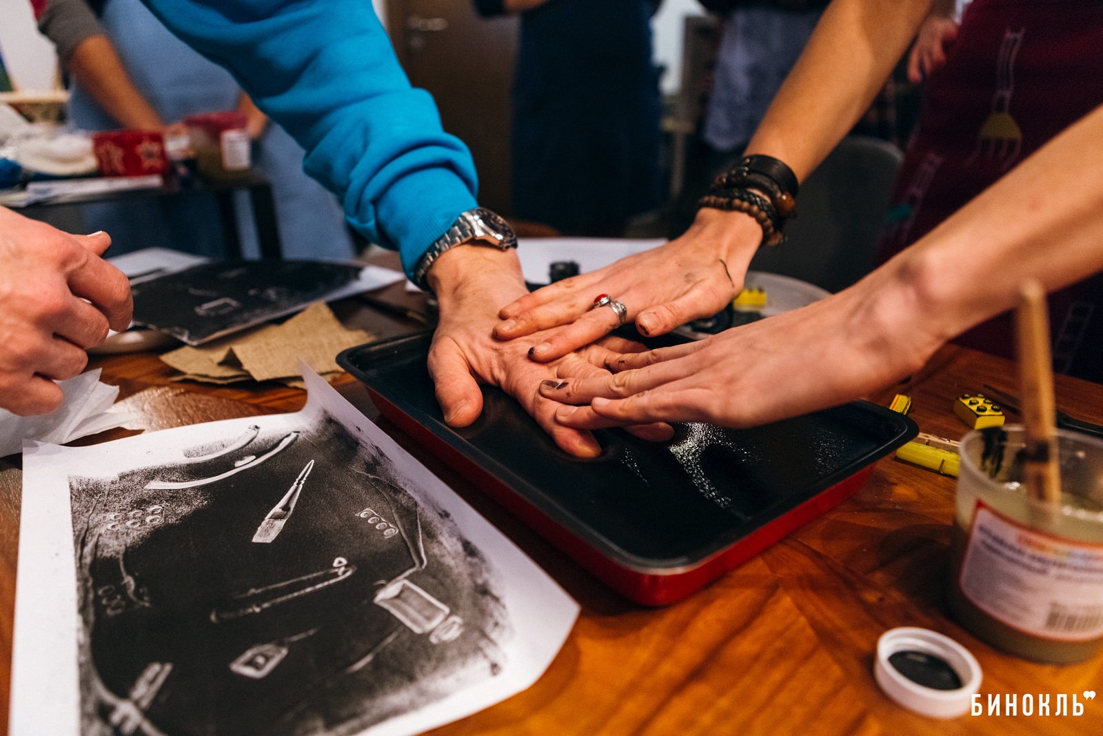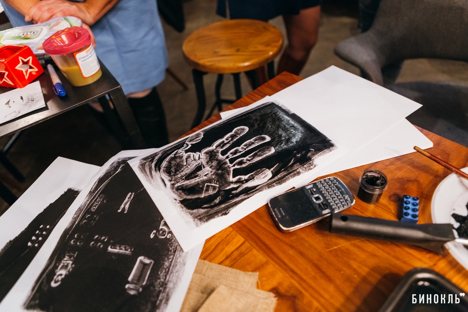 Чтобы познакомить участников проекта поближе с творчеством художника, организаторы выбрали своеобразный способ, аналогичный одной из простейших графических техник монотипии, при помощи которой Уорхол создавал свои работы. В нашем случае были использованы гуашь и емкость с застывшим желатином, в которой побывали все мелкие предметы со стола: кисти, скрепки, ножницы, конструктор лего, тюбики с акрилом, колбы и много другое.