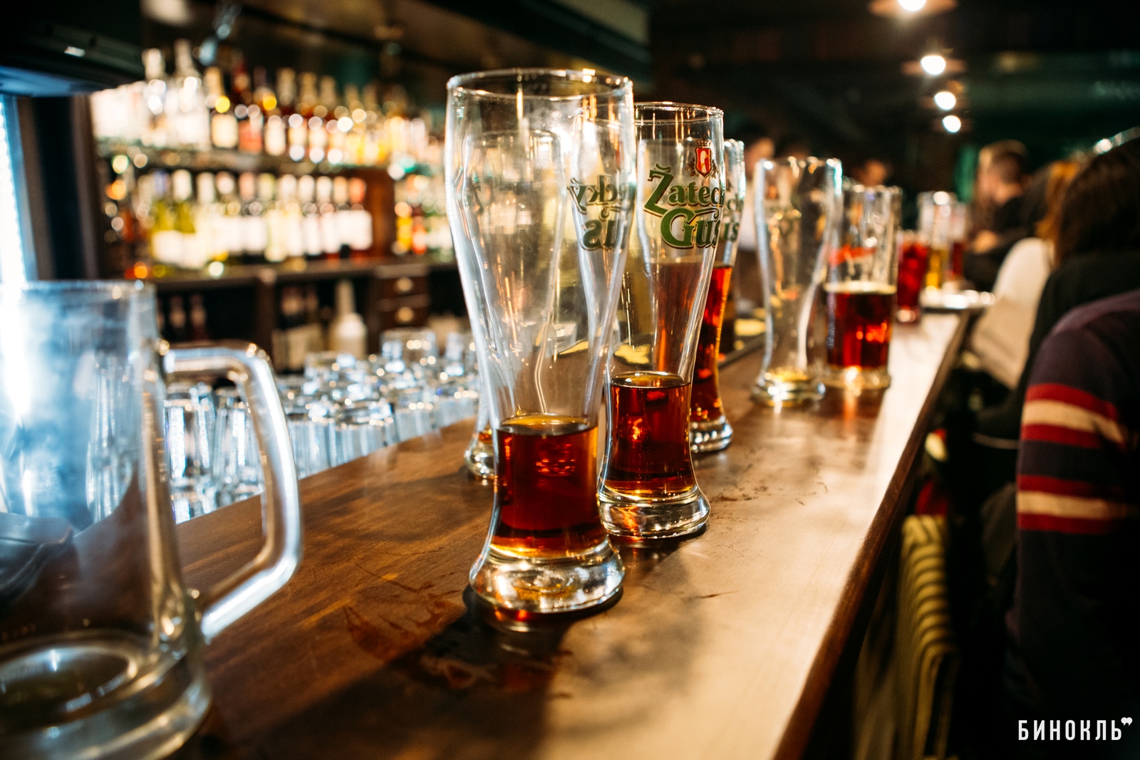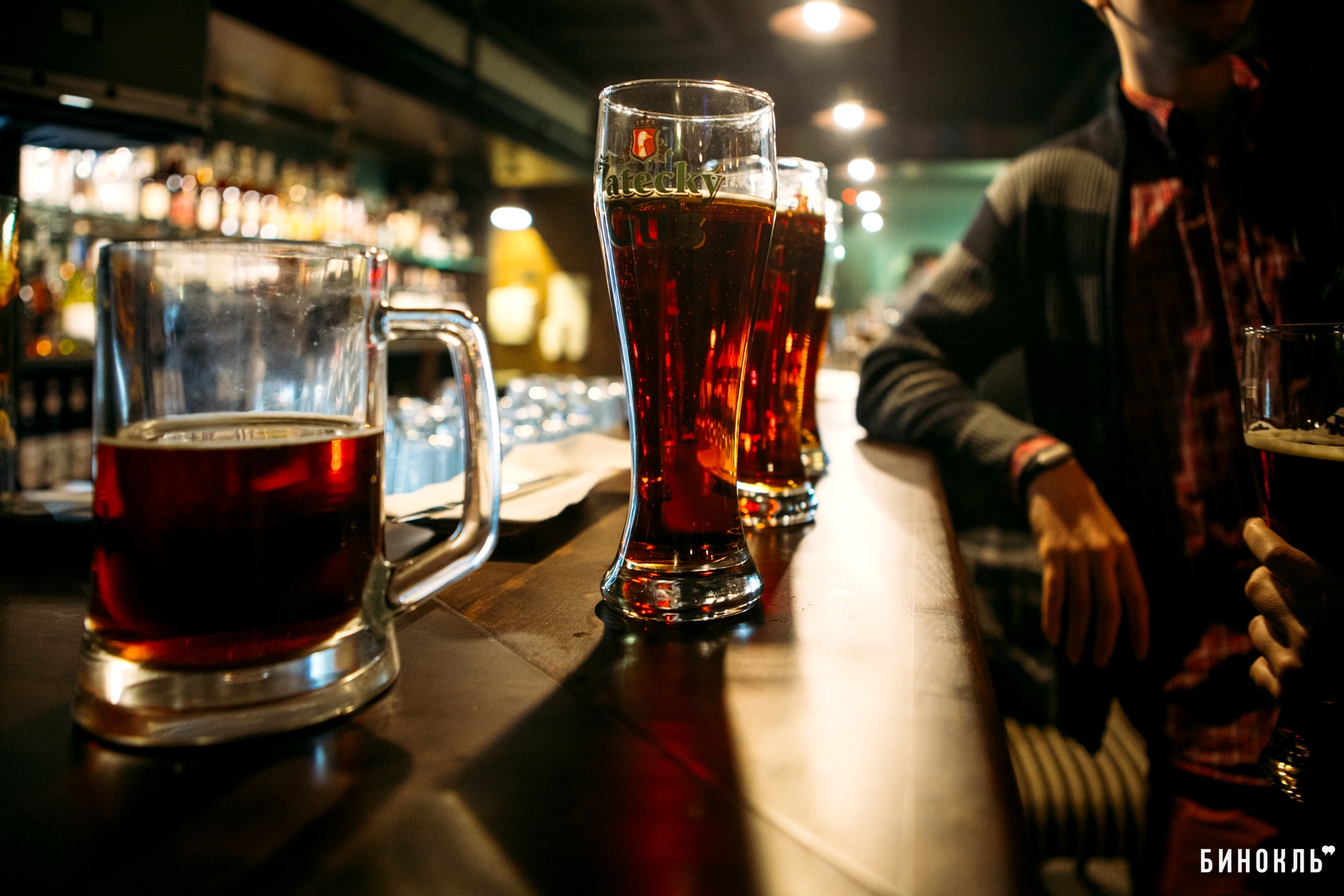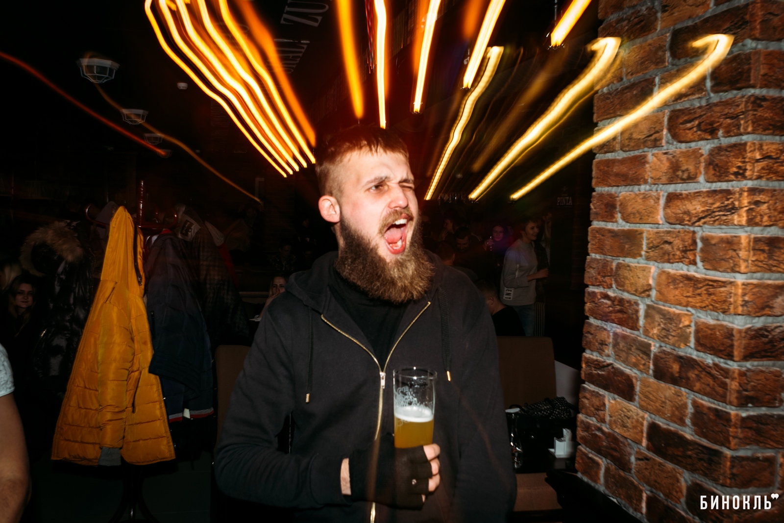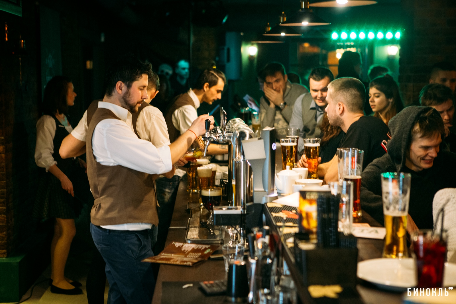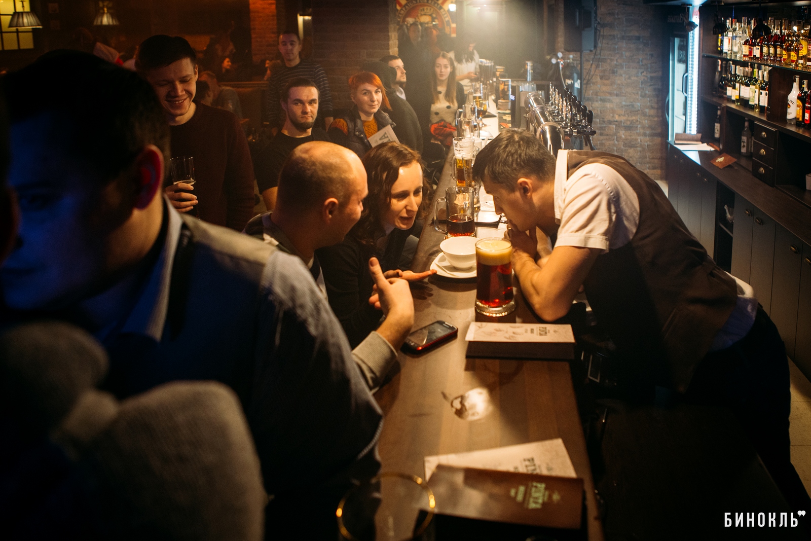 Над концепцией «Честной пинты» работала дизайн-студия «Bergh». Главный элемент любого паба — деревянная барная стойка. Возле неё разместились все, кому не хватило места за столиками, а таких в день открытия было много.