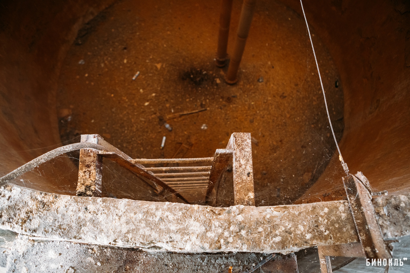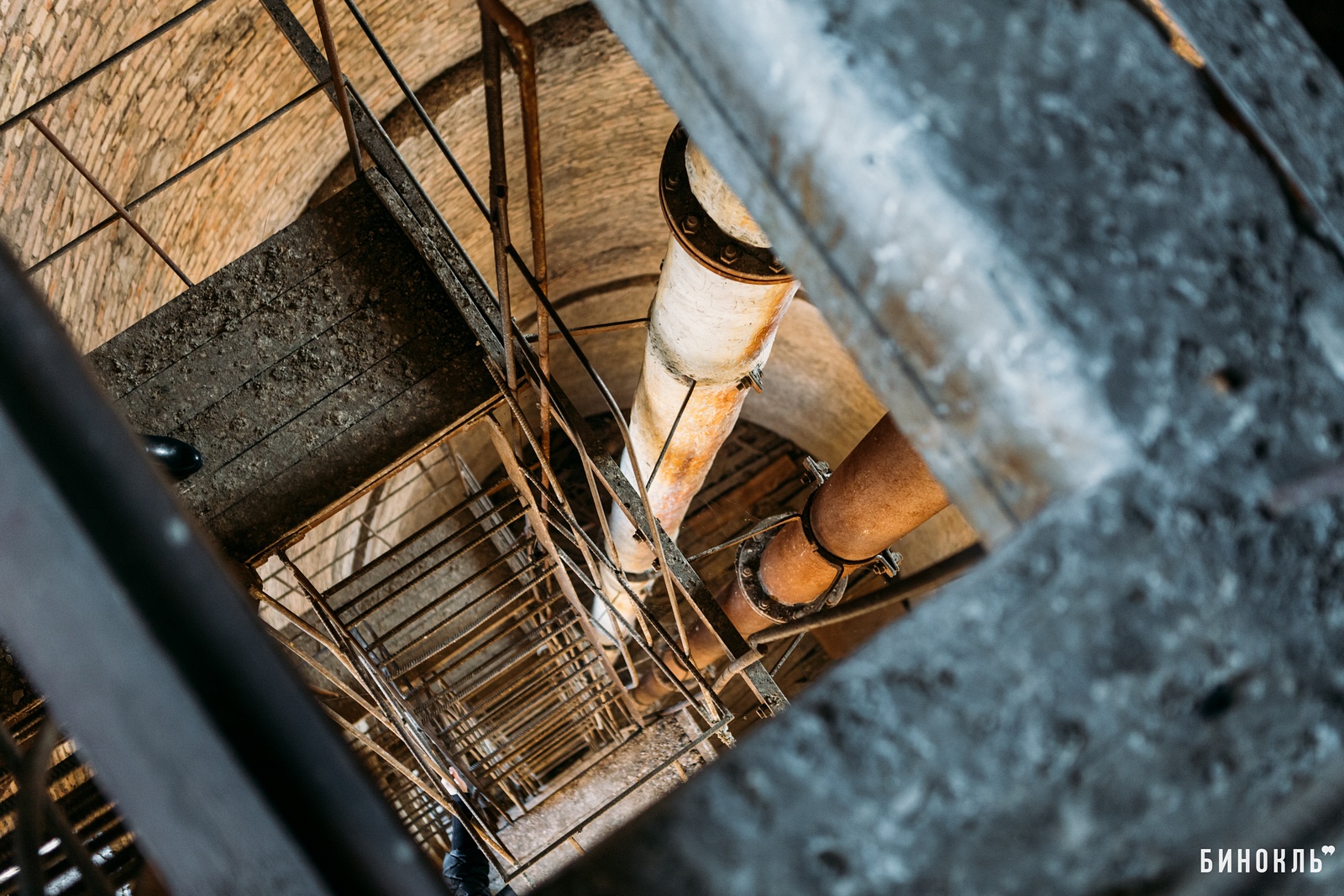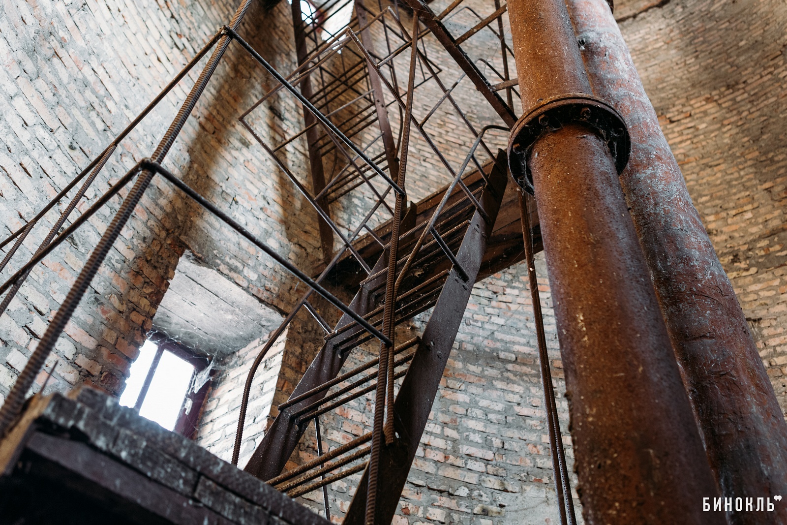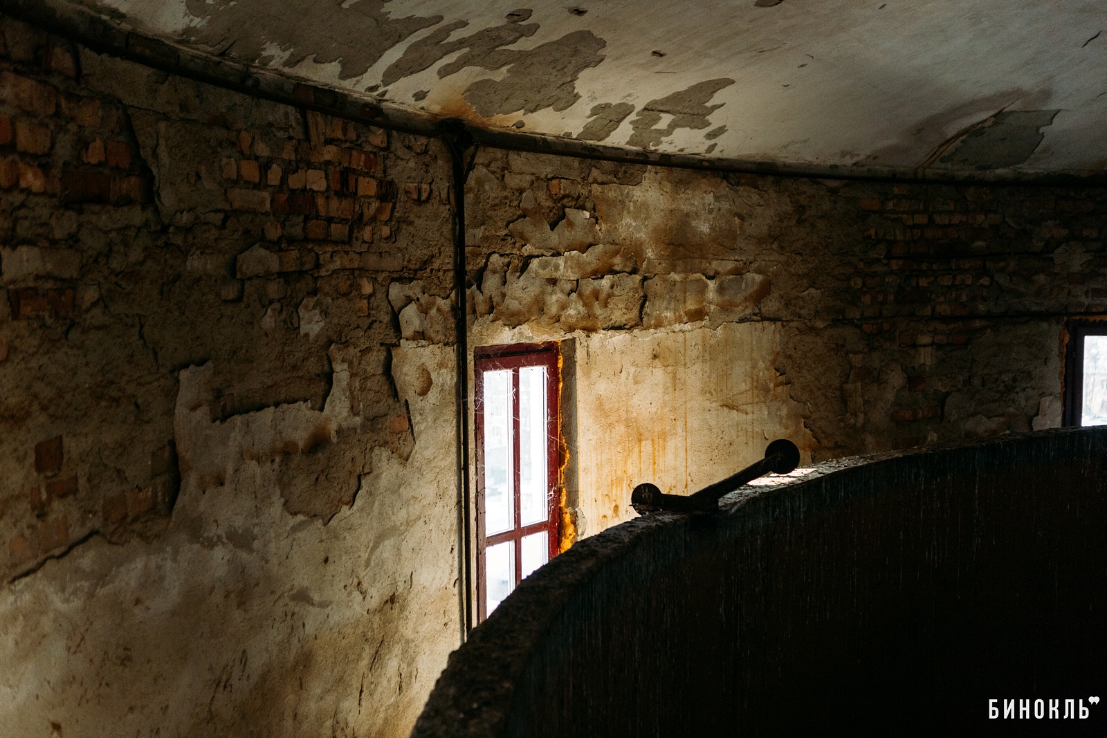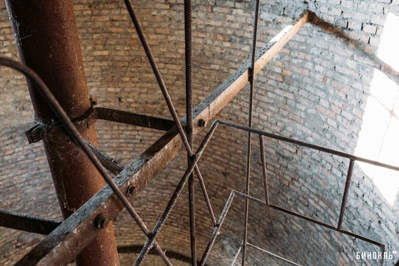 Пустое пространство башни, крутые лестницы из металлических прутьев — мы находимся в центре кирпичного цилиндра. Под резервуаром, который находится в верхней, широкой части башни, — цементный мостик, проходящий прямо под потолком.