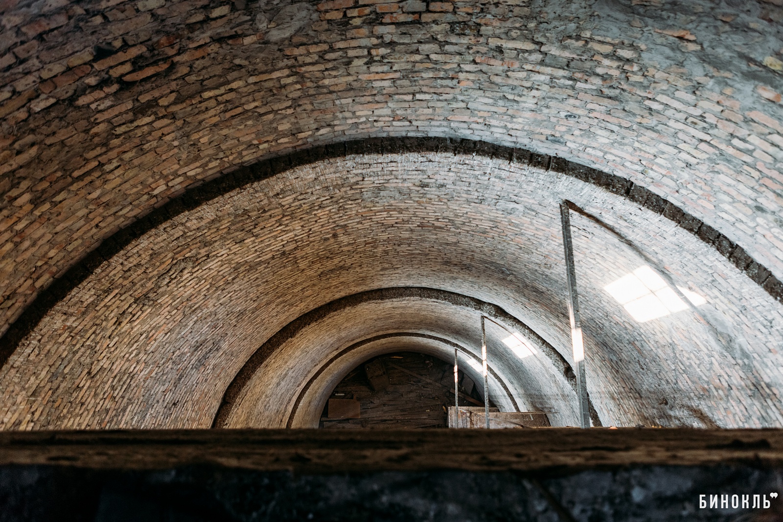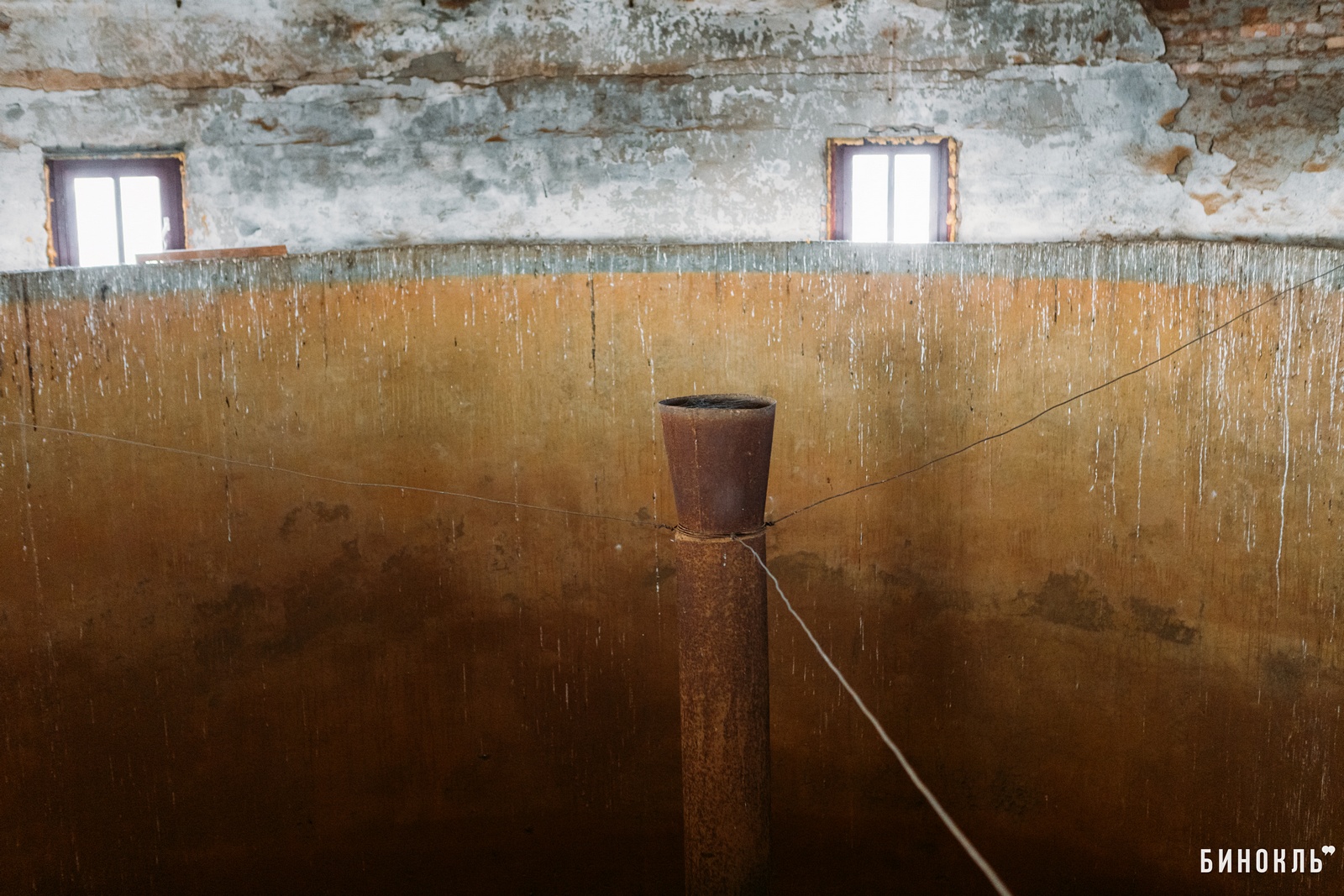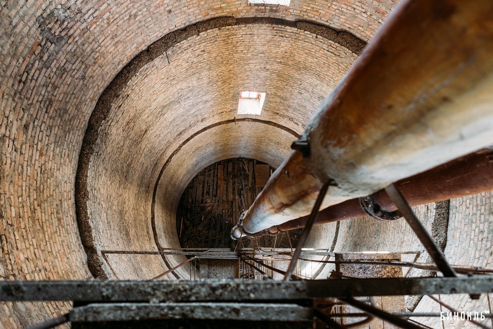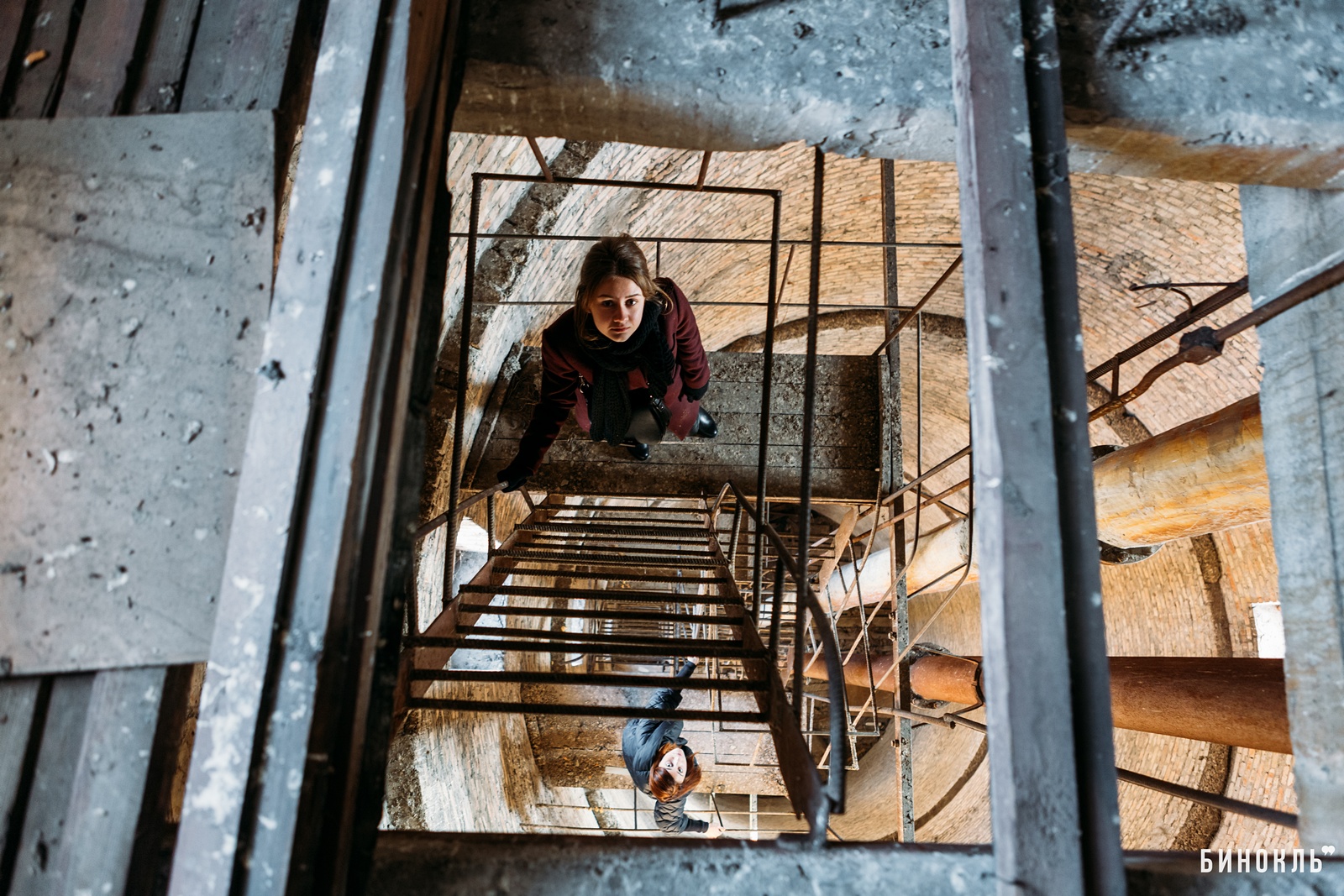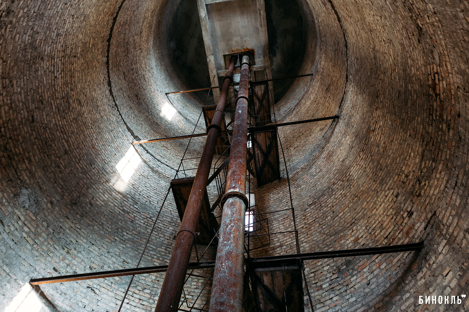 Пустое пространство башни, крутые лестницы из металлических прутьев — мы находимся в центре кирпичного цилиндра. Под резервуаром, который находится в верхней, широкой части башни, — цементный мостик, проходящий прямо под потолком.
