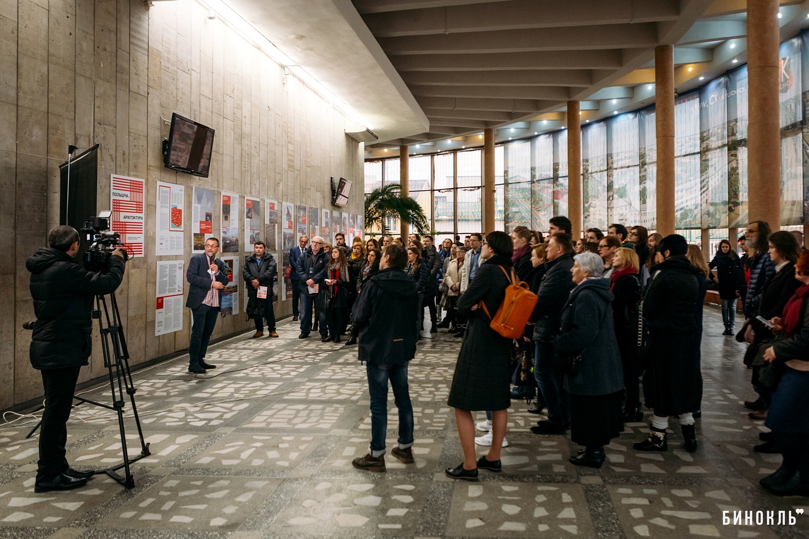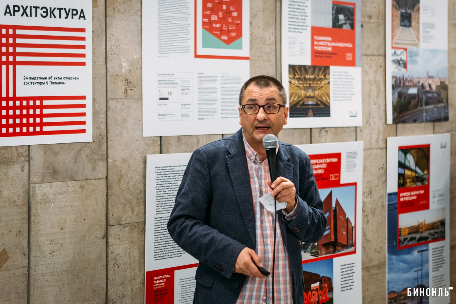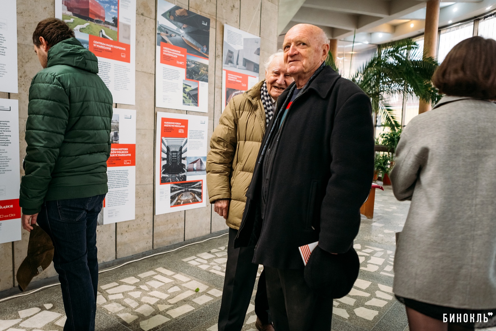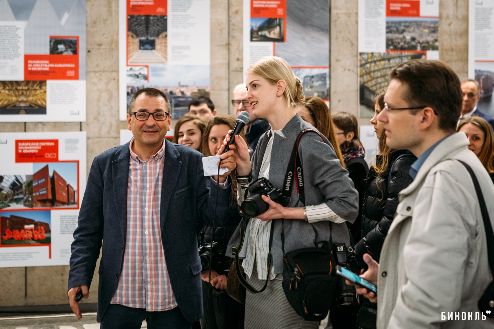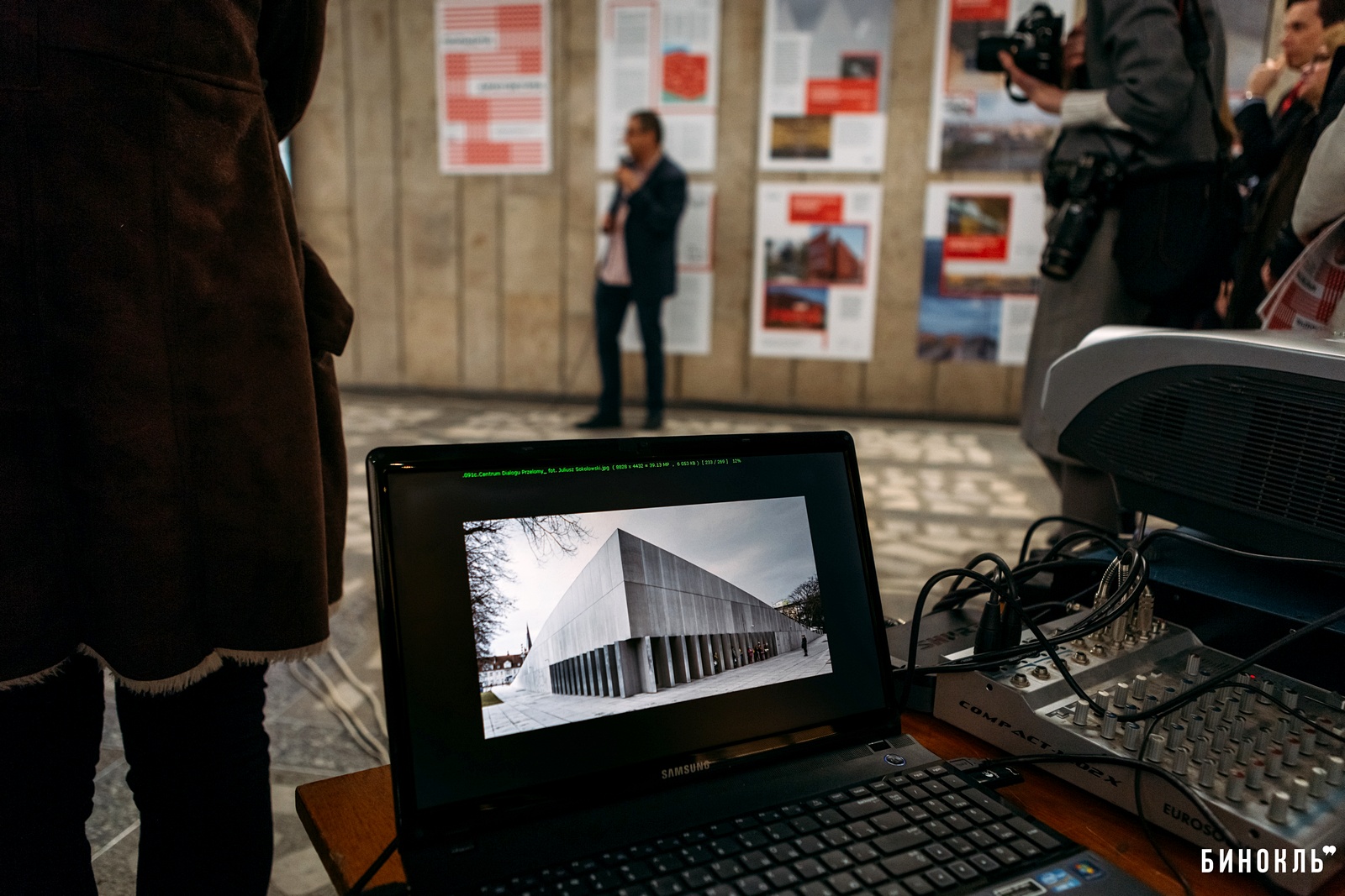 На вернисаже историк архитектуры Ежи Маевски подробно рассказал о представленных зданиях, проиллюстрировав основные мысли фотографиями, рисунками и эскизами.