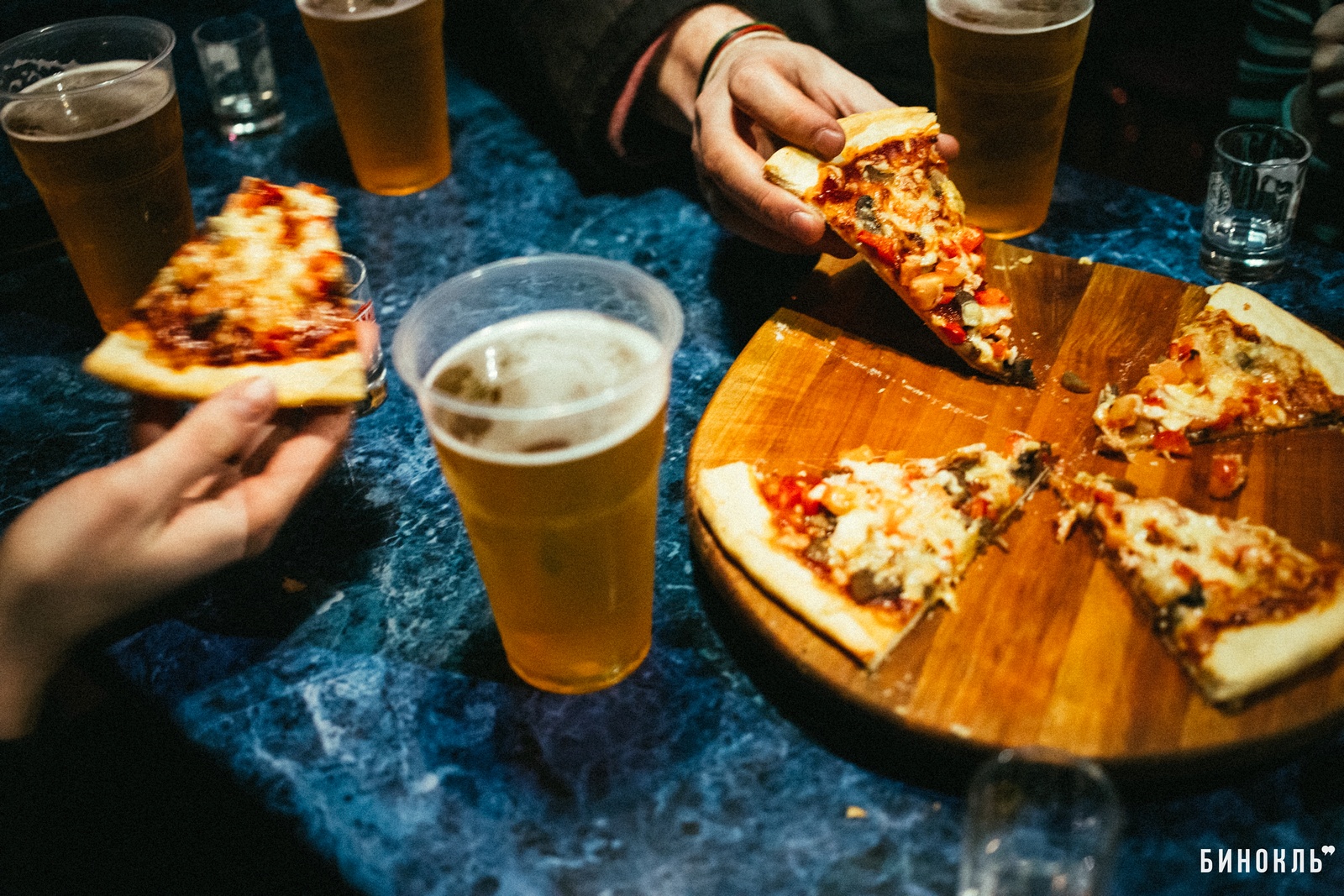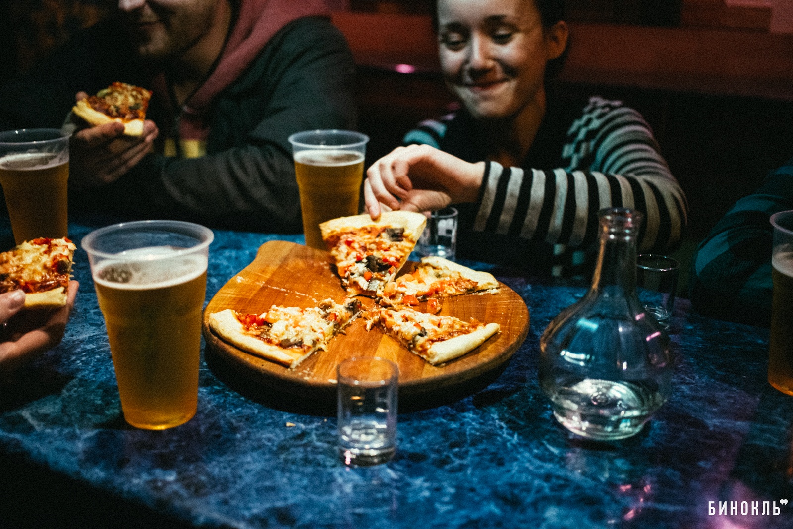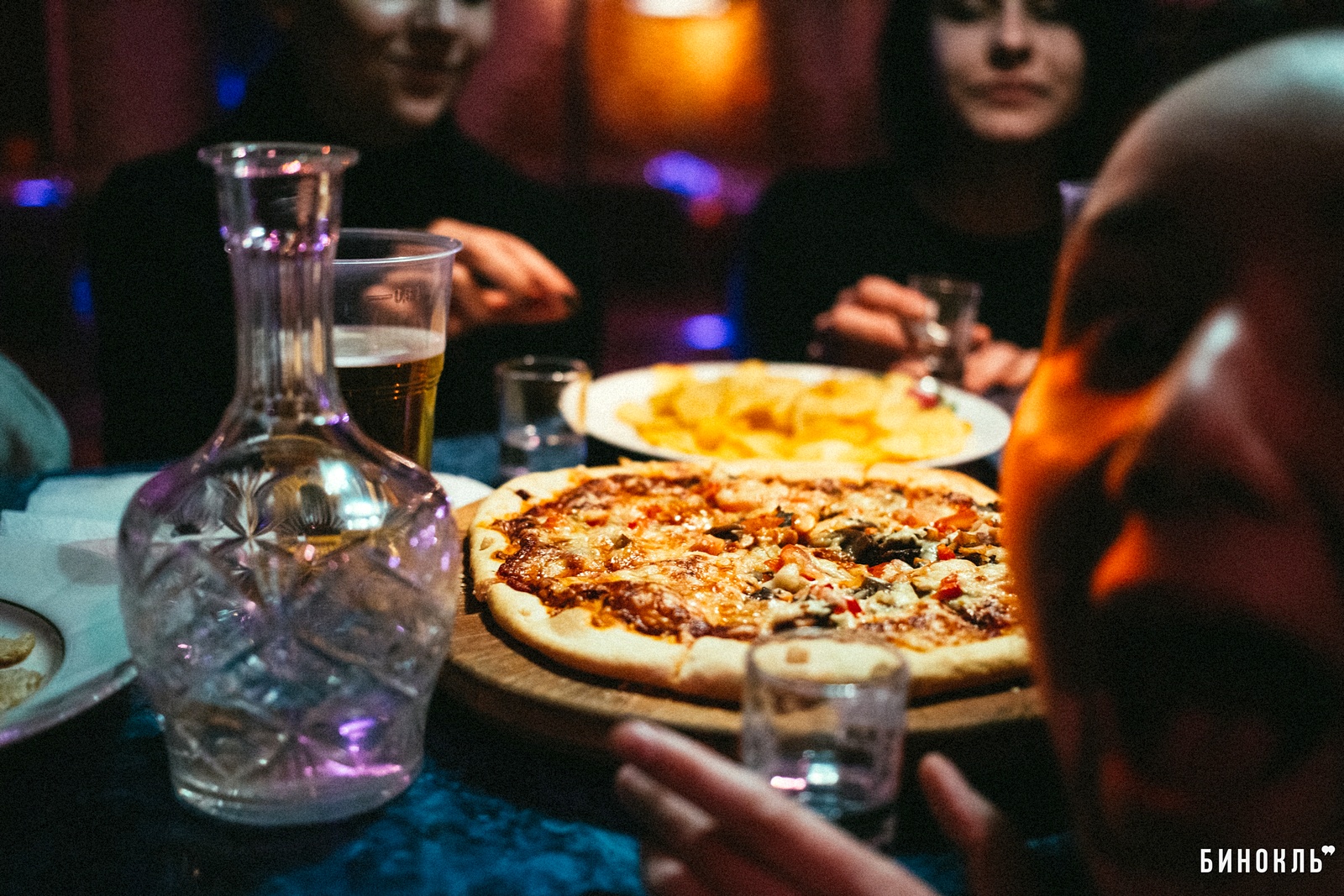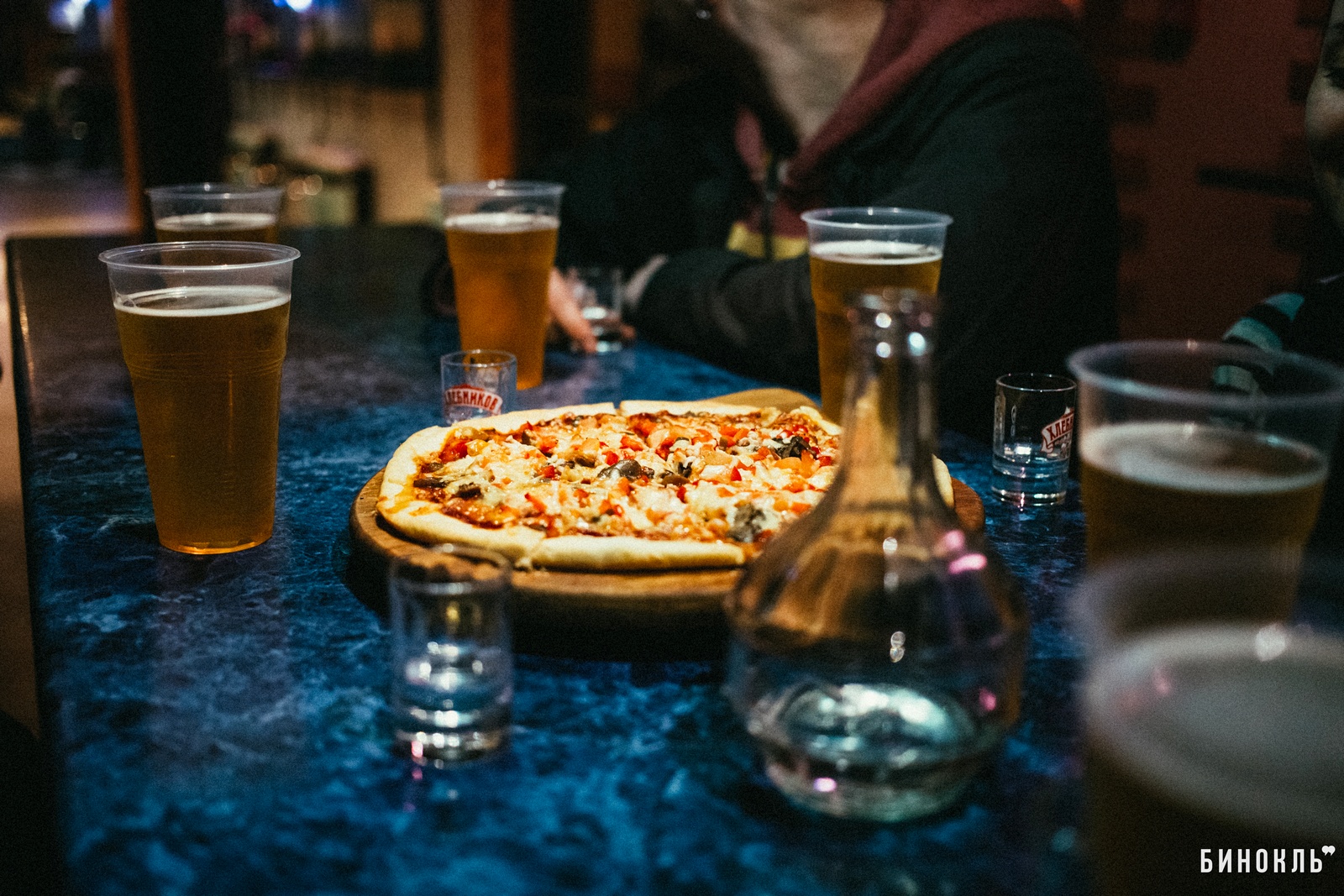 Пока пицца готовилась, мы решили заказать себе лёгкую закуску в виде сухариков, которые, к слову, висели над барной стойкой и были закреплены на нитке при помощи прищепок. Как только мы вооружились закуской и спиртным, последовал первый тост: “За милых дам!”. Всё как всегда и в лучших традициях: сначала водка, потом пиво. Отличный вариант и бюджет подходящий.