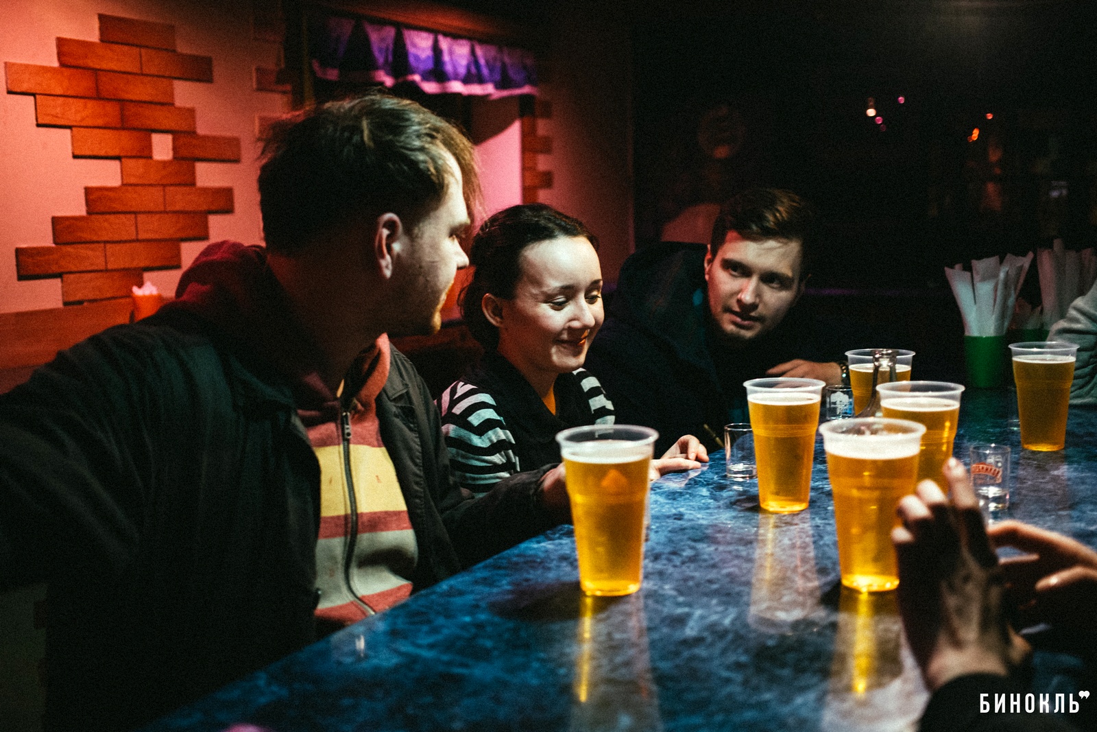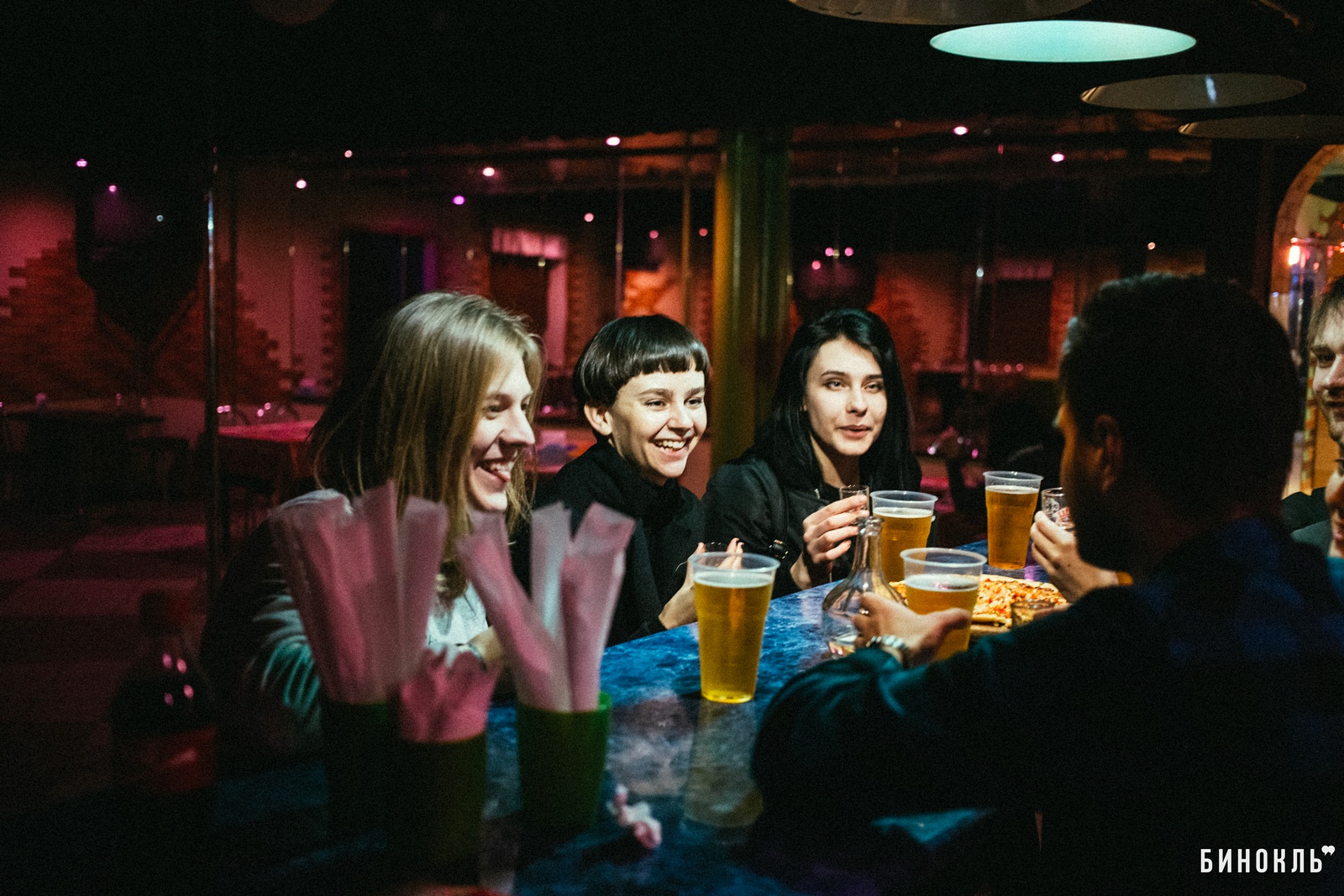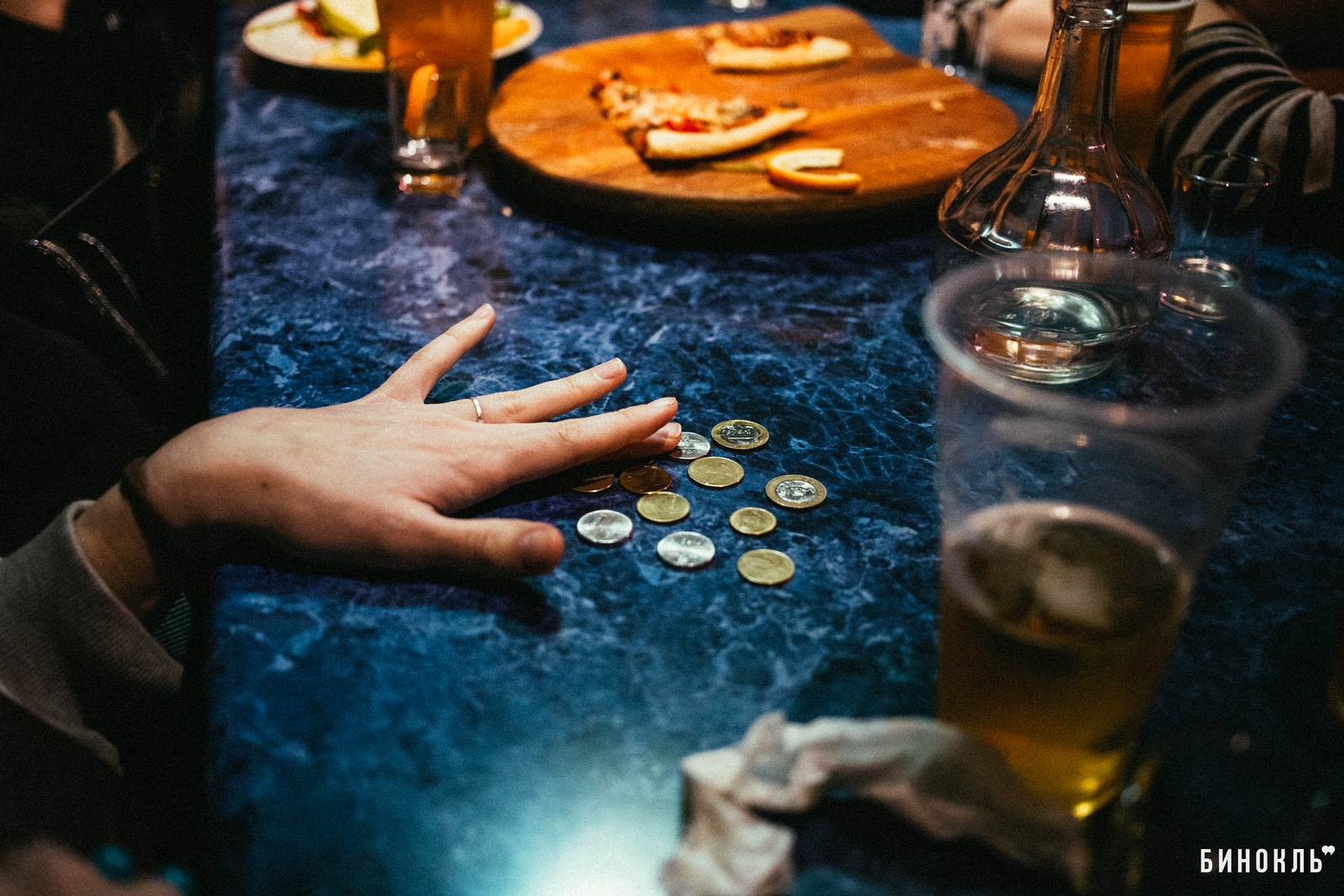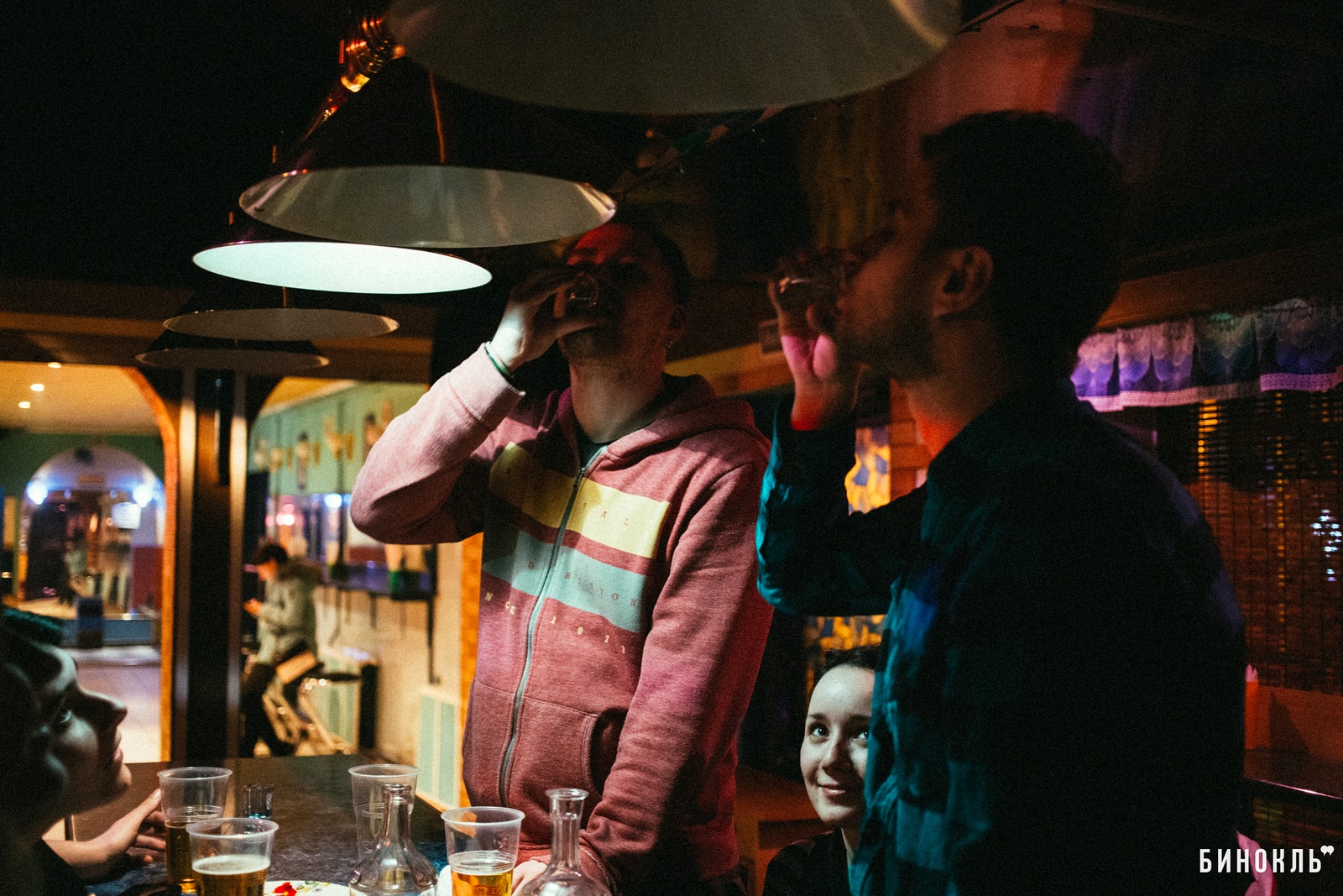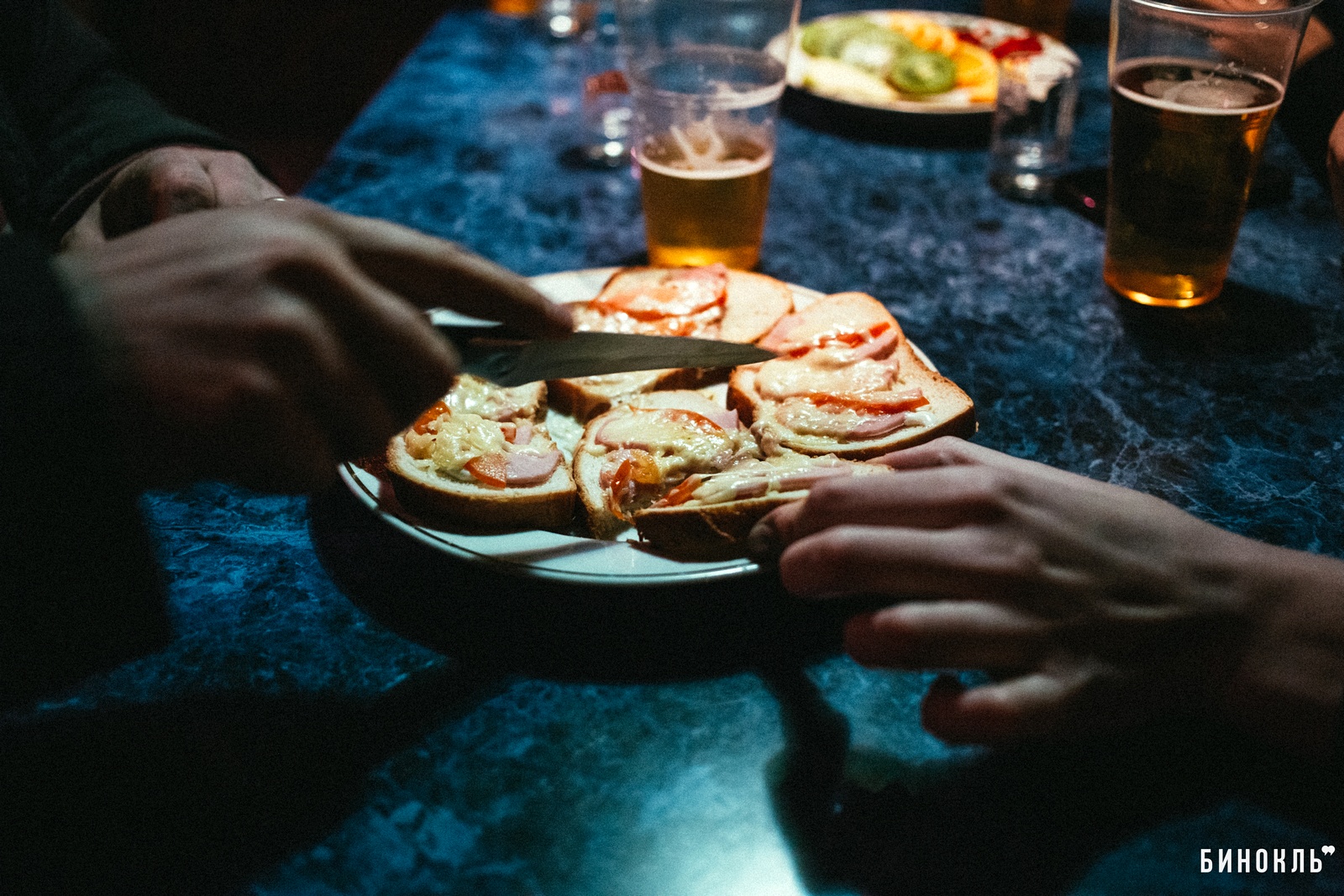 Пока пицца готовилась, мы решили заказать себе лёгкую закуску в виде сухариков, которые, к слову, висели над барной стойкой и были закреплены на нитке при помощи прищепок. Как только мы вооружились закуской и спиртным, последовал первый тост: “За милых дам!”. Всё как всегда и в лучших традициях: сначала водка, потом пиво. Отличный вариант и бюджет подходящий.