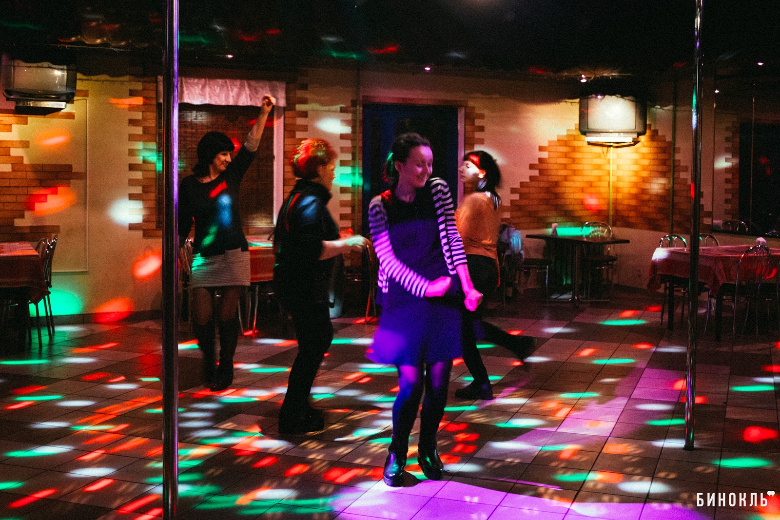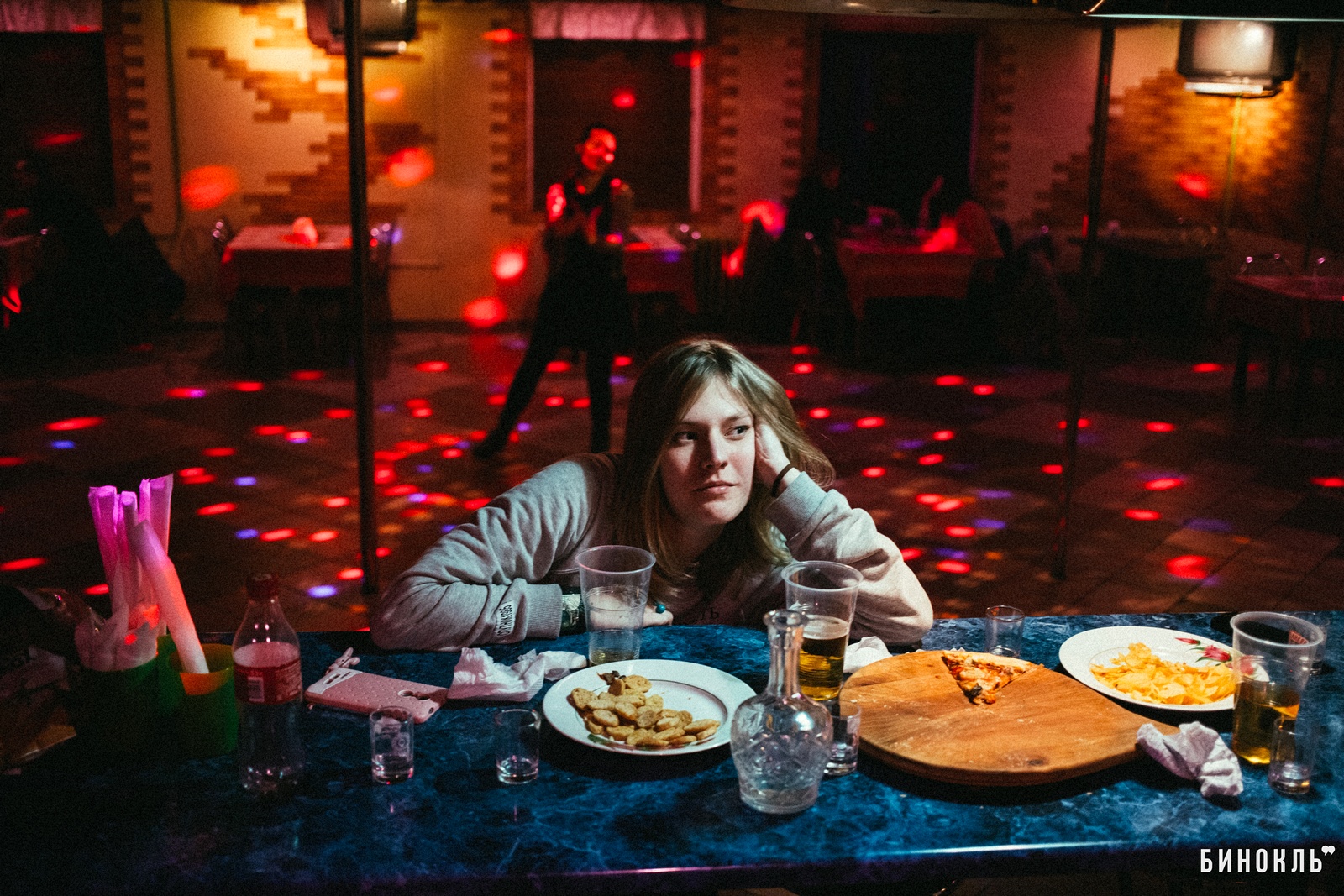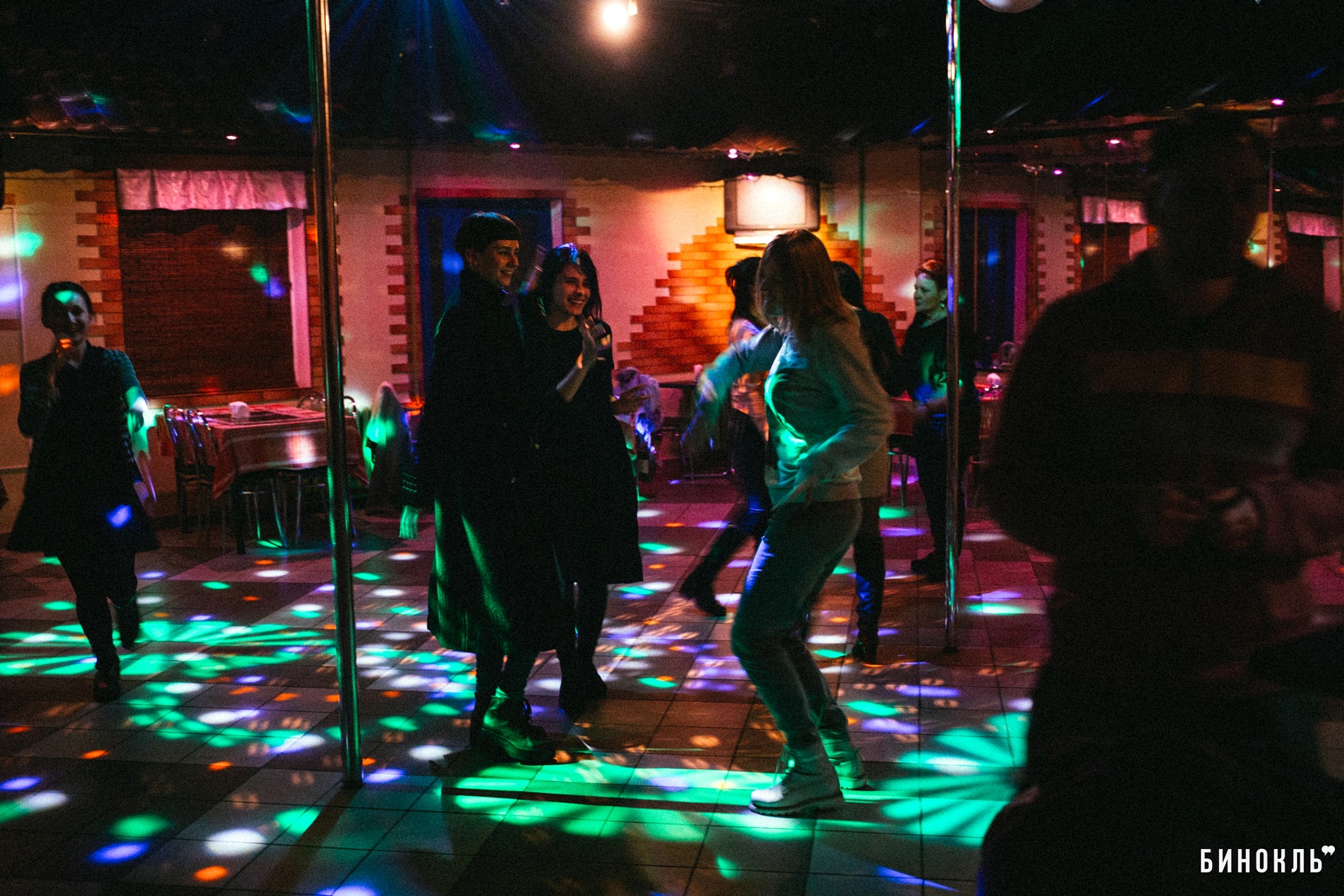 К этому времени нам принесли пиццу и бутерброды, а в качестве десерта фруктовую нарезку. Алкоголь таял так же быстро, как снег под ливнем, и нужно было что-то делать. И вот здесь мы взяли грех на душу и достали пиво, принесённое с собой. Да, мы плохие люди, но на дворе дождь и кризис, а продолжения праздника уж очень хотелось.И он наступил в полной мере, когда заиграла Sia. Под неё в пляс пустилась вся наша компания, женщины и тот самый одинокий мужчина, отчаянно пытавшийся найти себе друзей на вечер. Пилоны, конечно же, не остались без внимания, и вокруг них даже были исполнены своего рода танцы, пусть слегка неловкие и неумелые.