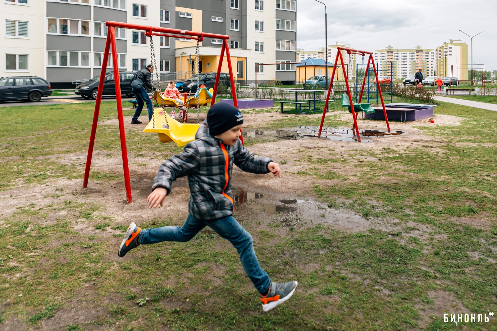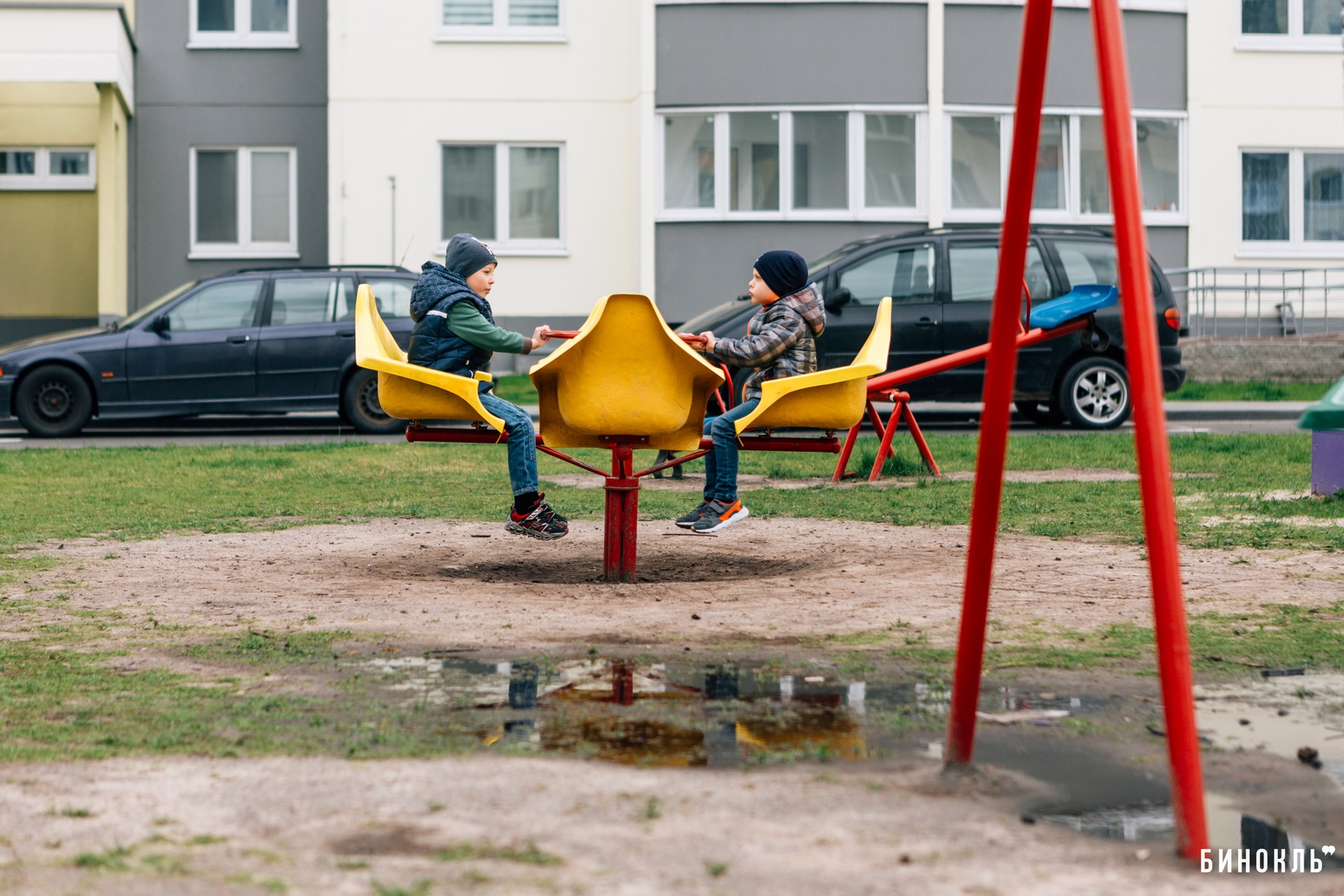Антон: Этот двор cтал нашей отправной точкой для создания своей детской площадки. Здесь находится самая современная серия домов, которая есть в городе. Та детская площадка, которую мы видим – это тот максимум, который сейчас есть в Бресте. Когда мы пришли во двор, то увидели, что ничего со времен нашего детства в площадках не поменялось – они лишь заиграли новыми красками.