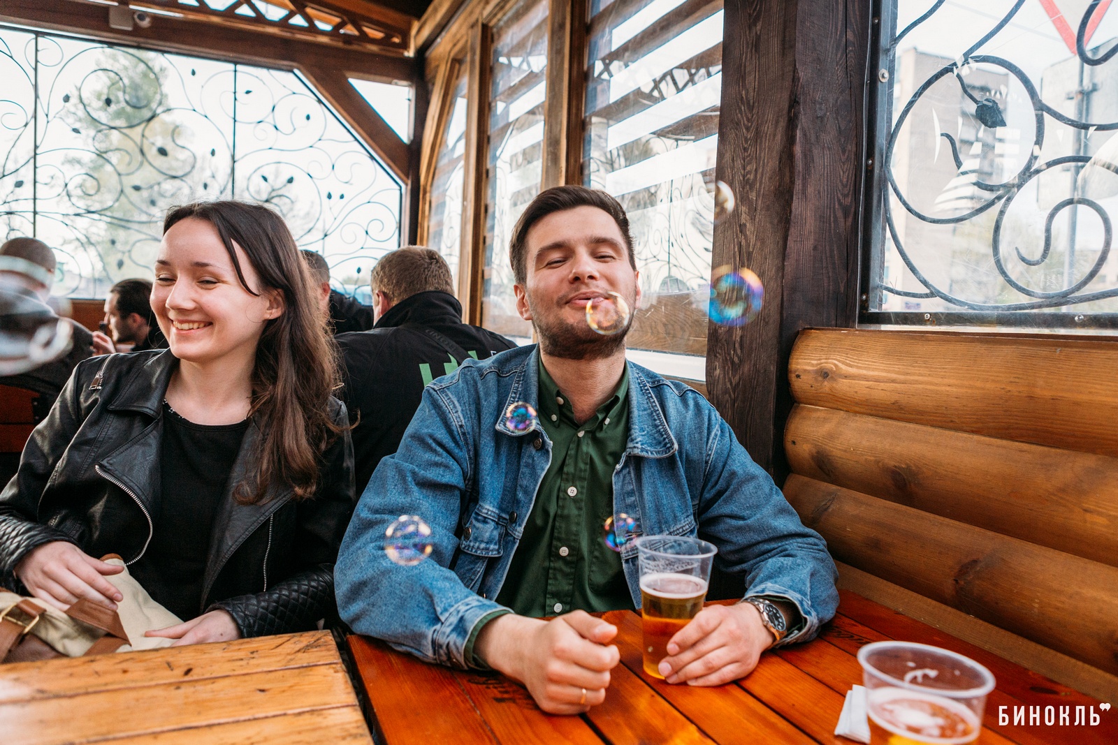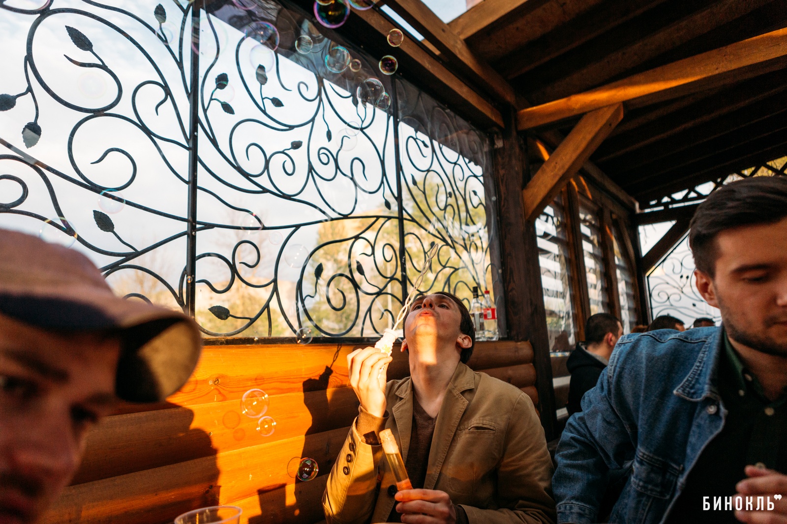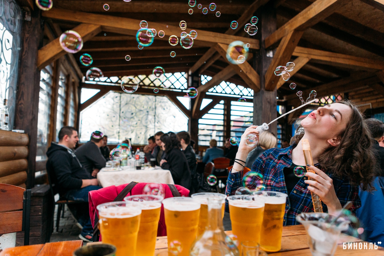 Когда мы с Димой завершали по второму бокалу прекрасного пенного напитка, в кафе нагрянула часть редакции Бинокля” . Душа требовала праздника, праздник – повода, а редакция – пищи. Ребята привезли с собой мыльные пузыри, запуск которых не понравился нашим хмурым соседям.