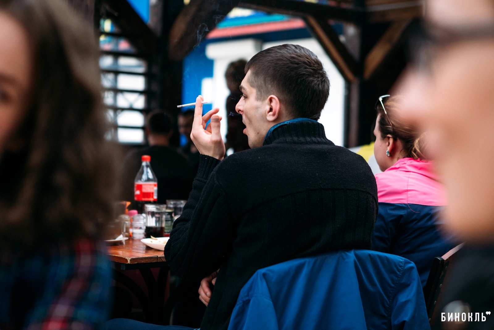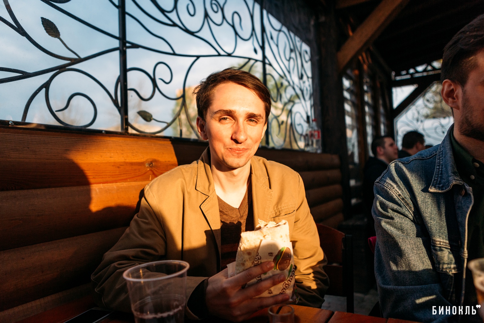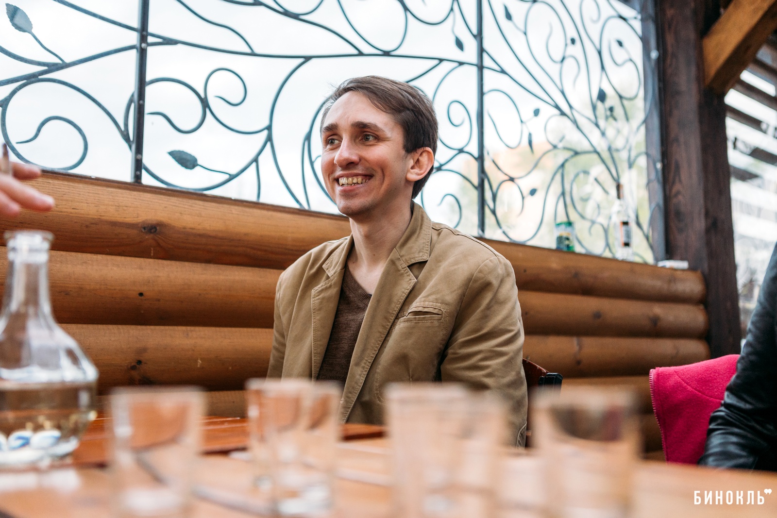 Пока мы потягивали пиво, наш собеседник отметился в твиттере о своём нахождении с командой Бинокля” в «Ё-моё». Комментарии не заставили себя долго ждать. Поступали как иронично-подозревающие: «Теперь понятно, почему ты их постоянно реплаишь», так и сопереживающие: «Публика там не самая доброжелательная, отписывайся каждые полчаса, что там происходит».