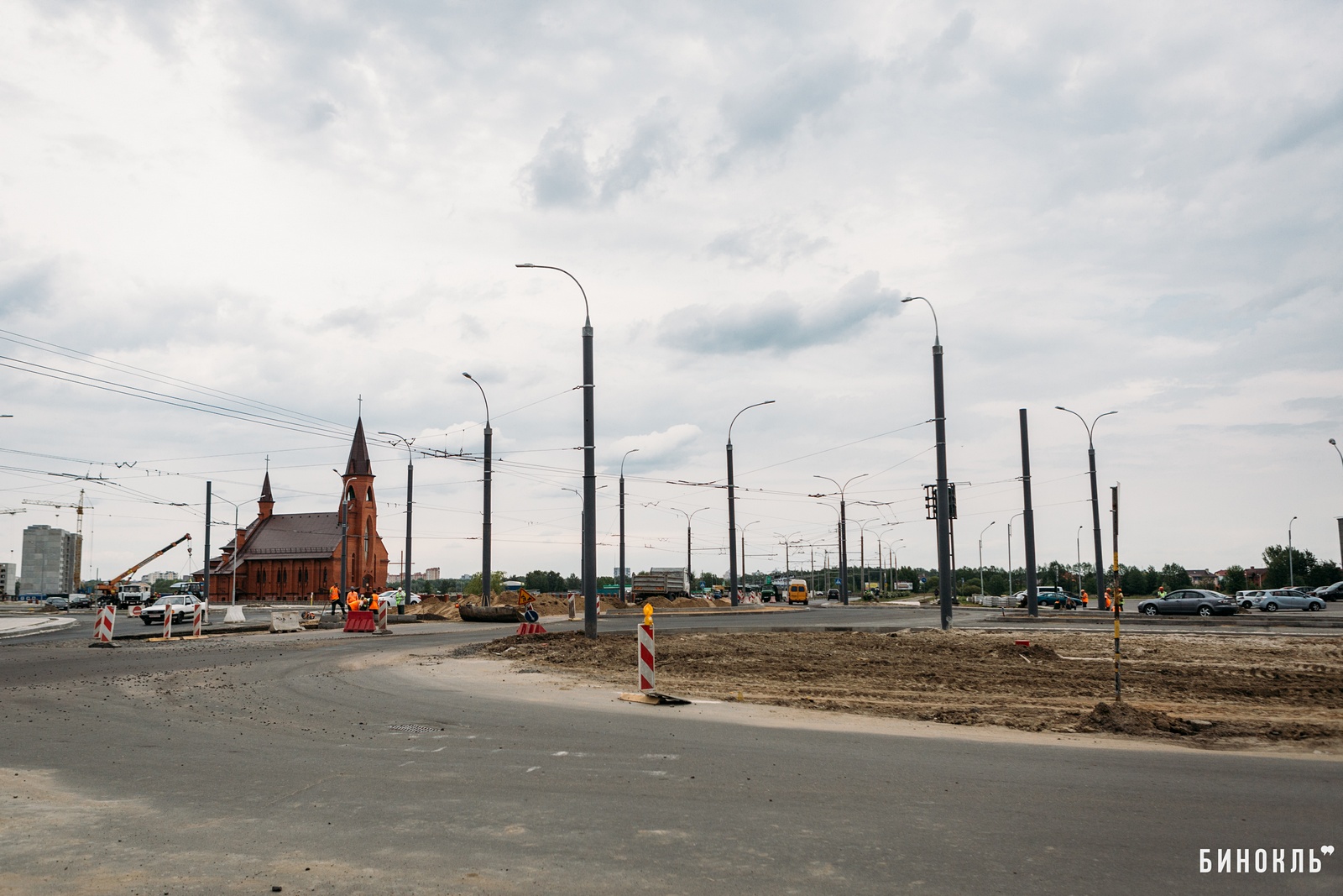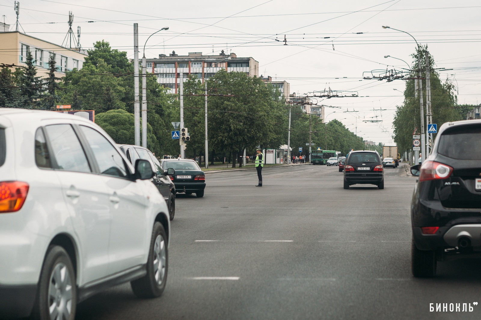 Подъезжаем к новому кольцу на улице Журавецкой. Наш собеседник делится предположениями о том, что хоть оно и не достроено, но уже видно, что здесь будут аварии. Вокруг стоят заборы, и у водителей будет плохой обзор. На проспекте Республики мы замечаем большое скопление сотрудников ГАИ – идёт обучение регулировщиков.