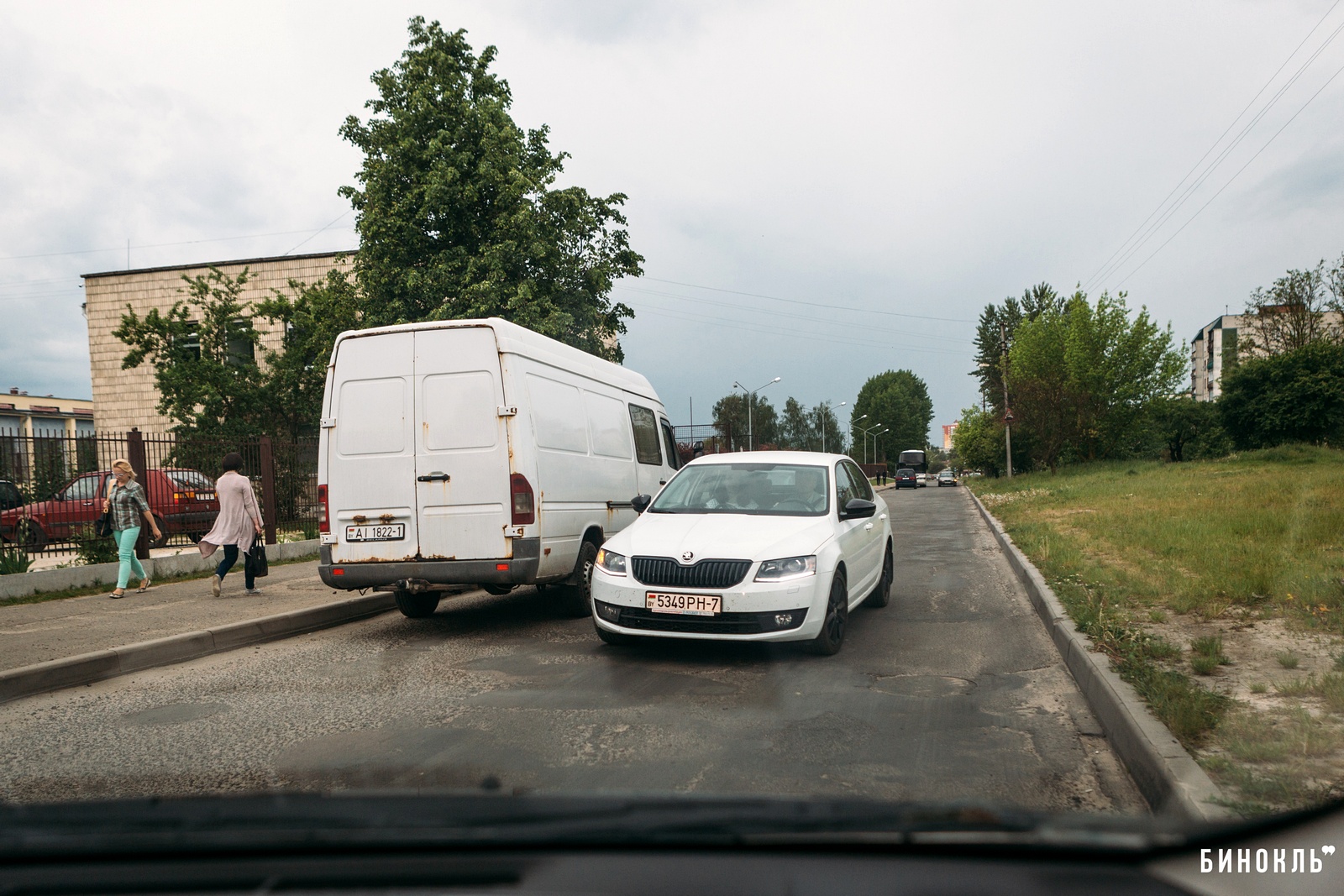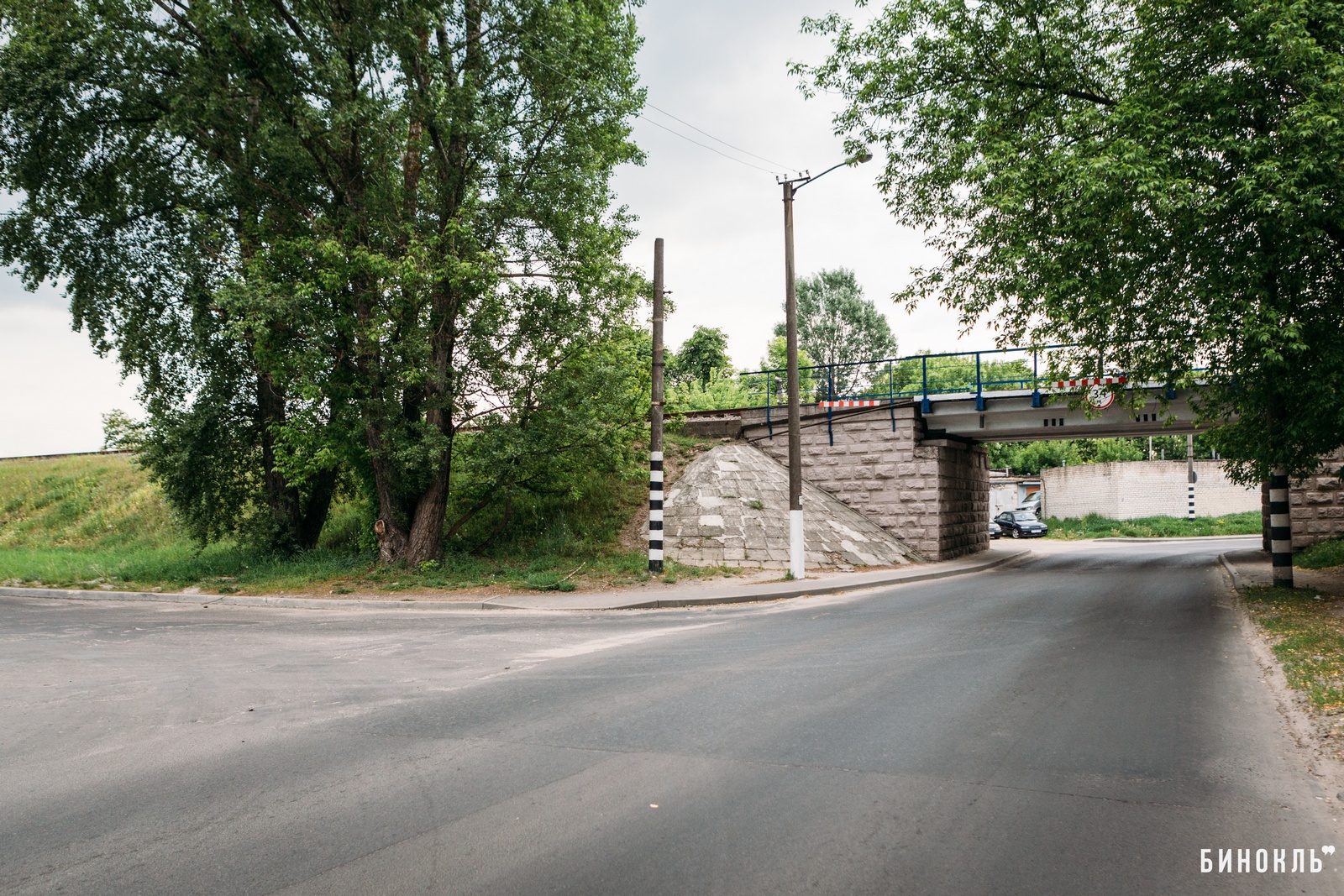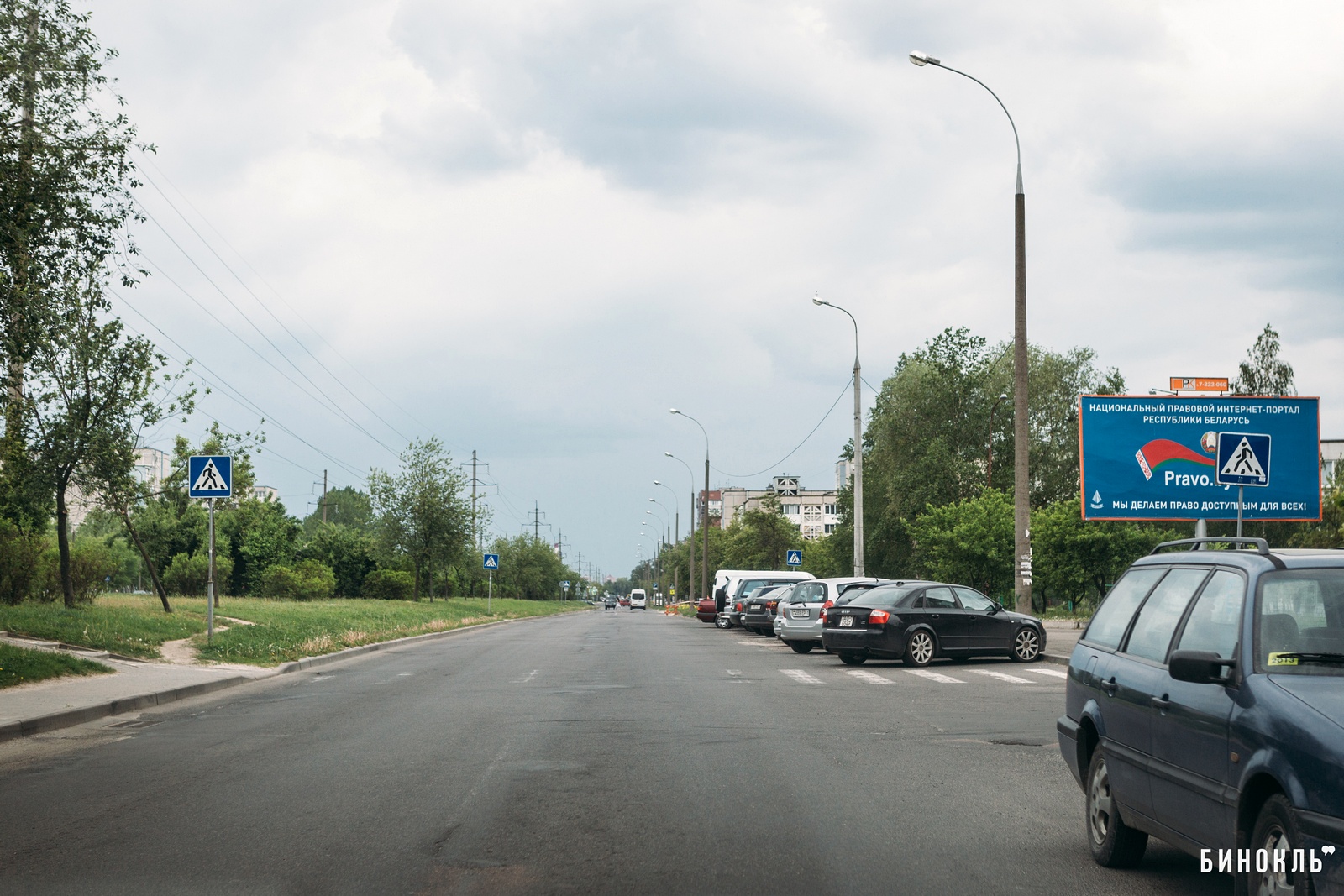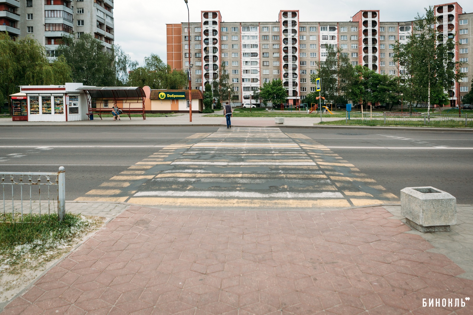 Мы выезжаем на Янки Купалы, где идёт ремонт дороги. Наш собеседник замечает, что при строительстве обделили велосипедистов, не сделав им дорожек. Александр сворачивает в сторону автопарка и показывает нам один из самых бессмысленных пешеходных переходов, на его взгляд. Ведёт он из одного забора в другой.