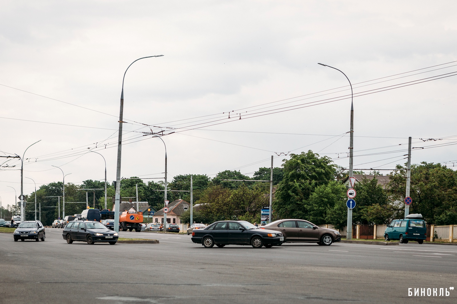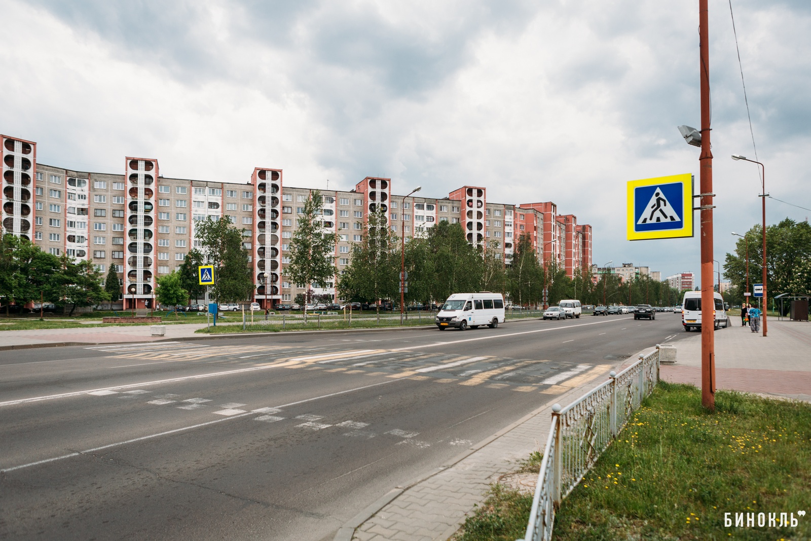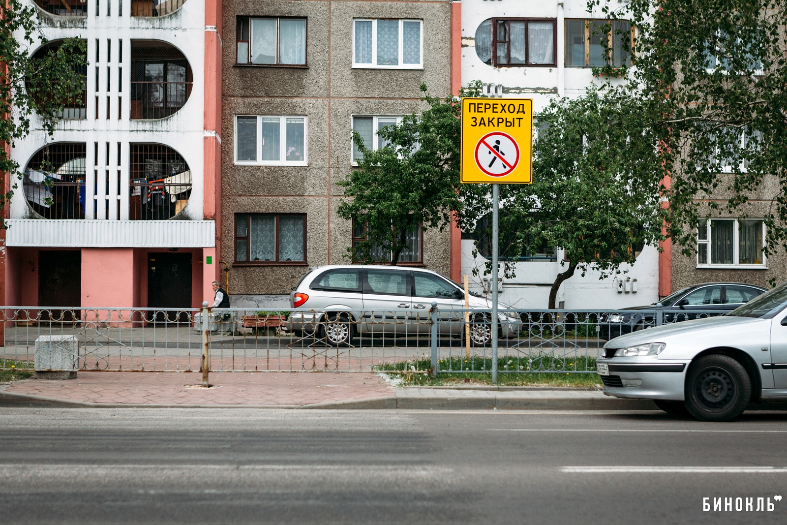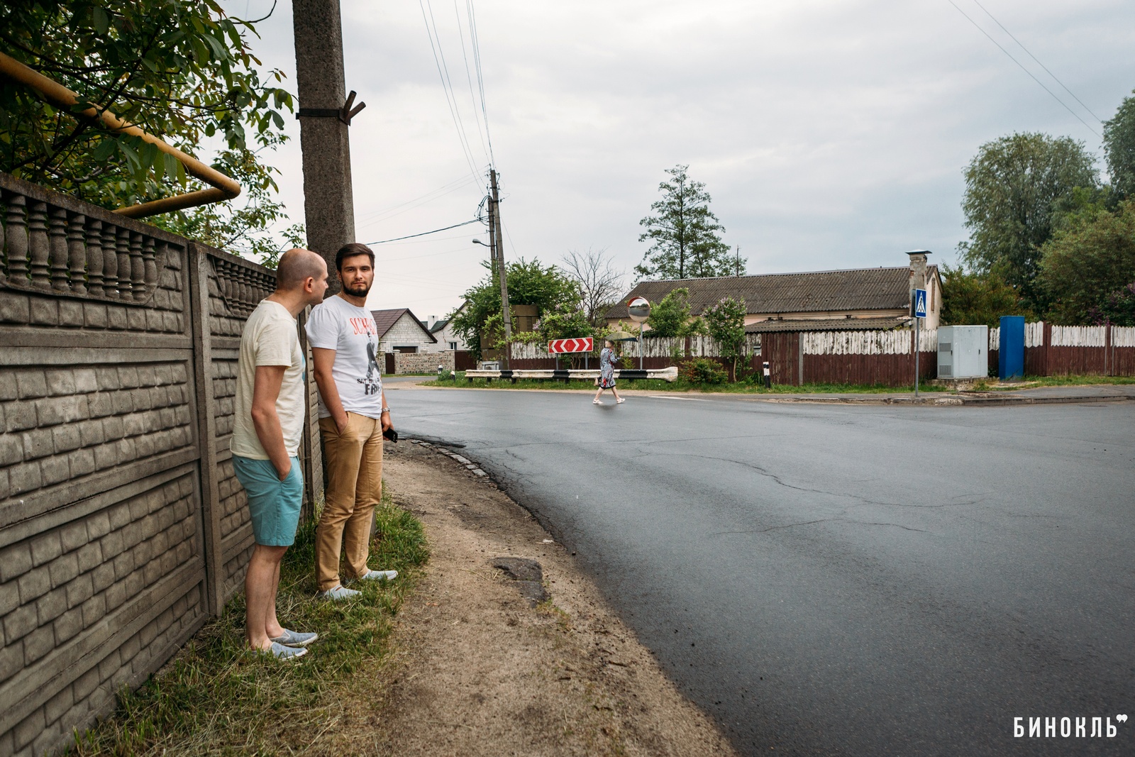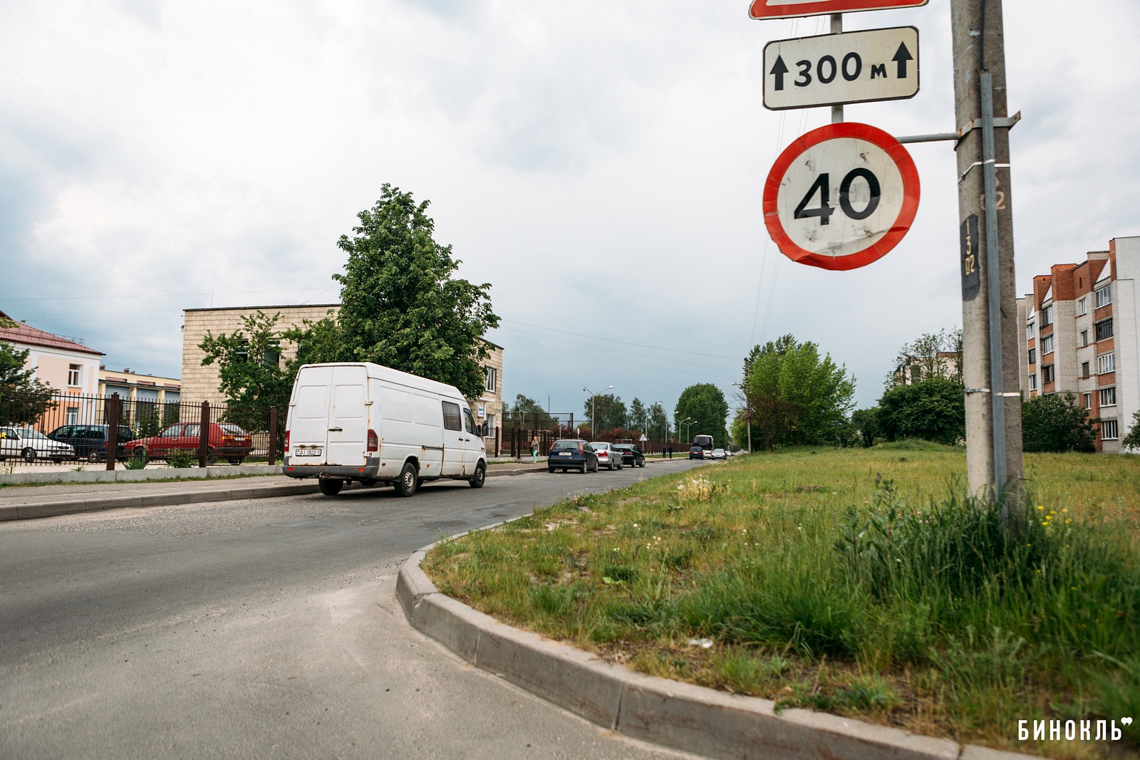 Мы выезжаем на Янки Купалы, где идёт ремонт дороги. Наш собеседник замечает, что при строительстве обделили велосипедистов, не сделав им дорожек. Александр сворачивает в сторону автопарка и показывает нам один из самых бессмысленных пешеходных переходов, на его взгляд. Ведёт он из одного забора в другой.