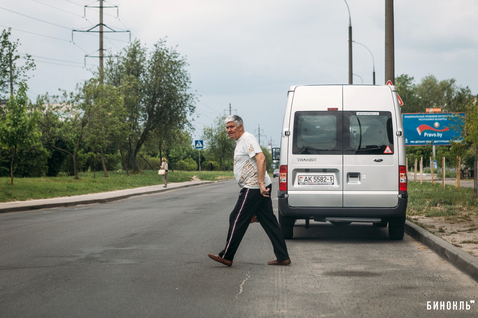 Пока мы обсуждаем ситуацию с пешеходным переходом, Александр замечает пожилого мужчину, выглядывающего из-за фургона. Он переходит дорогу вне пешеходного перехода, чем создаёт дополнительную опасность для своей жизни.