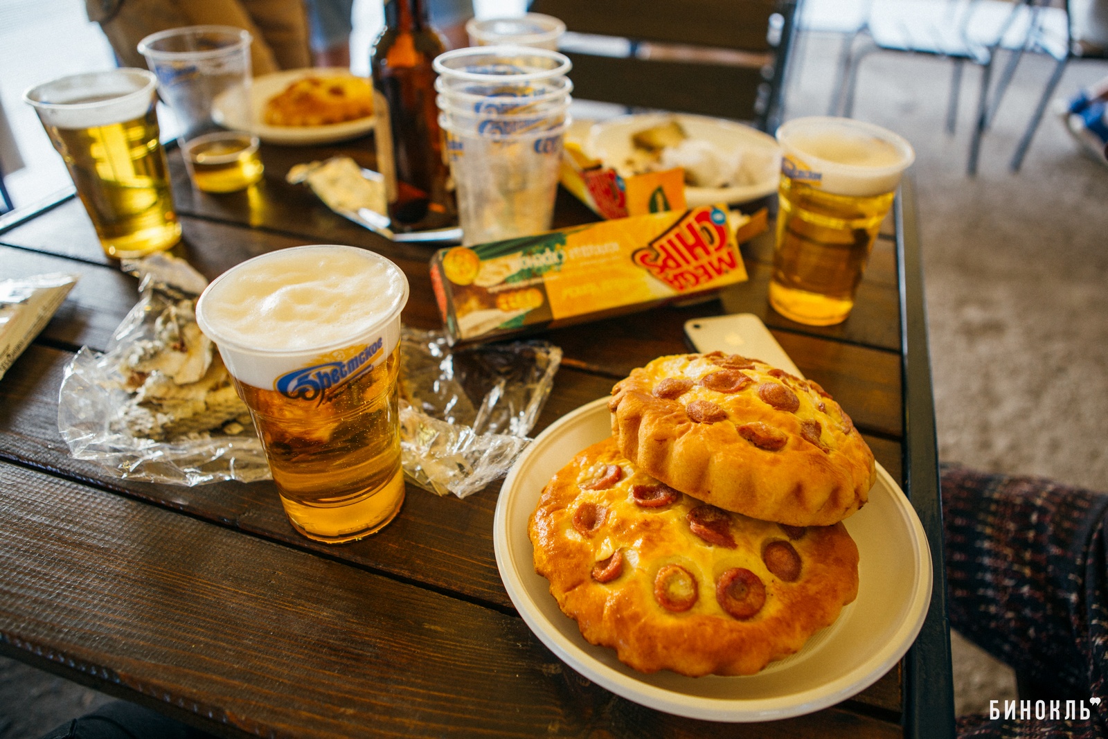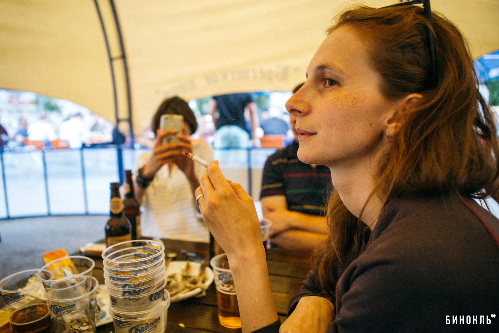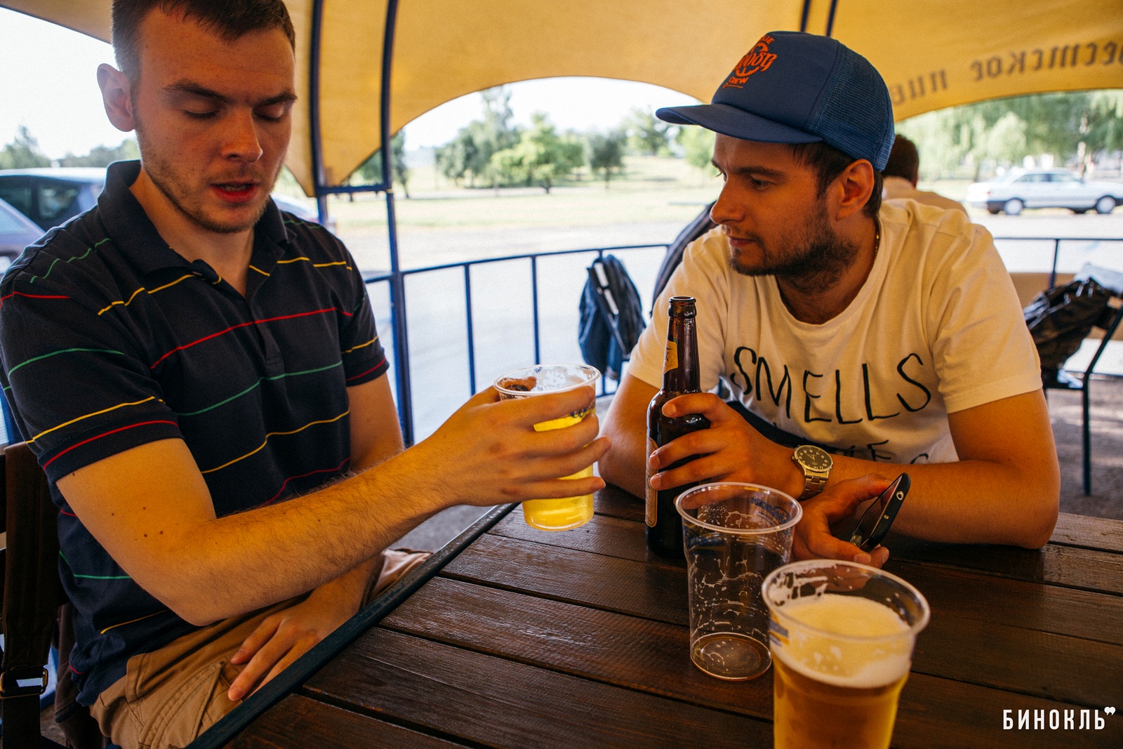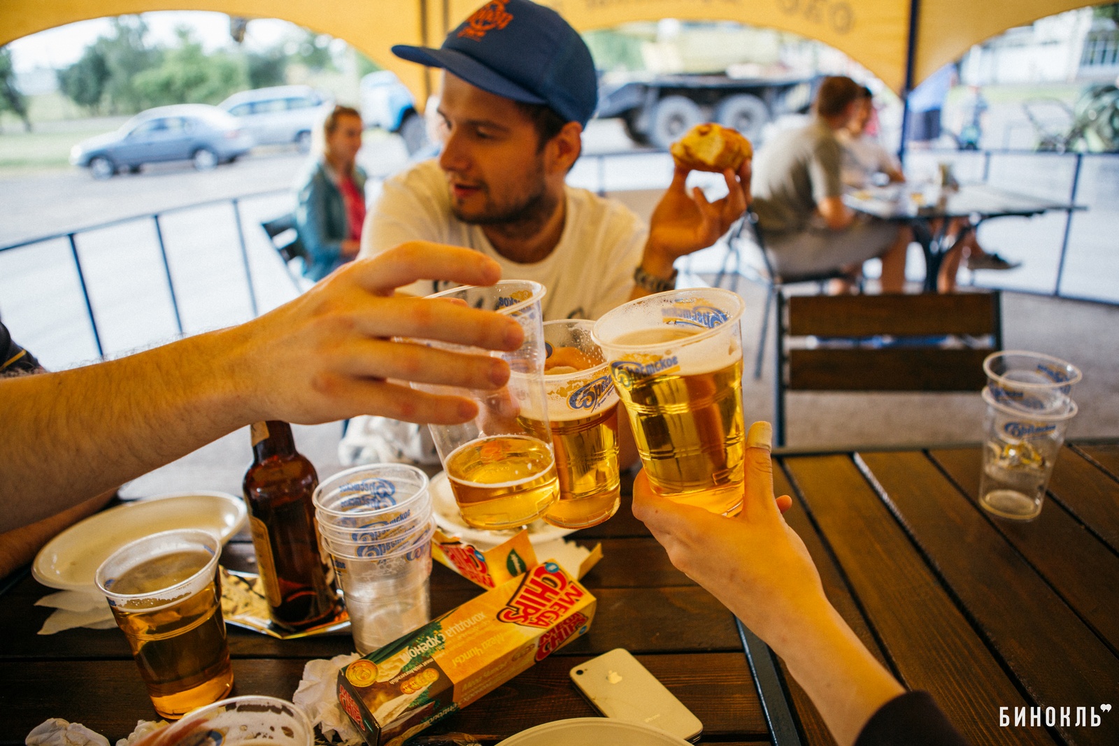 На часах было 18:30, а очередь за разливным напитком организовалась знатная. Бросив все свои вещи и участника нашей боевой команды в качестве сторожа, мы пошли делать заказ. За время нахождения в очереди можно было бы успеть прослушать лекцию Лотмана о возникновении культурной прослойки, настолько медленно двигалась колонна из людей. Виноваты были не женщины-бармены, а пена брестского жигулевского, густоте которой позавидовали бы йогурты с нулевым процентом жирности. Когда очередь дошла до нас, мы сделали свой первый заказ на этот вечер: