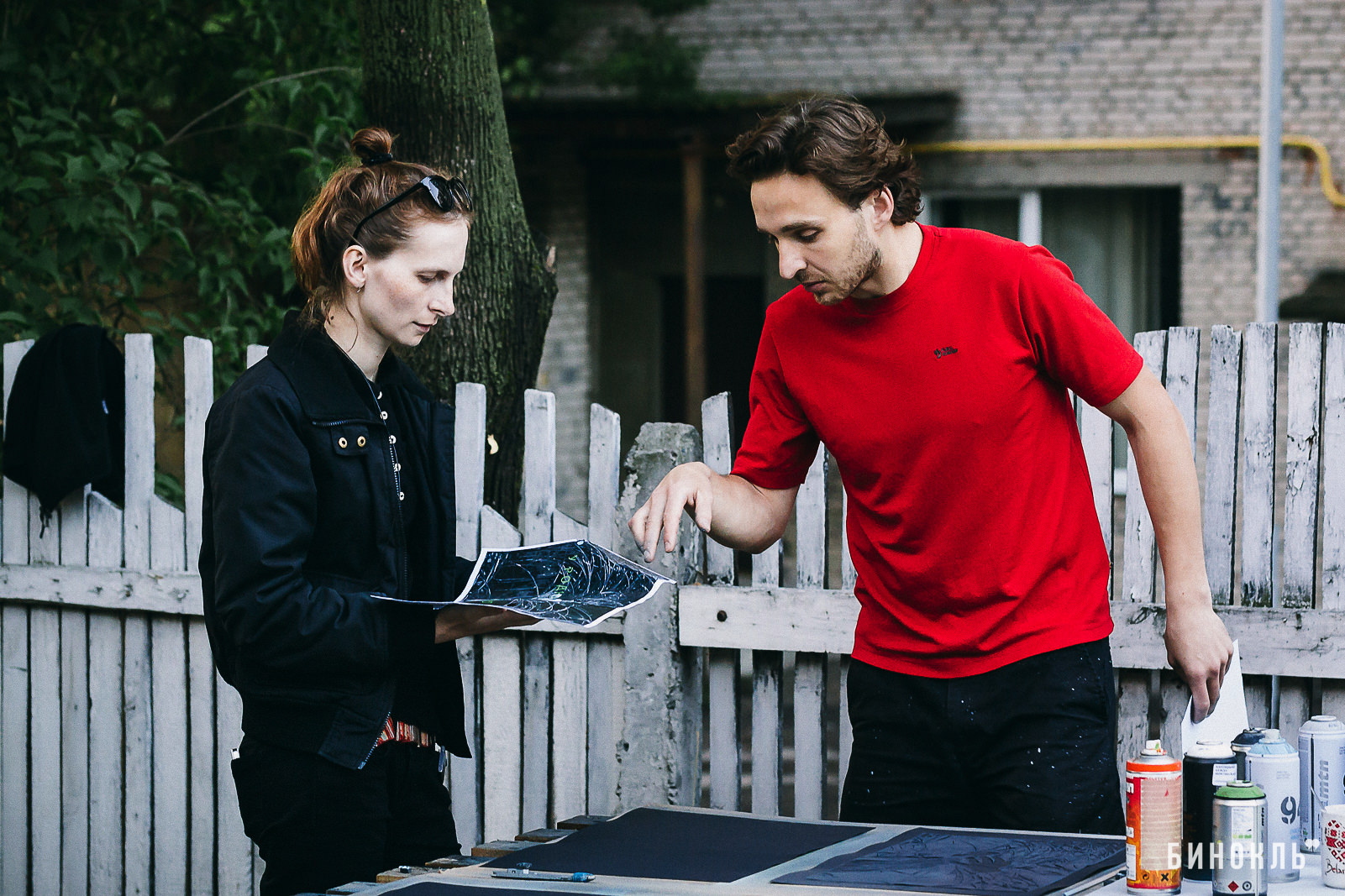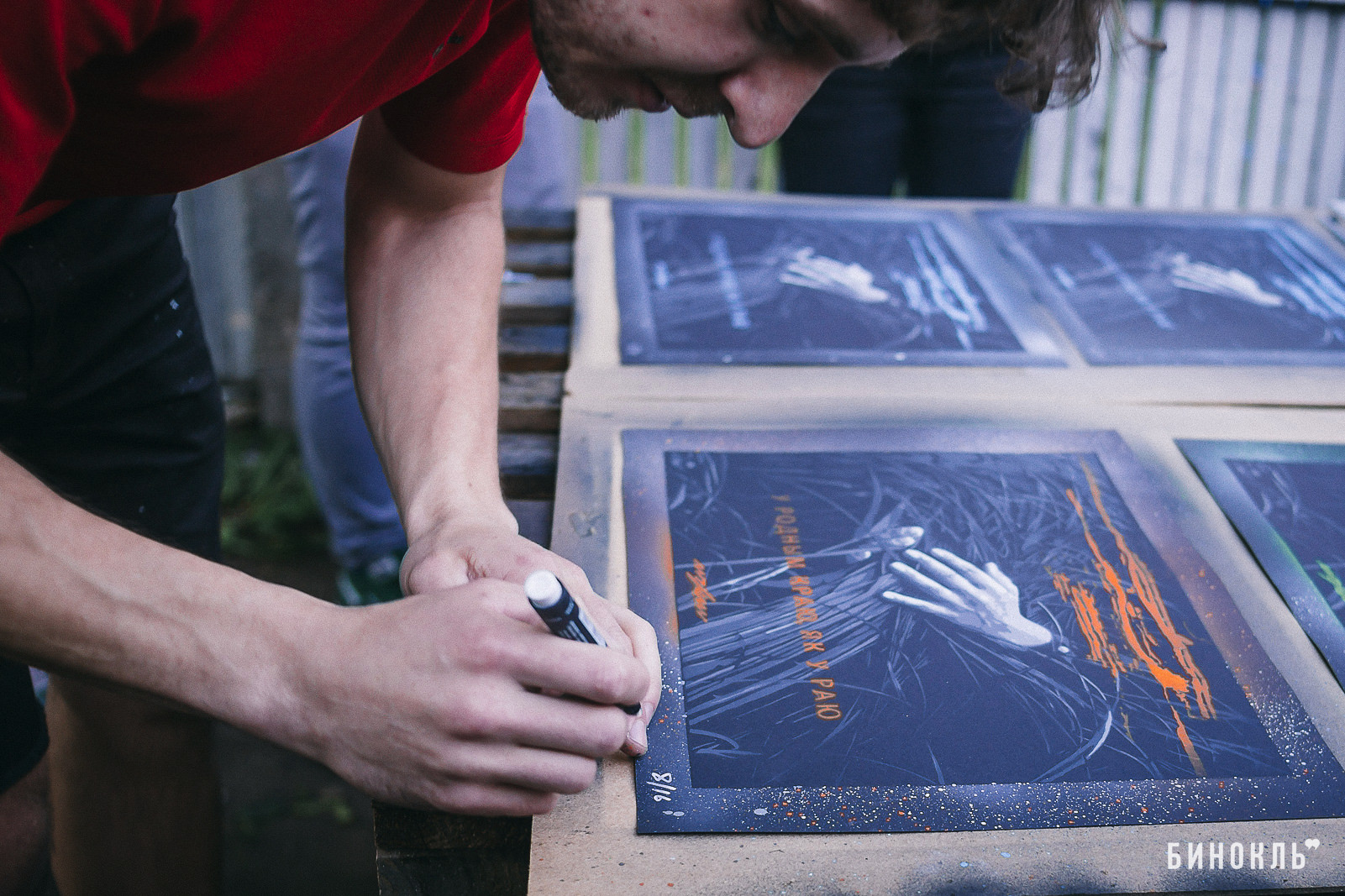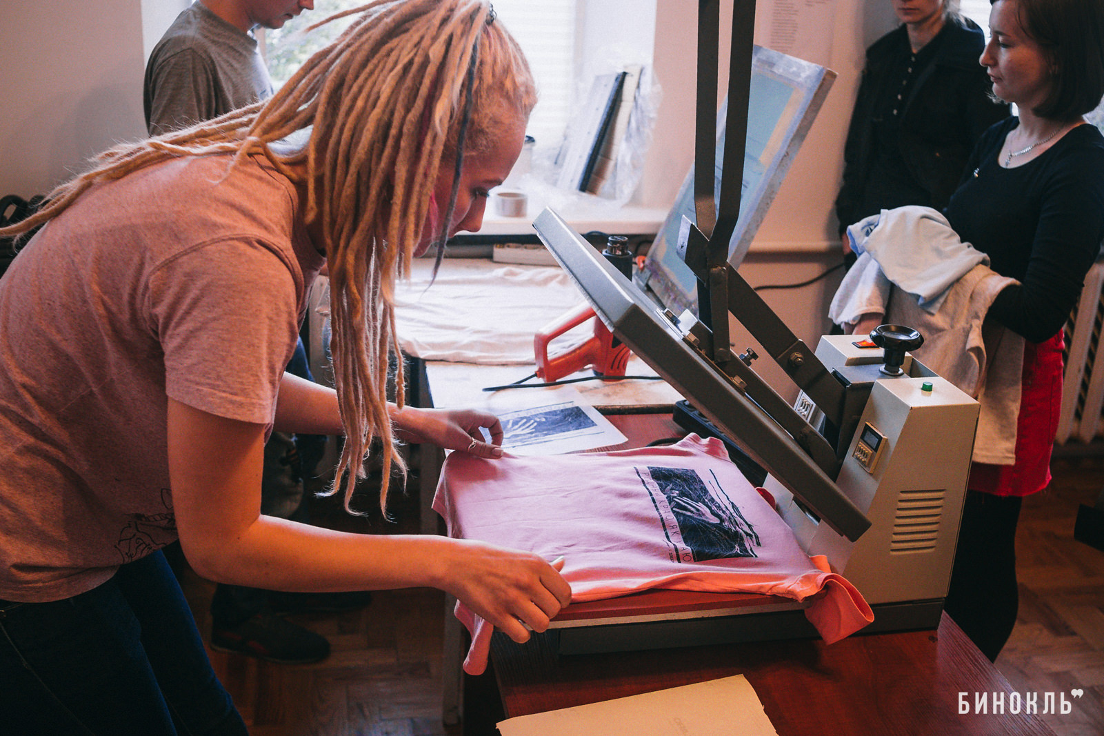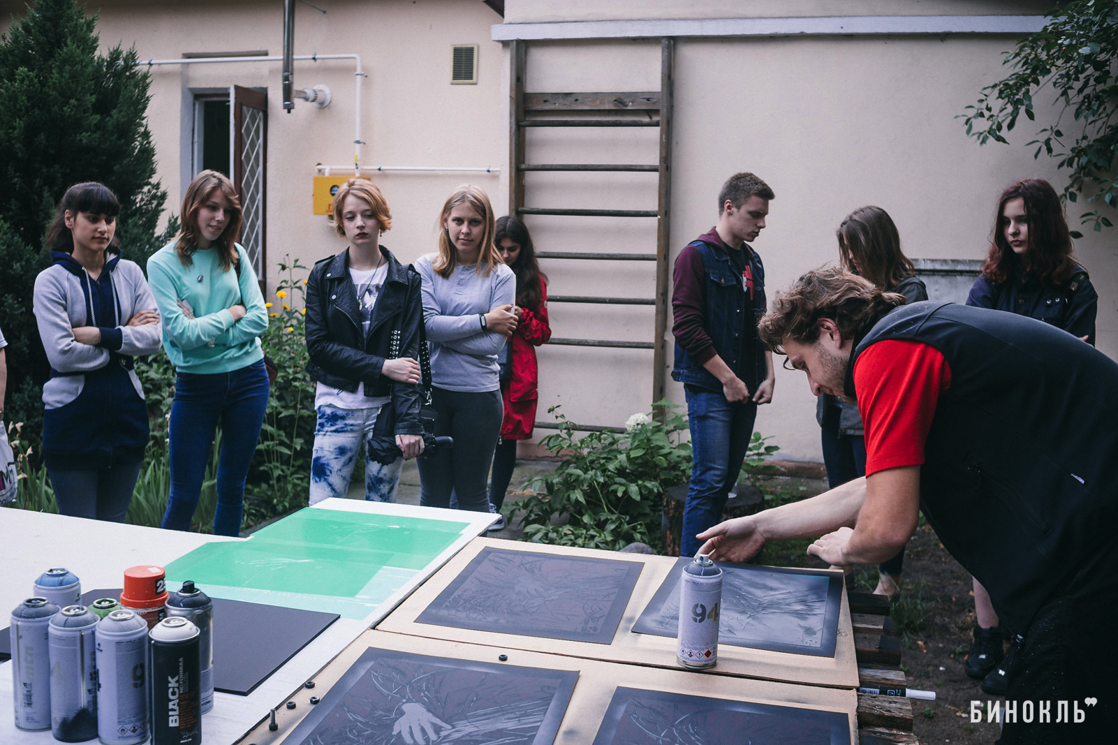 «Дзедзіч» продолжает радовать ламповыми тусовками – в эту пятницу 23 июня во дворике на Маяковского своими работами делился уличный художник Сергей Русак (aka Изюм). Все желающие могли также «закатать» в авторский принт принесенную футболку. В новом формате встреч с печатью на майках и выпуском постеров — разбирался Бинокль’’.