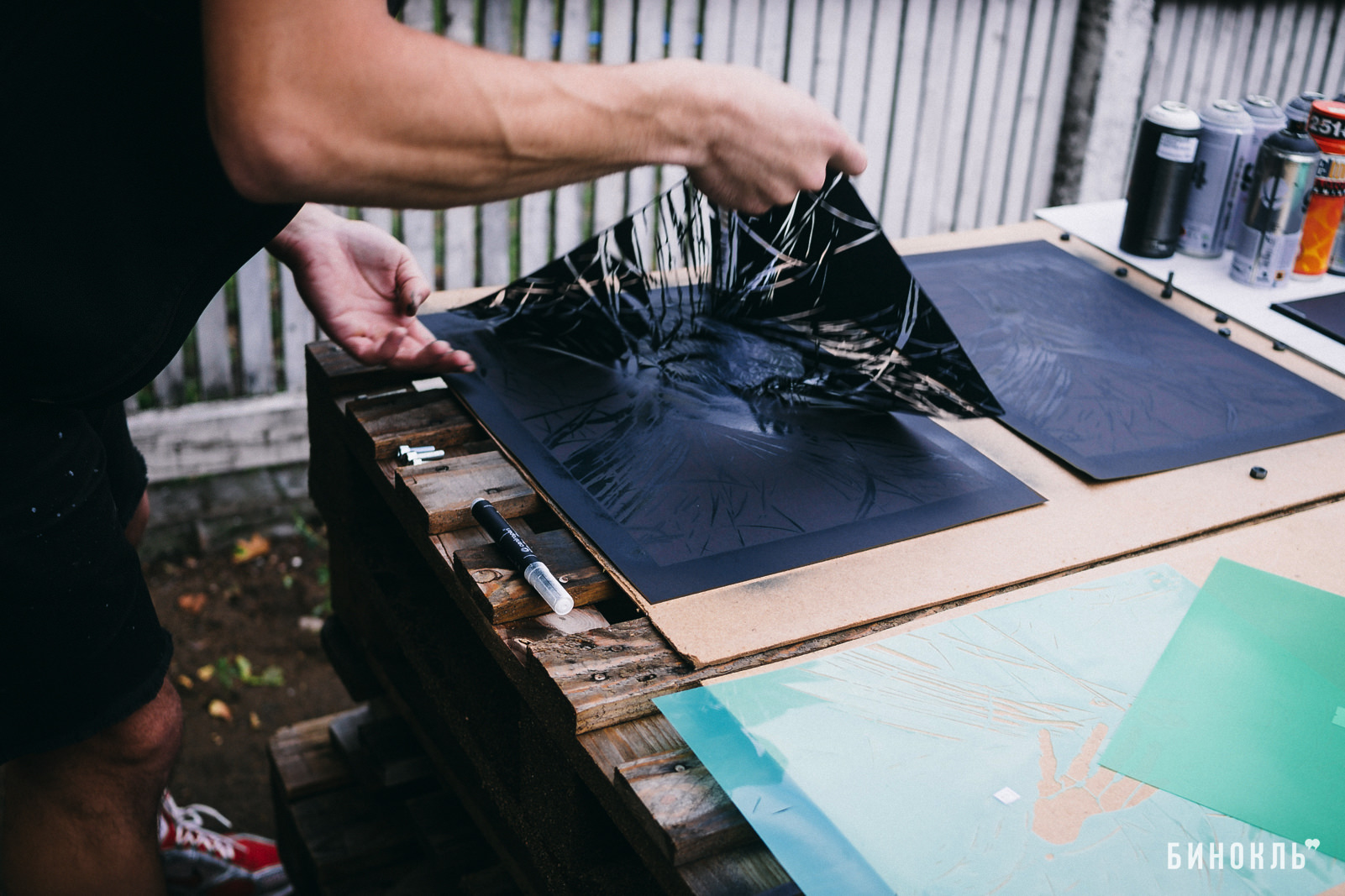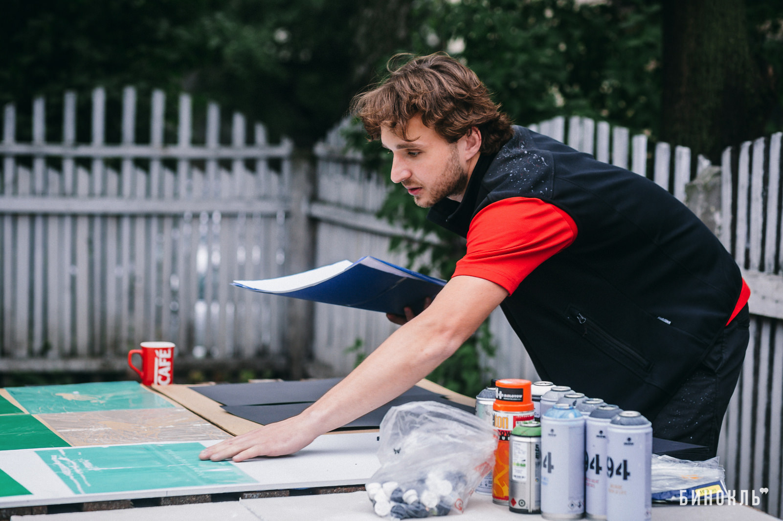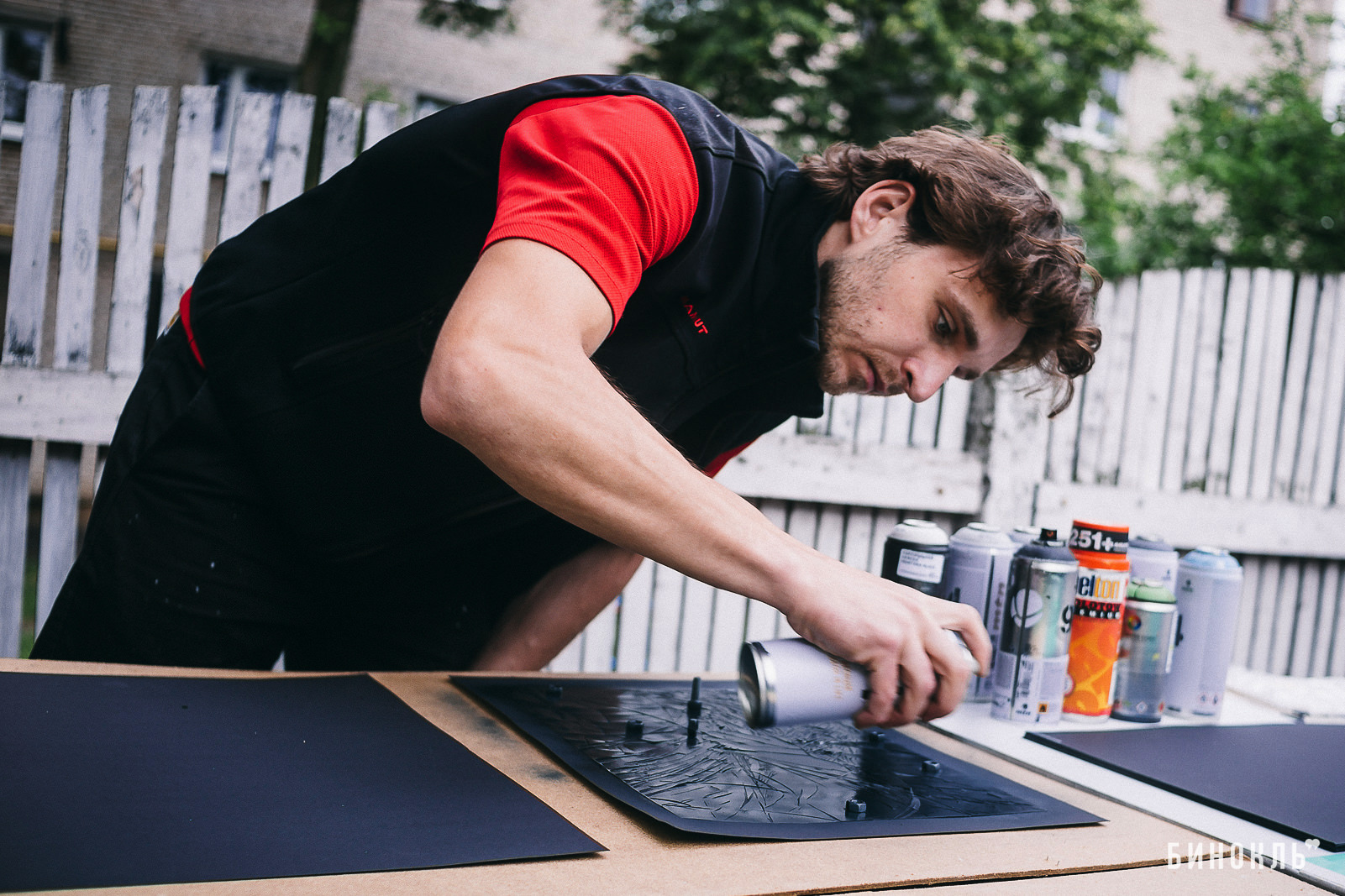 Для брестчан был разработан уникальный принт. 15 счастливчиков унесли домой свежеиспеченные постеры – Сергей рисовал в 6 слоев в режиме онлайн с помощью подготовленных трафаретов.