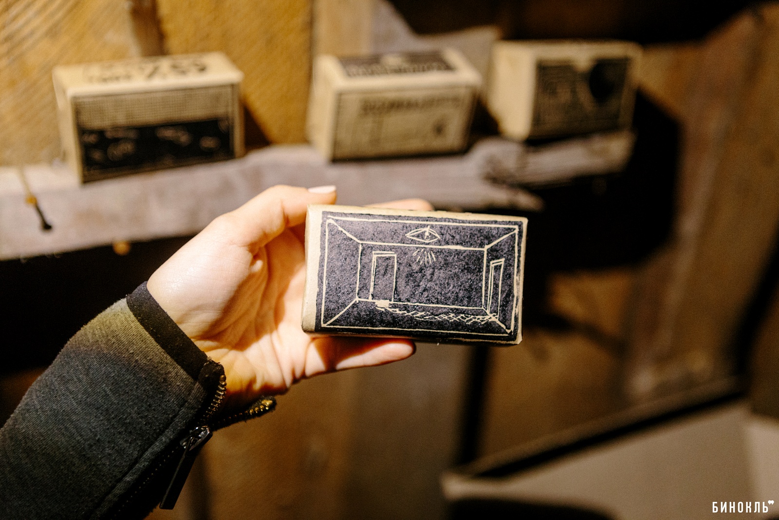 Это хозяйственное мыло. Купил у Гомельского жирокомбината — потрясающая вещь. Решил брендировать. Это все печатная графика, линогравюра, каждый кусочек упакован в отдельное изображение. Культ гигиены. Вот счастливый человек, который приобрел кусочек хозяйственного мыла и идет домой. На этой картинке варят жир, а это — мыловарни сливают отходы в реку. Где-то человек умывается, а где-то хозяйственное мыло мечтает о туалетном. Здесь склад, на котором мыло лежит и томится в коробках.