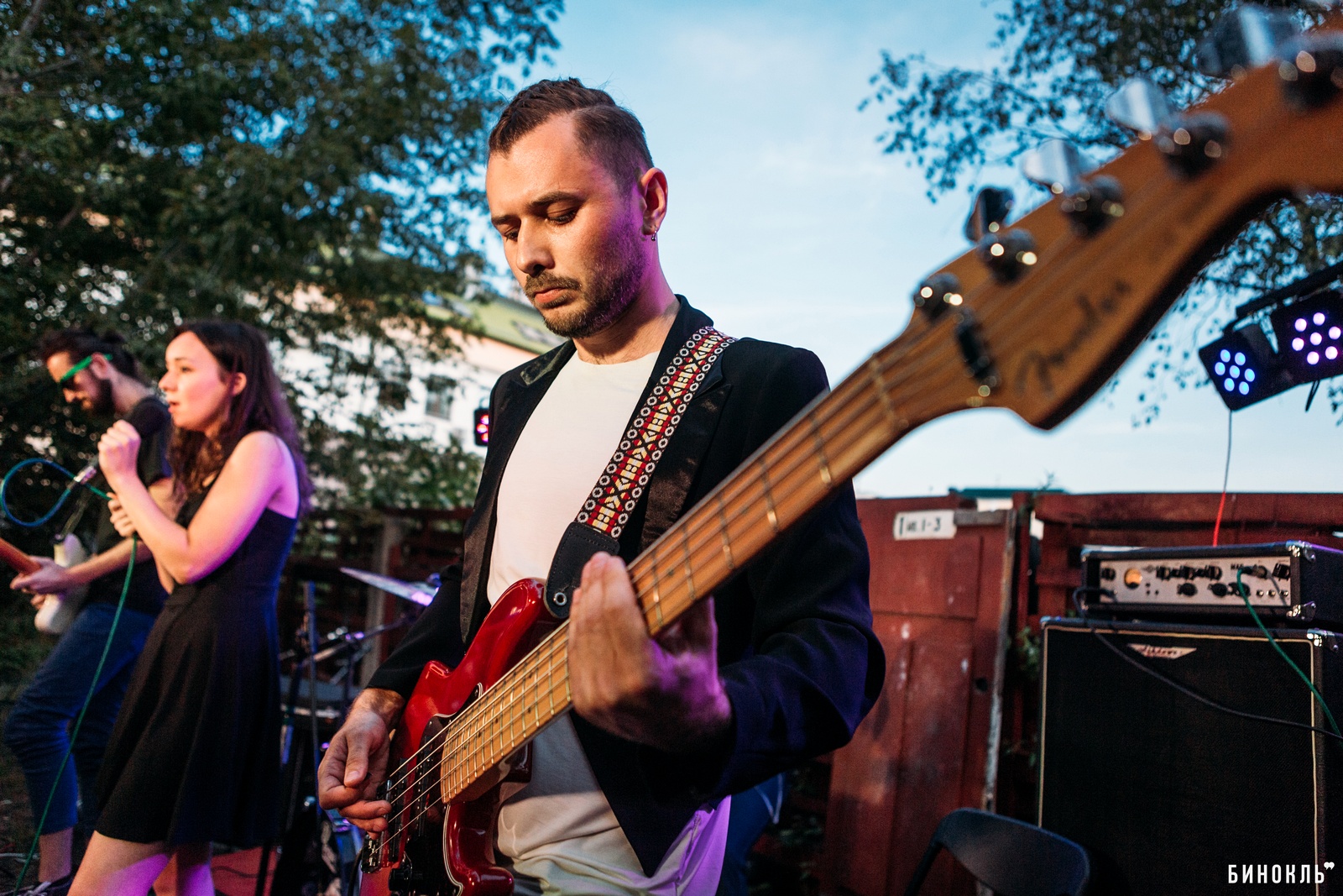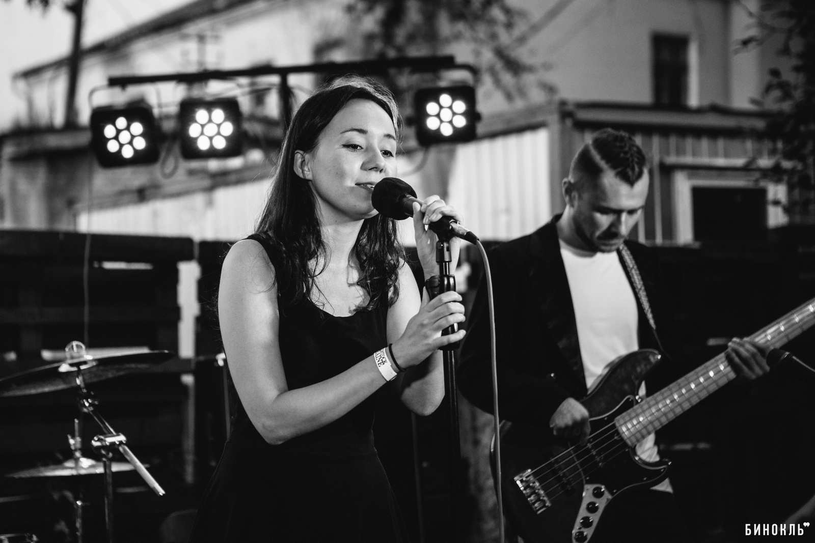 Далее программа претерпела изменения. Вместо SCHWUGGAZZ на сцену вышли лиричные EEVVEE. Об изменениях было известно заранее, но не всем. Так что если кто-то долго занимался планированием и целенаправленно шел на фениксов брестской сцены SCHWUGGAZZ, то должен был пройти крещение переливающимся вокалом Маши Вечорко и компанейским задором ее коллег из EEVVEE. Они свернули курс вечера в сторону ламповости и держали тон до конца. Подмерзшая августовским вечером публика ловила ритмы и настроение.