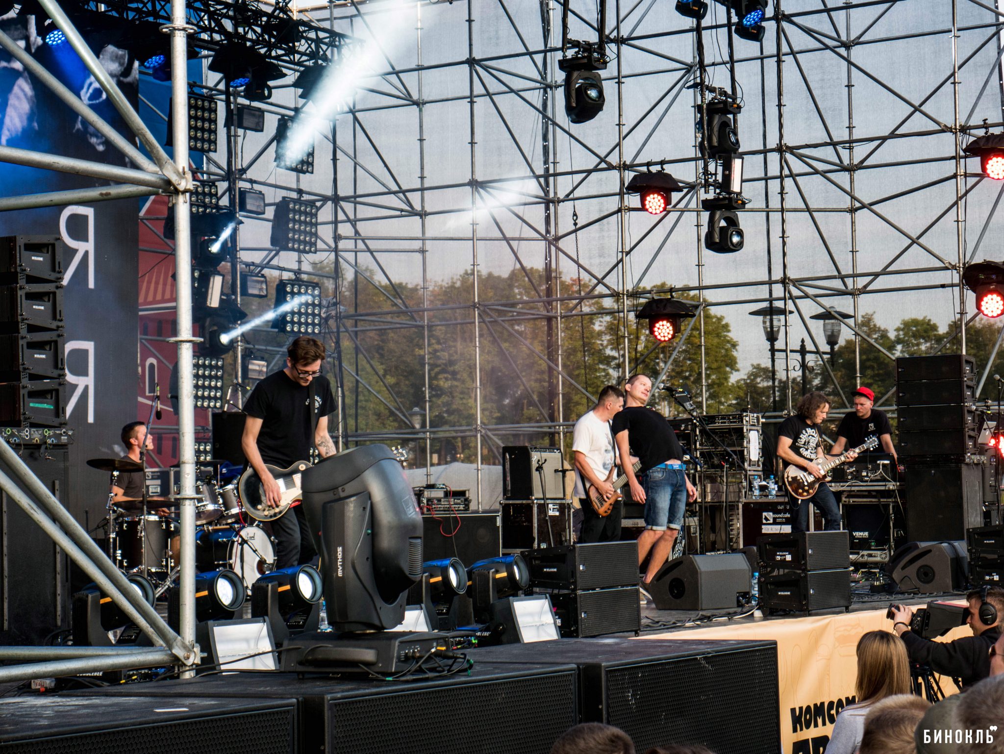 Концерт на главной сцене открывали ребята из Минска Петля пристрастия – группа модная и современная, определяющая свое музыкальное направление как пост-панк. В целом, приняли их довольно тепло, и на особо “качёвых” ритмах и интересных мелодиях народ притопывал и прихлопывал. Музыканты отыграли свой сет отлично, но чувствовалась их скованность и напряжённость перед столь большой сценой.