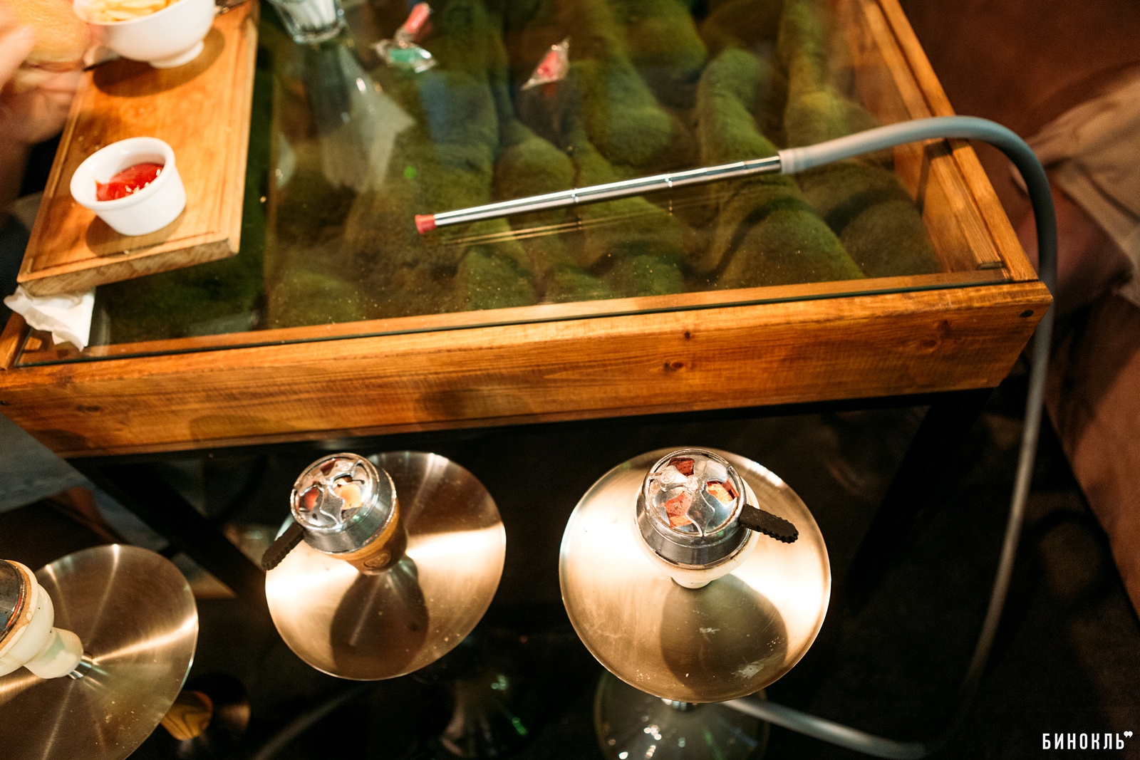 Кальянная «кухня» представлена разнообразно: «Стандарт» (20 рублей), «Премиум» (25 рублей), «Премиум X» и «Цитрусовый бум» — кальян на фрукте от шефа. Отличие в цене продиктовано классом табака. Вкусовое меню также дает выбор от сладкого и кислого до пряного и свежего. Кальянные мастера готовы на эксперименты даже с неординарными смешиваниями. Кстати, если вкус пришёлся не по душе, кальян «перезабьют» без возражений.