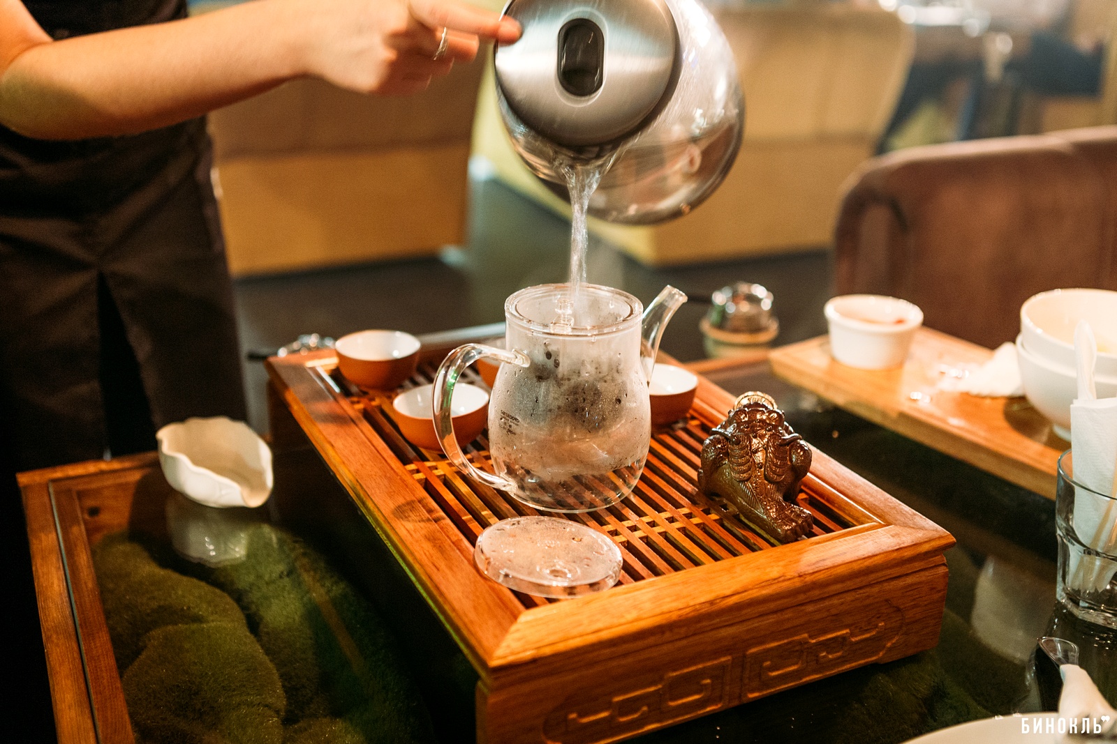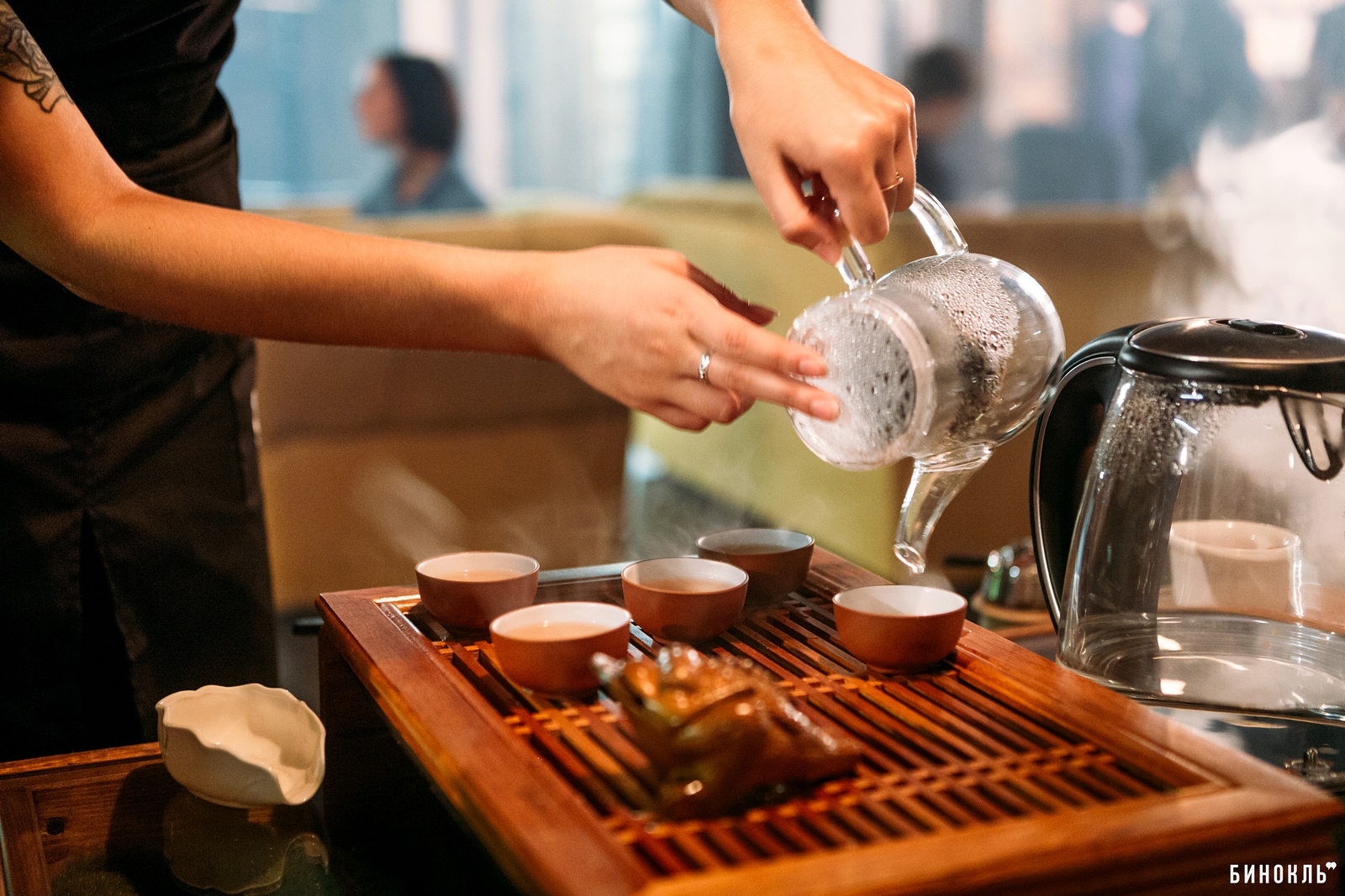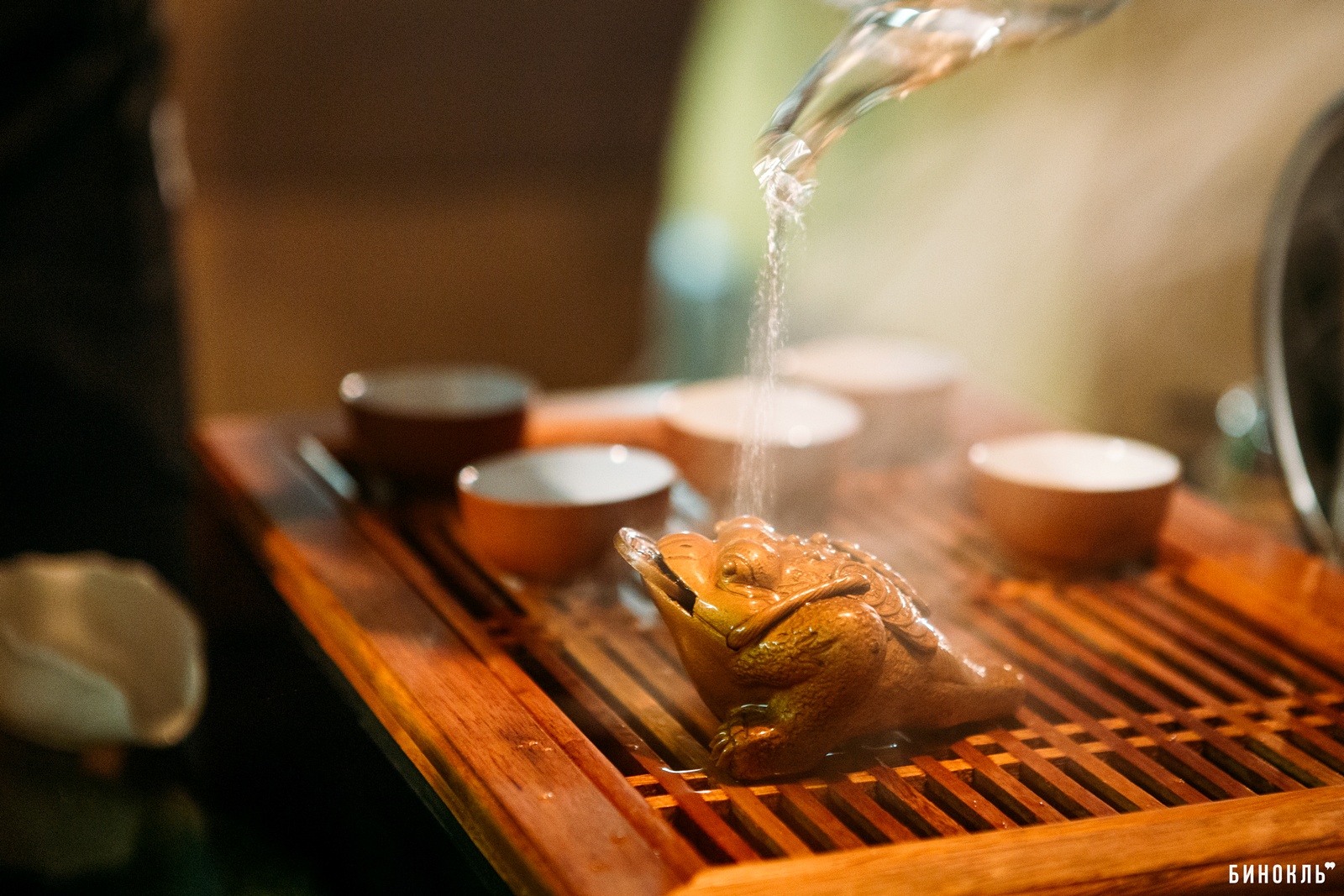 В кафе можно заказать традиционную чайную церемонию. Мастер познакомит вас с чаем (предложив вдохнуть его «сухой» аромат), заварит его и легенду расскажет. «Железная богиня милосердия», «Брови долголетия» или «Снежный пик» — у любого сорта есть своя история. На чайной доске под названием «чабань» кроме пиалок и типота — чайника для заваривания — присутствует чайная фигурка, которую можно погладить и загадать желание. Если цвет сменился, когда мастер обдал ее кипятком — похоже, желание должно исполниться.