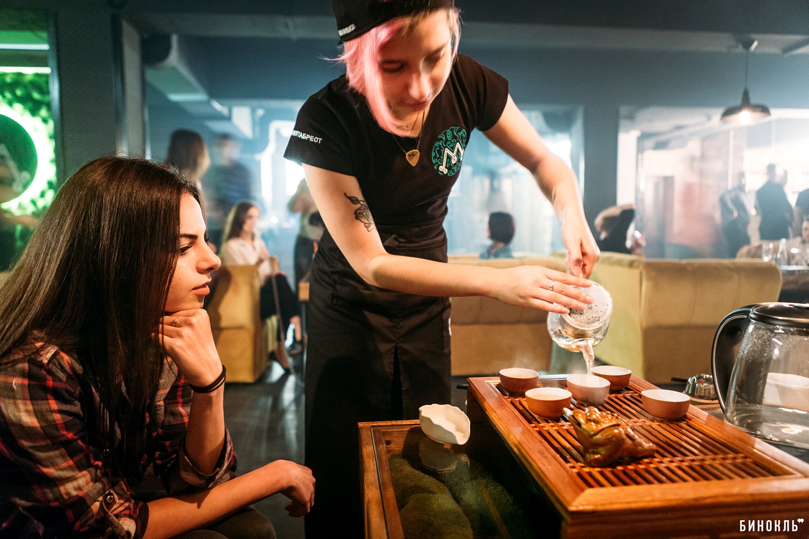Чай здесь — важная позиция. Работают чайные мастера, предлагая попробовать напиток не по-привычному в качестве «запивки». «То, что находится в чайном меню, – далеко не показатель. Мы, чайные мастера, как «ходячее меню»: ассортимент быстро расширяется, да и чай можно смешивать между собой, тогда получается совершенно новый продукт со своей особенной композицией», — пояснила нам Евгения, чайный мастер.