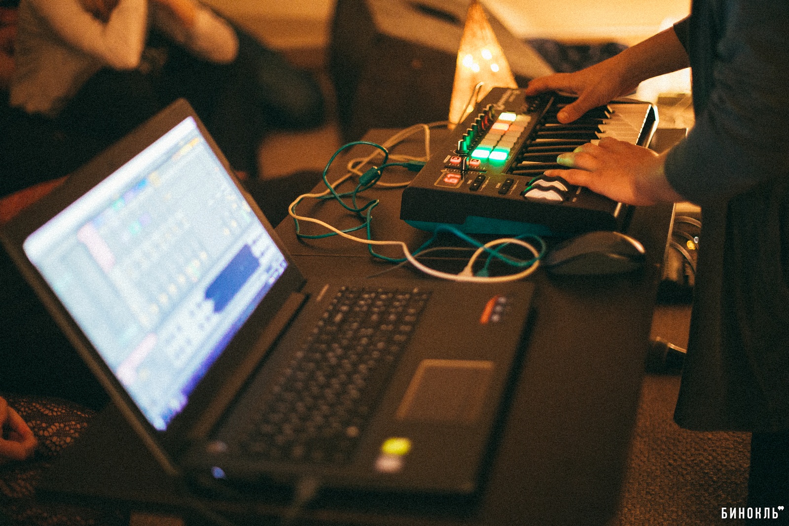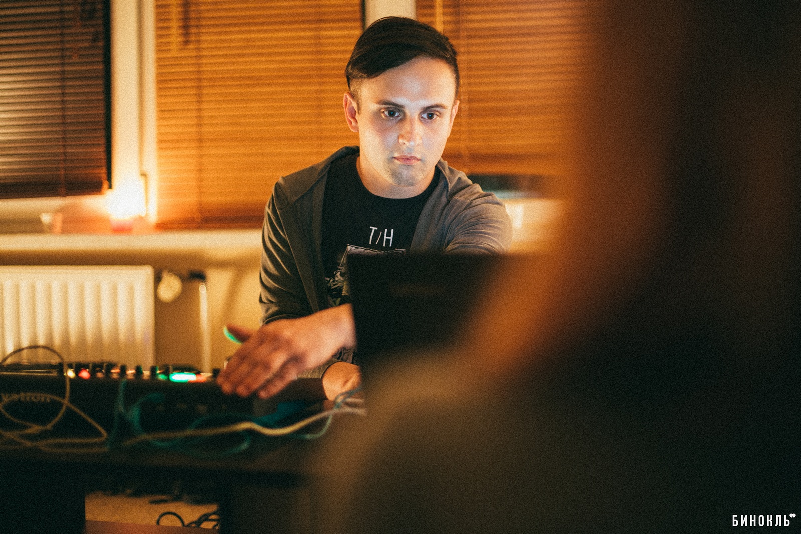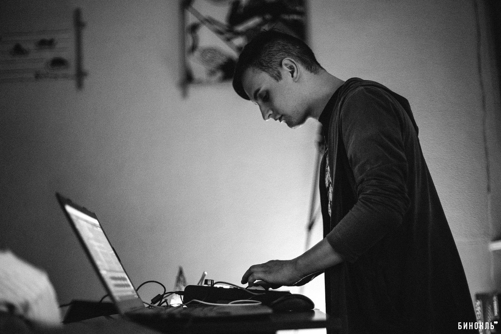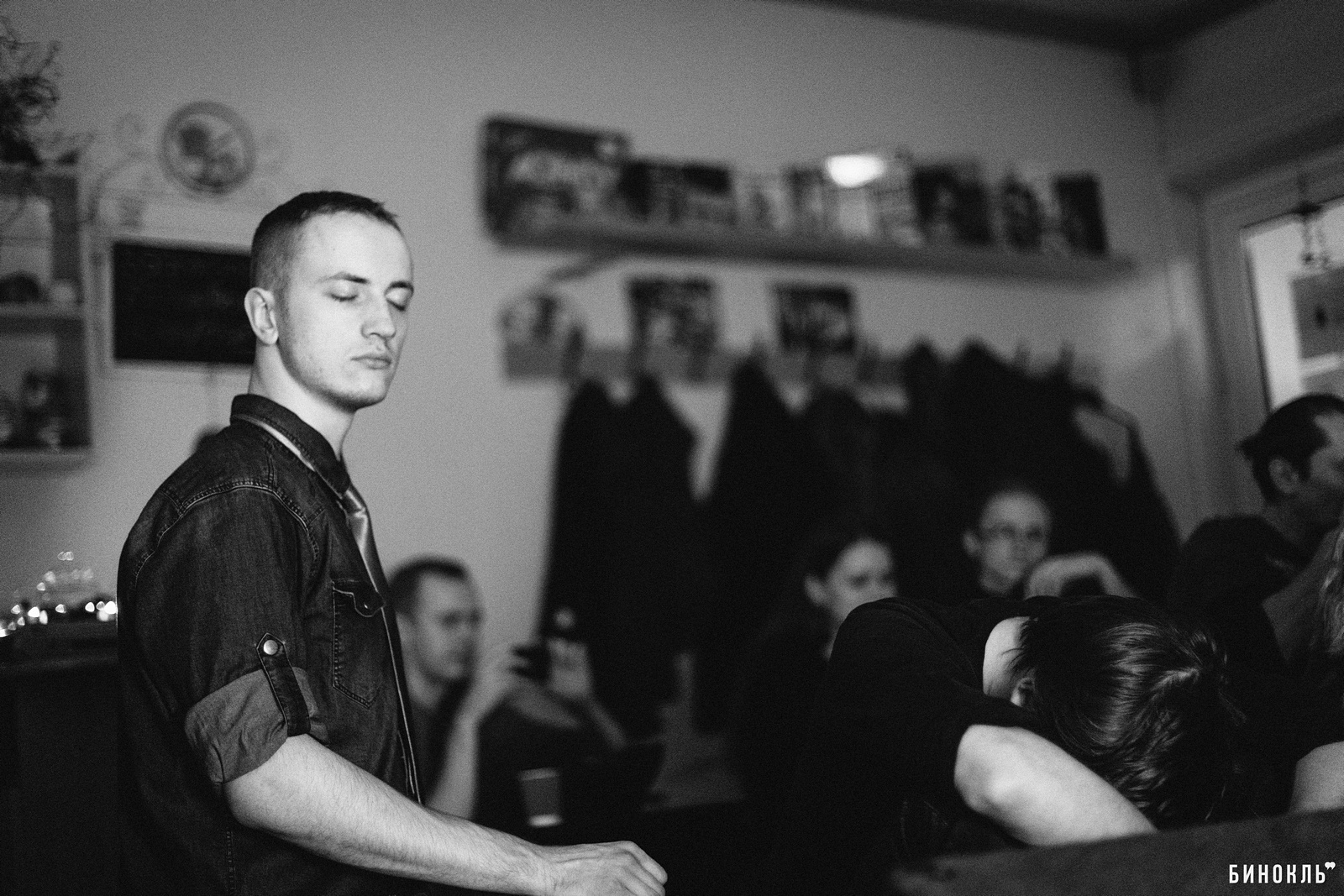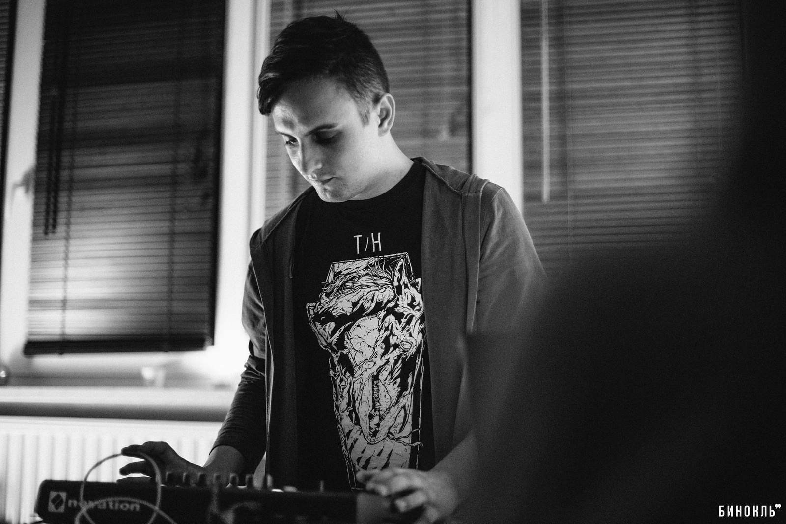 Last but not least в списке выступавших – Дима ака Trawma, шутливо называемый коллегами по цеху «хедлайнером мероприятия» (не безосновательно – Trawma уже может похвастаться живыми выступлениями на минских фестивалях). Киберпанковый эмбиент и мрачный дарквэйв, струившиеся из единственной рабочей колонки (первый блин немножечко комом), существенно сократили зону медитативного комфорта уже приготовившихся «чиллиться» адептов.