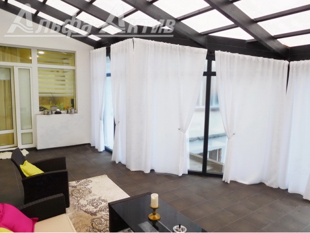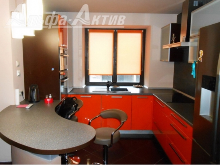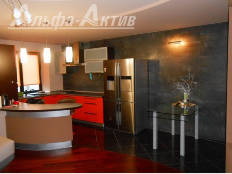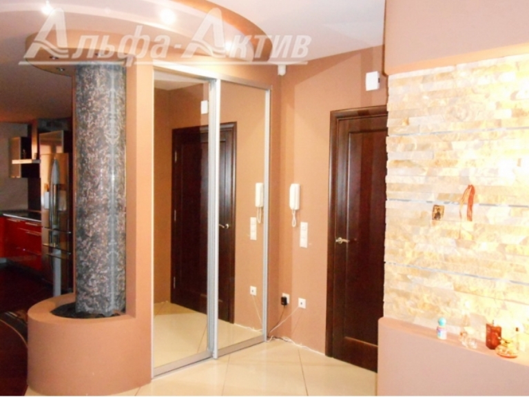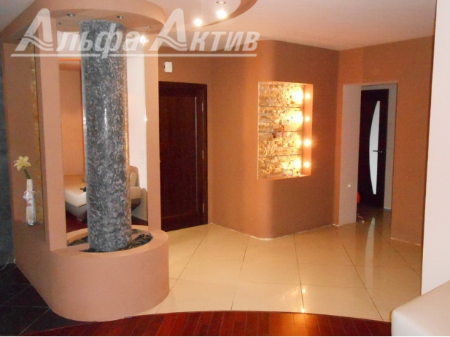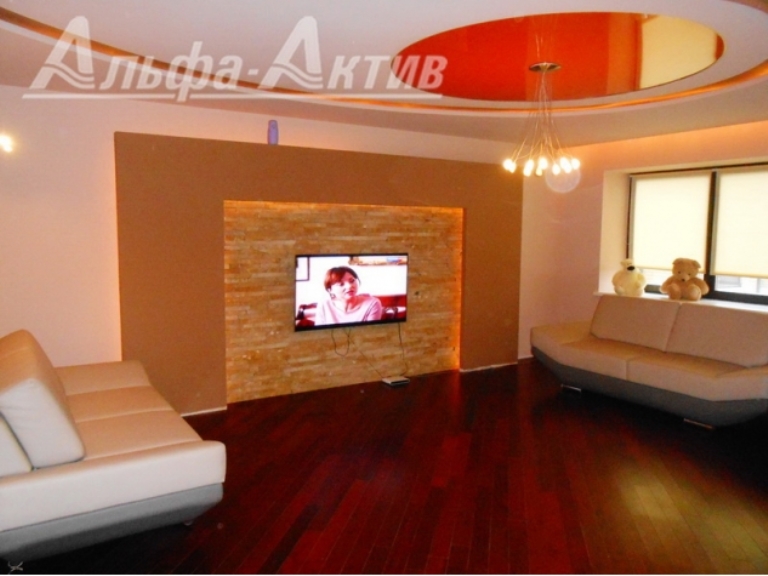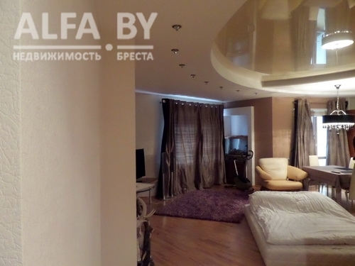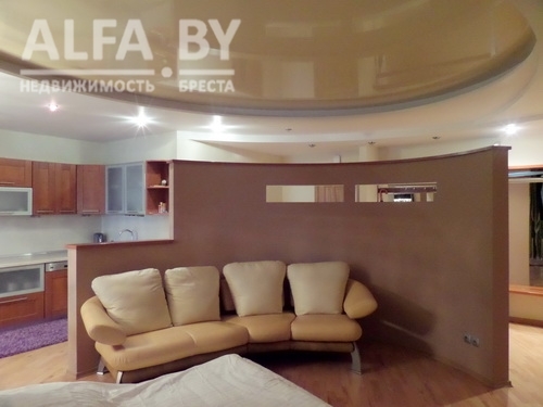 Квартира с гардеробной, ремонтом и кухонным гарнитуром находится прямо в центре на улице Маяковского. Девятиэтажный дом 2007 года постройки. Квартира располагается на восьмом этаже. Площадь — 114 квадратов. Гостиная-студия объединена с кухней, разноуровневые потолки оснащены подсветкой, на стенах — декоративная штукатурка.