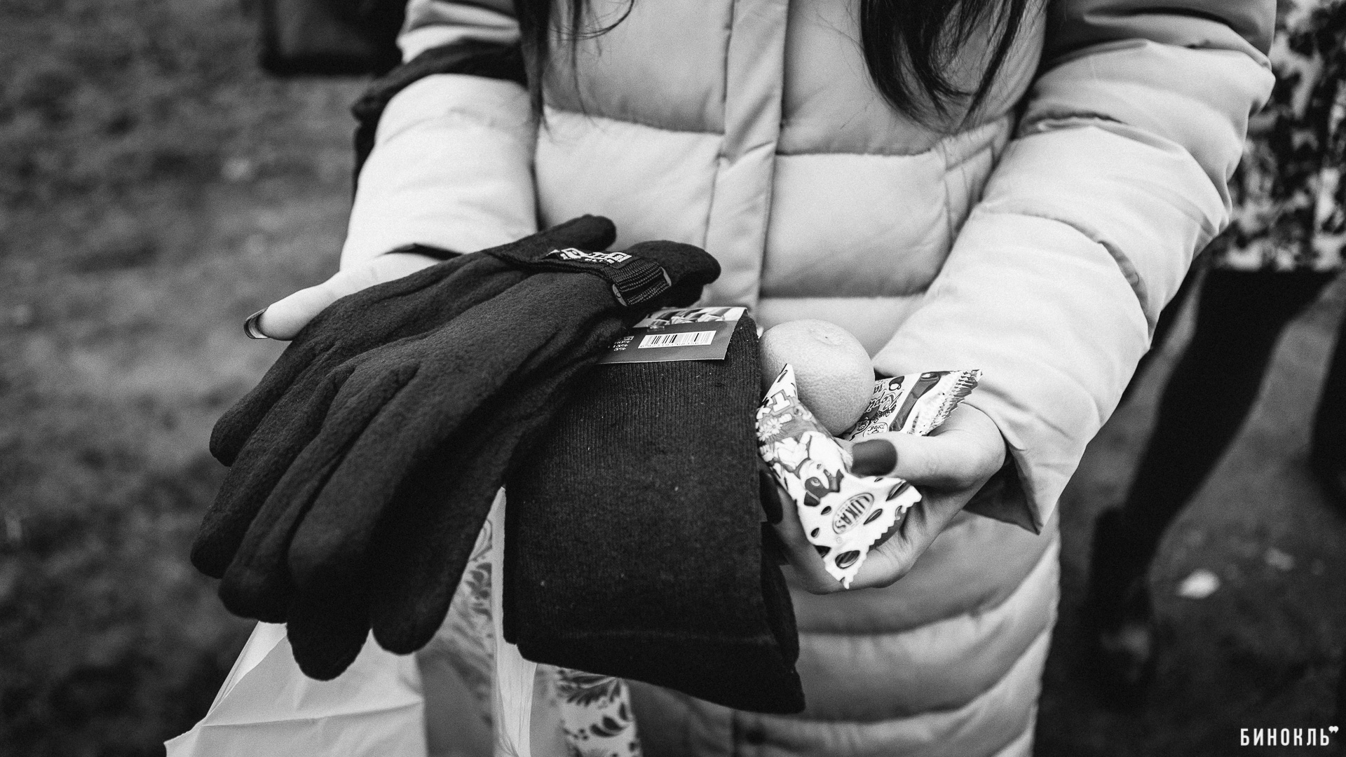 Как и полагалось, накануне праздника на привычном месте встречи – пустыре за городской филармонией – сразу после предновогодней трапезы (с оливье!), организованной волонтёрами, художник вручил подарки бездомным: тёплые перчатки, носки, зимнюю обувь, конфеты и мандарины – такой набор был подготовлен для каждого человека, оставшегося без крова.