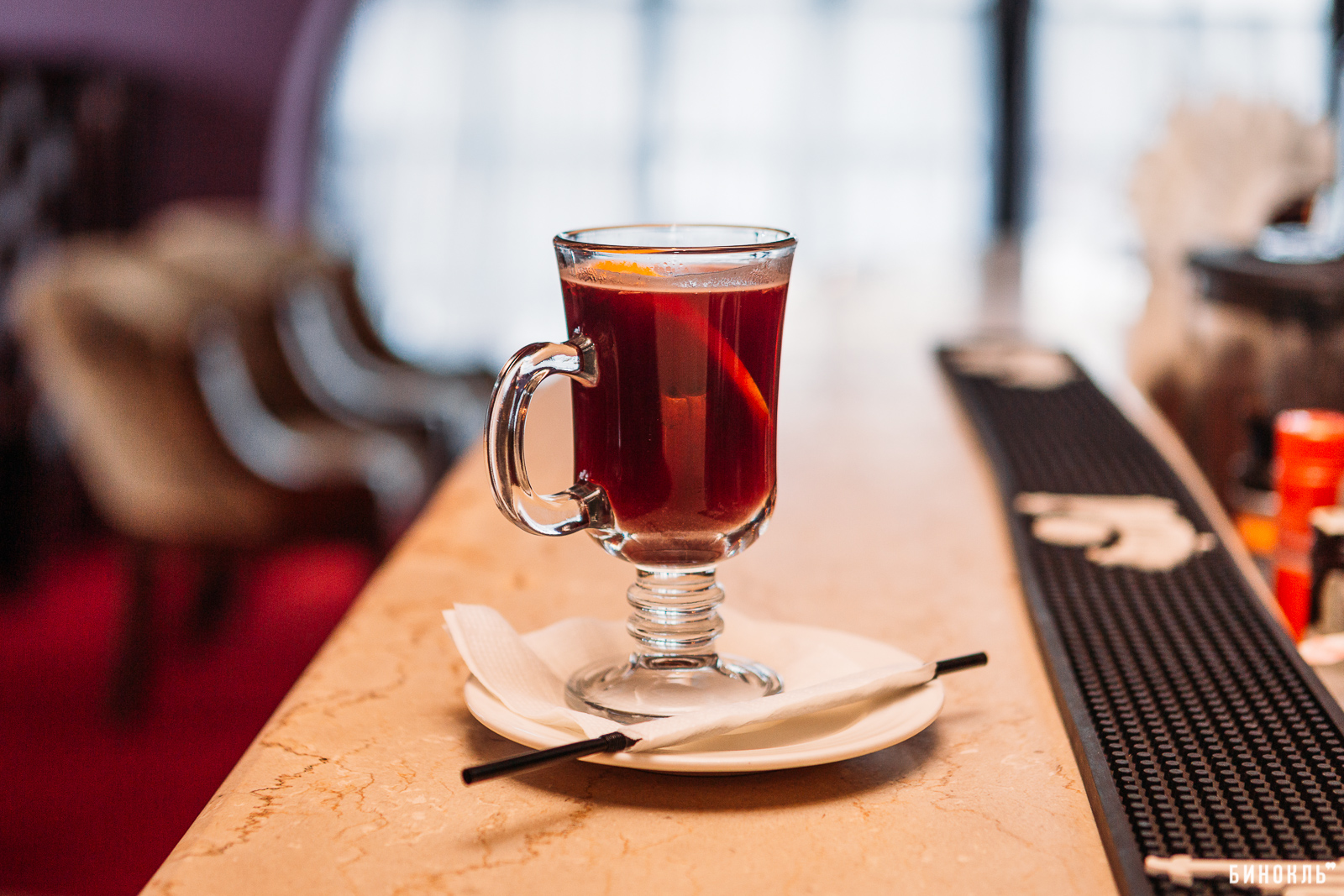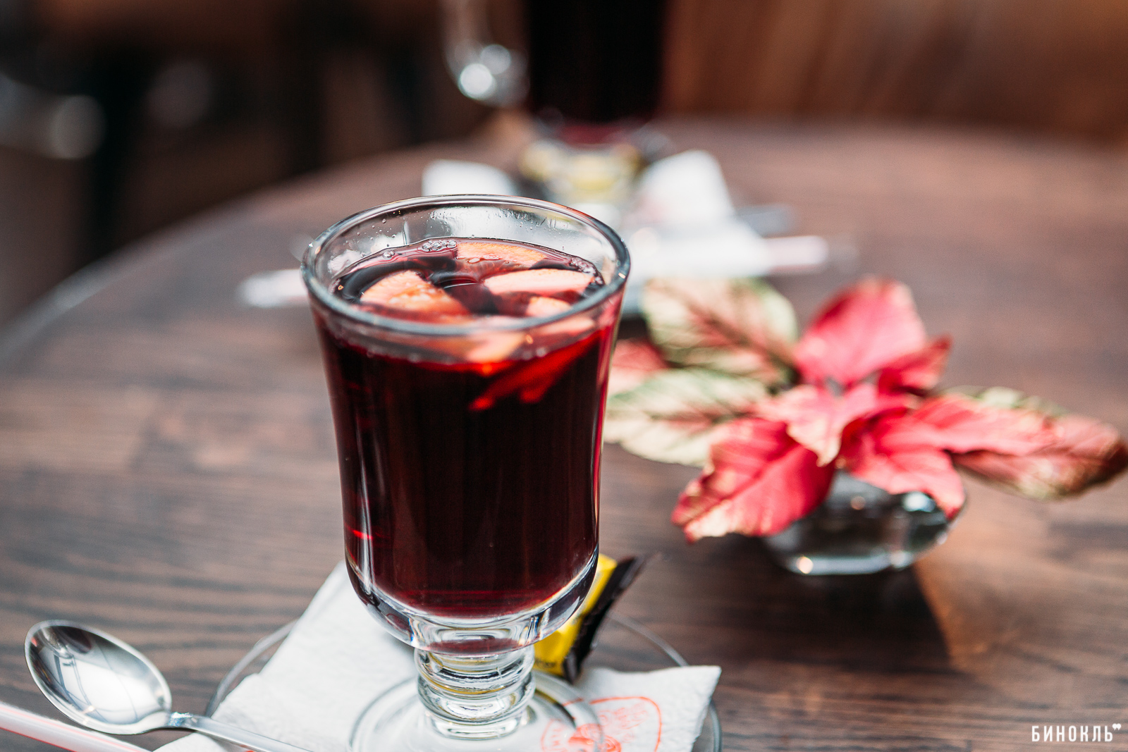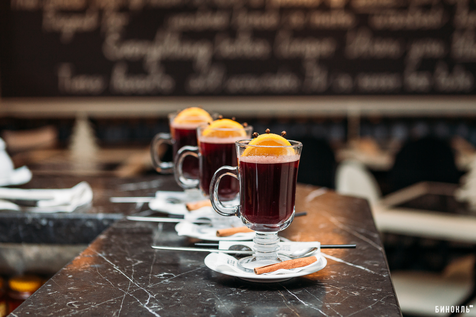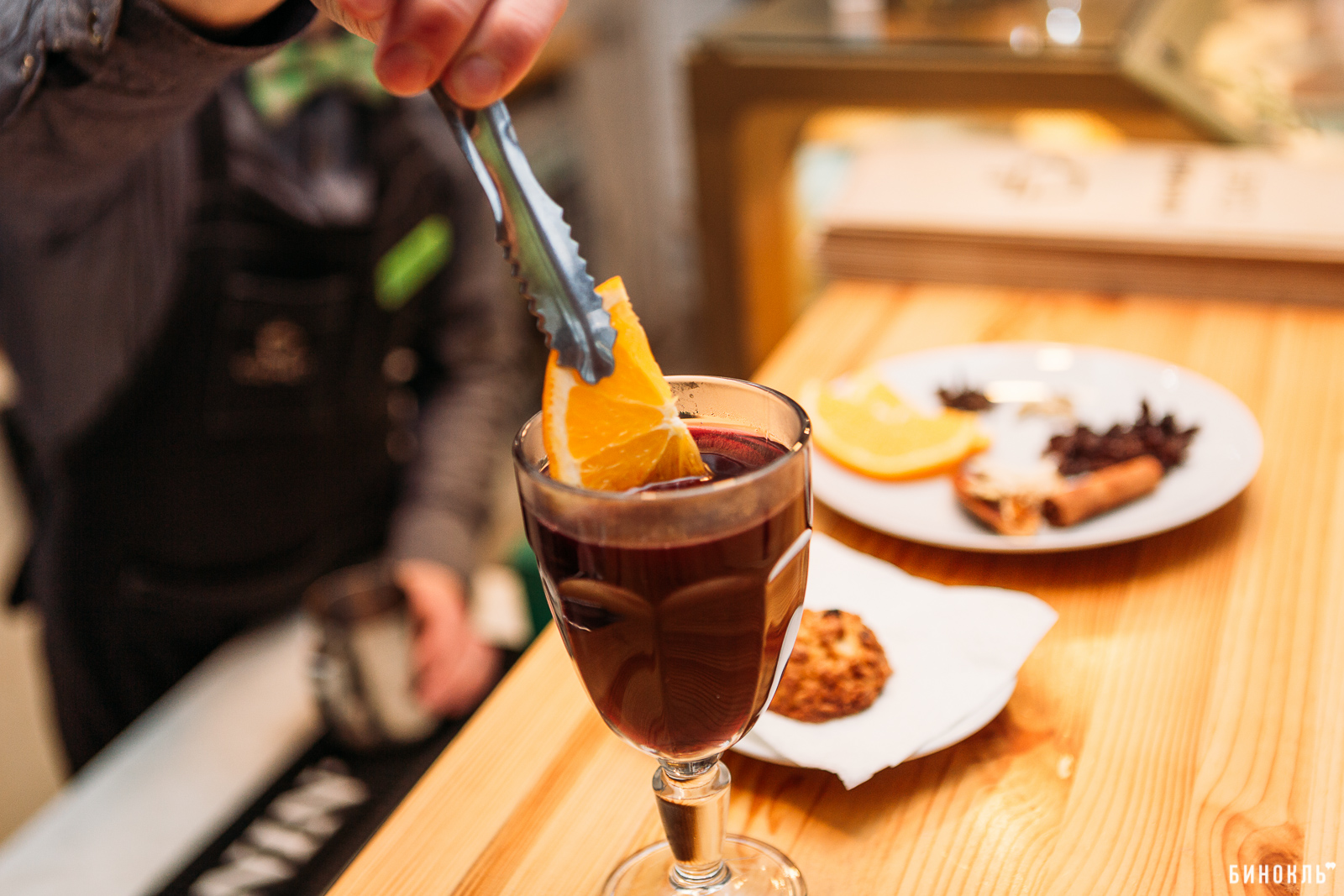 Для глинтвейна используют красное крепленое вино, и на выходе получается 200 мл продукта. Помимо самого напитка, предусмотрен и фирменный бонус от заведения – конфета козинак, покрытая шоколадом. За рецептуру отвечает отдельный человек, который занимается именно этим напитком.