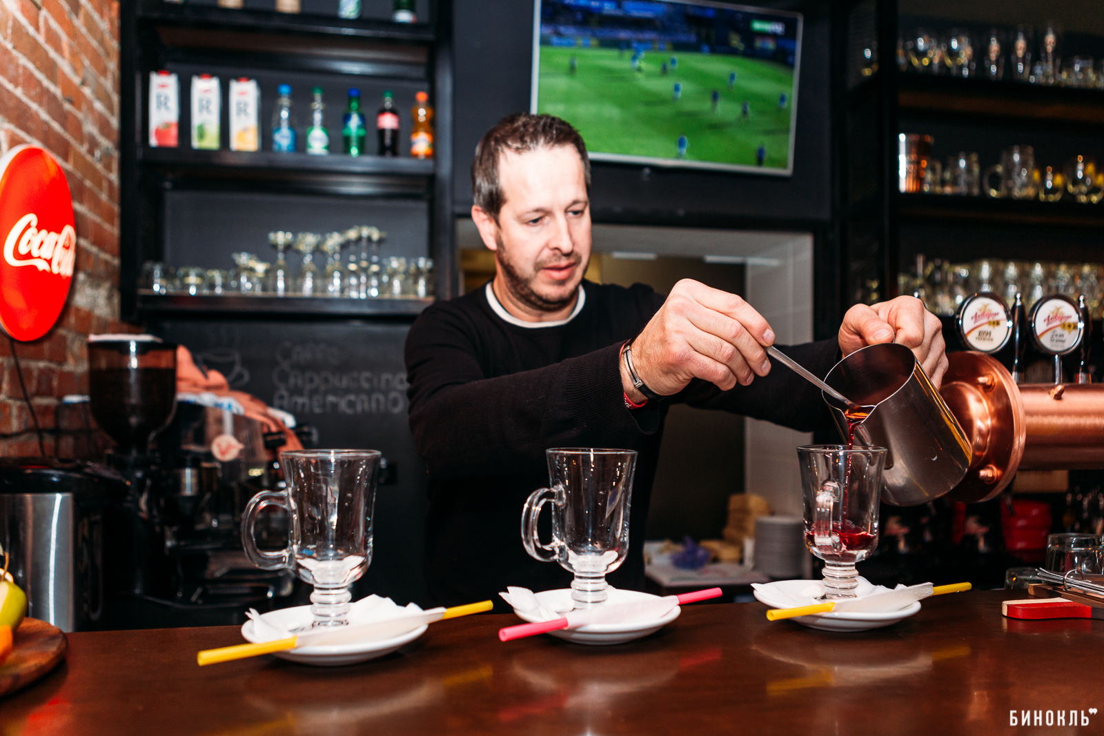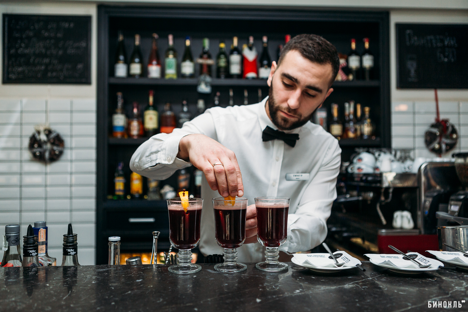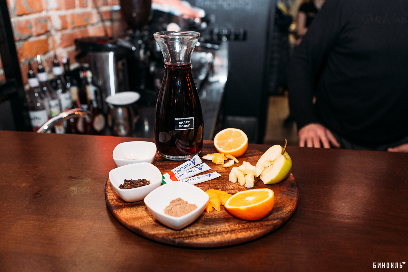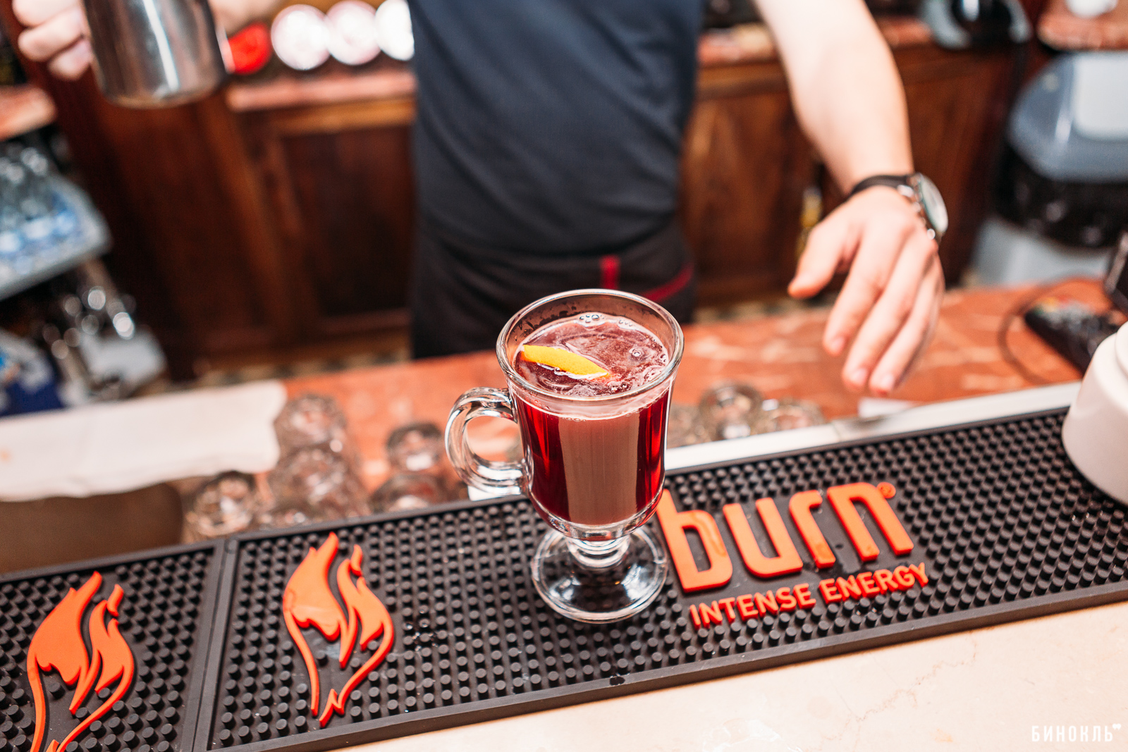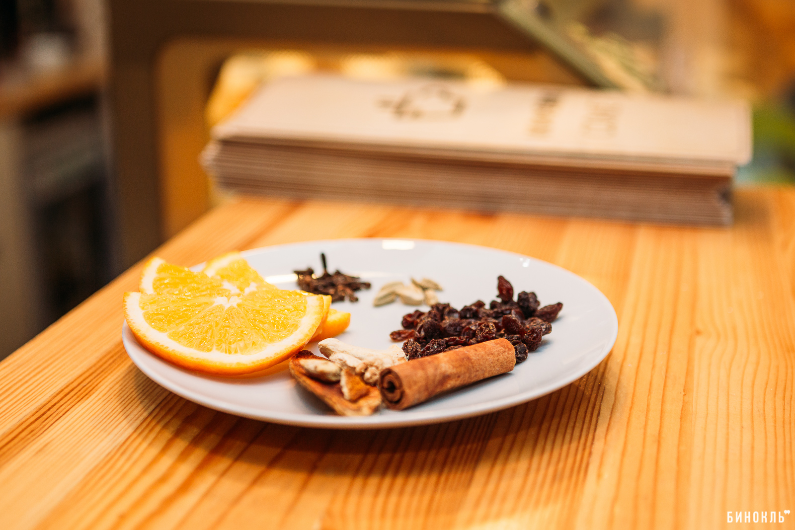 Для глинтвейна используют красное крепленое вино, и на выходе получается 200 мл продукта. Помимо самого напитка, предусмотрен и фирменный бонус от заведения – конфета козинак, покрытая шоколадом. За рецептуру отвечает отдельный человек, который занимается именно этим напитком.