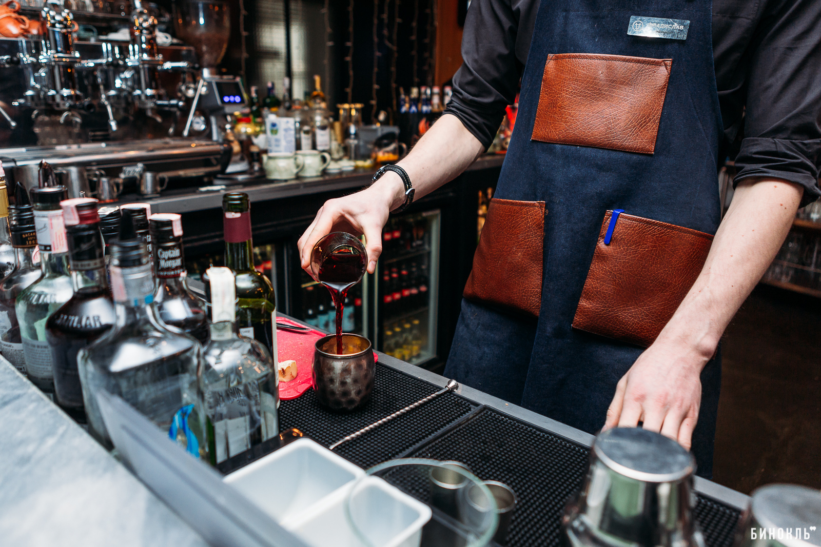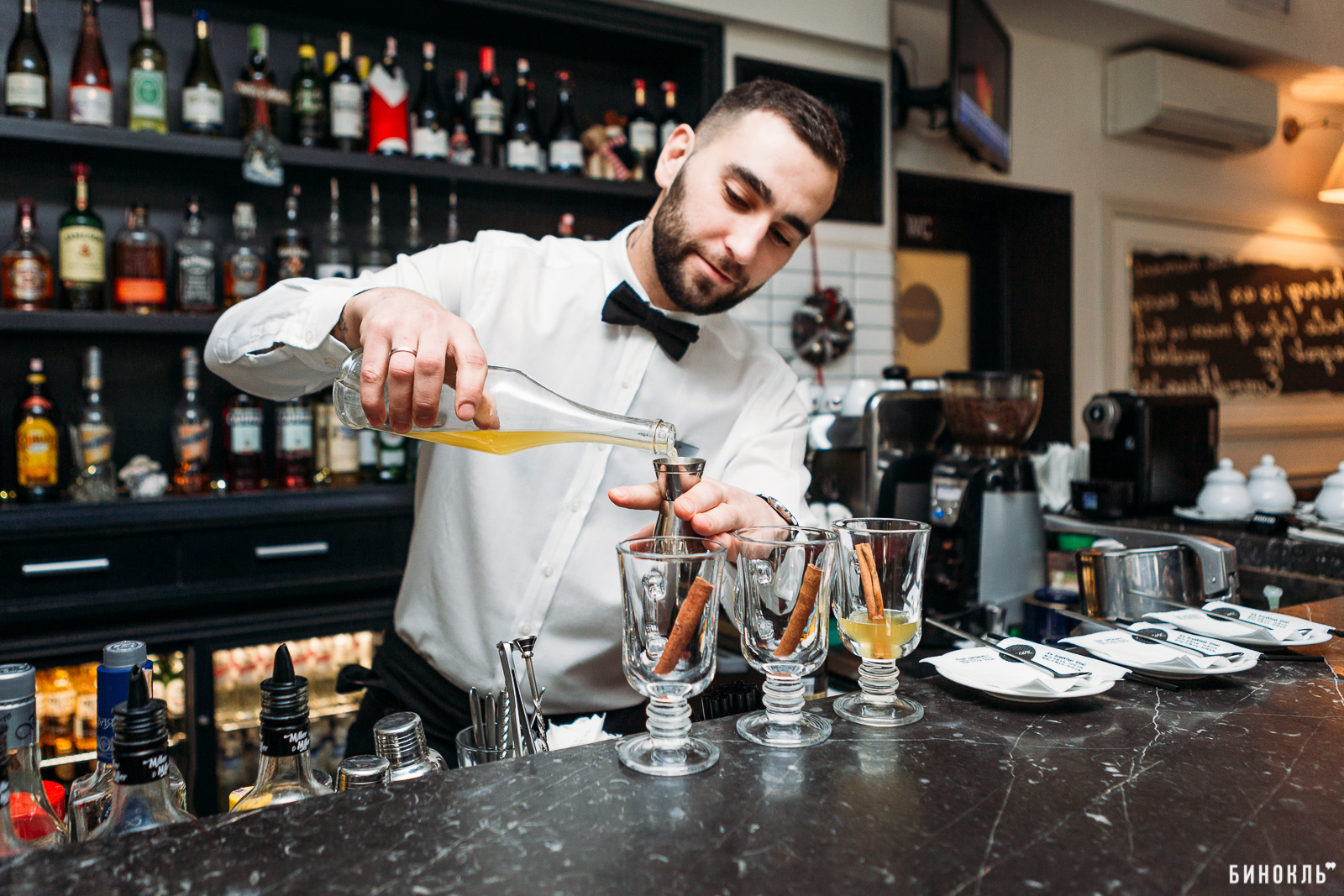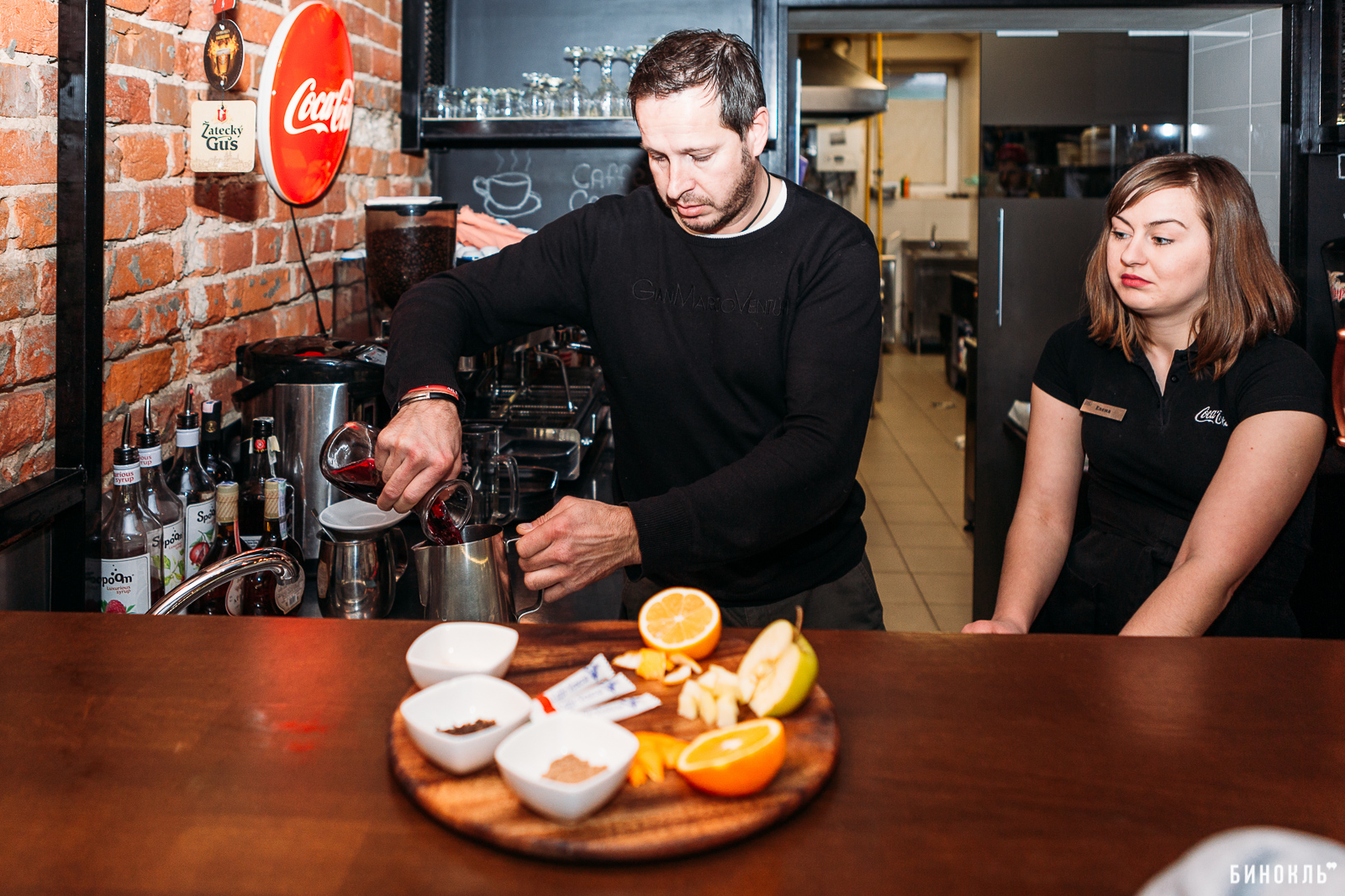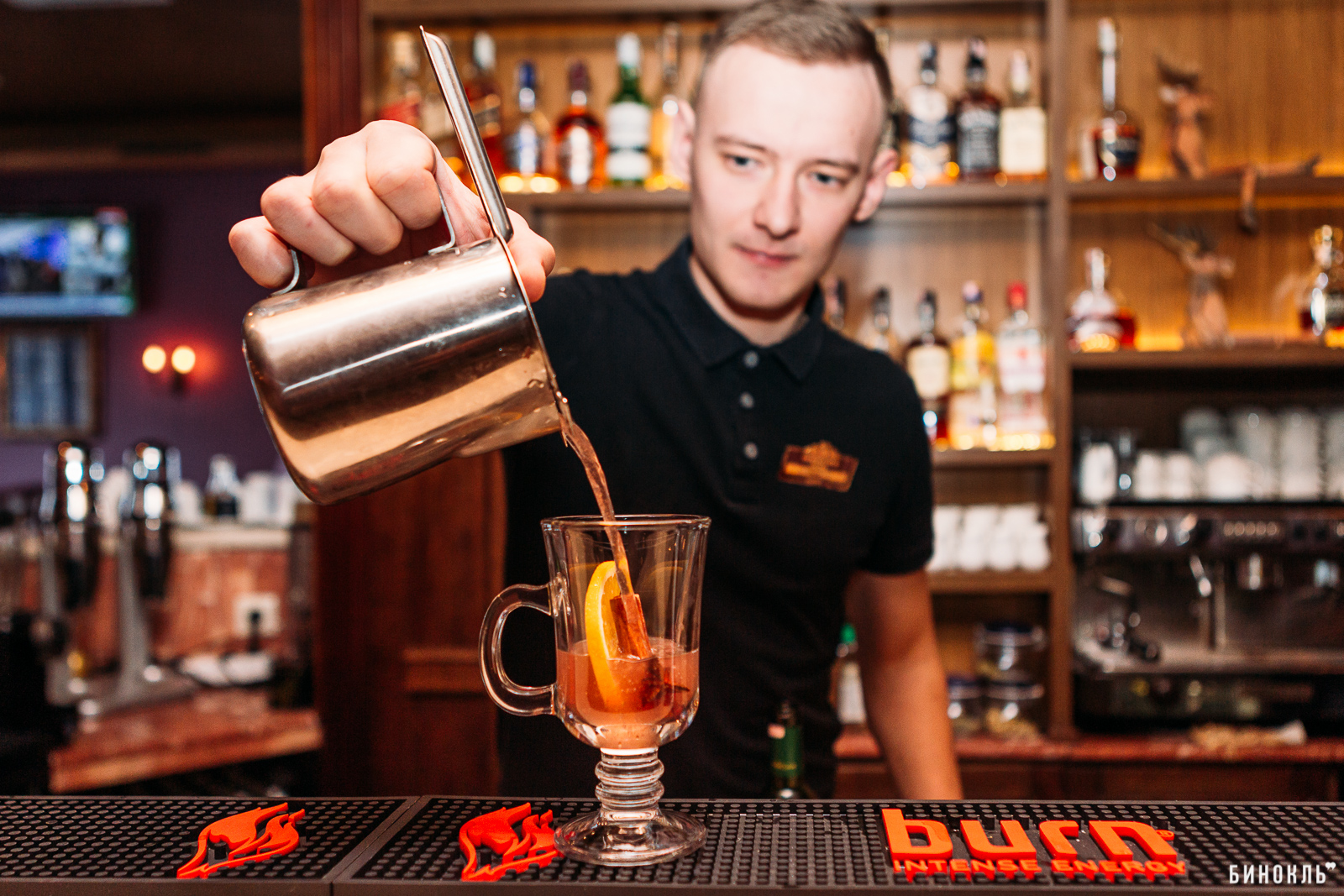 Для глинтвейна используют красное крепленое вино, и на выходе получается 200 мл продукта. Помимо самого напитка, предусмотрен и фирменный бонус от заведения – конфета козинак, покрытая шоколадом. За рецептуру отвечает отдельный человек, который занимается именно этим напитком.
