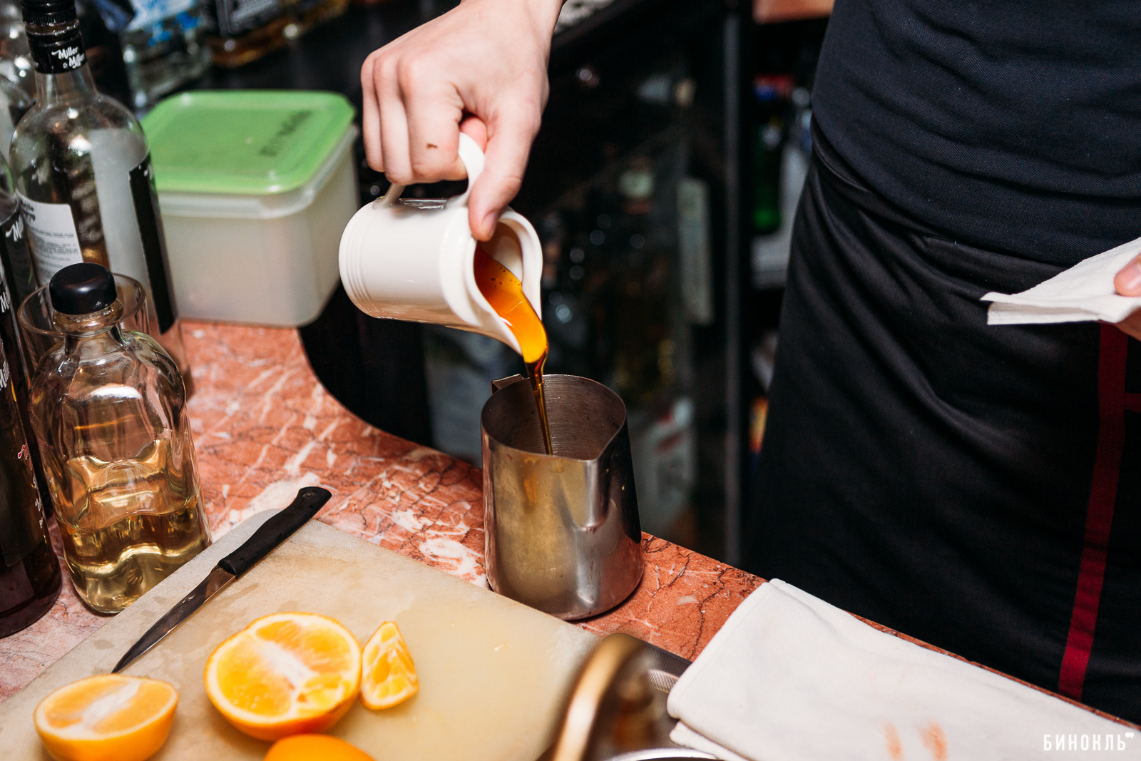 В конце смены бариста “Сонета” добавляют вино и остальные ингредиенты в тетрапот. Напиток варится 40 минут при температуре 70-80 градусов. После этого он остывает, настаивается и к утру готов к использованию. Перед подачей гостю его разогревают и подают в бокале для горячих напитков, «гарнируя» долькой апельсина. Цитрусовый фрукт совместно с ароматом гвоздики и палочкой корицы полностью раскрывают вкусовой букет.