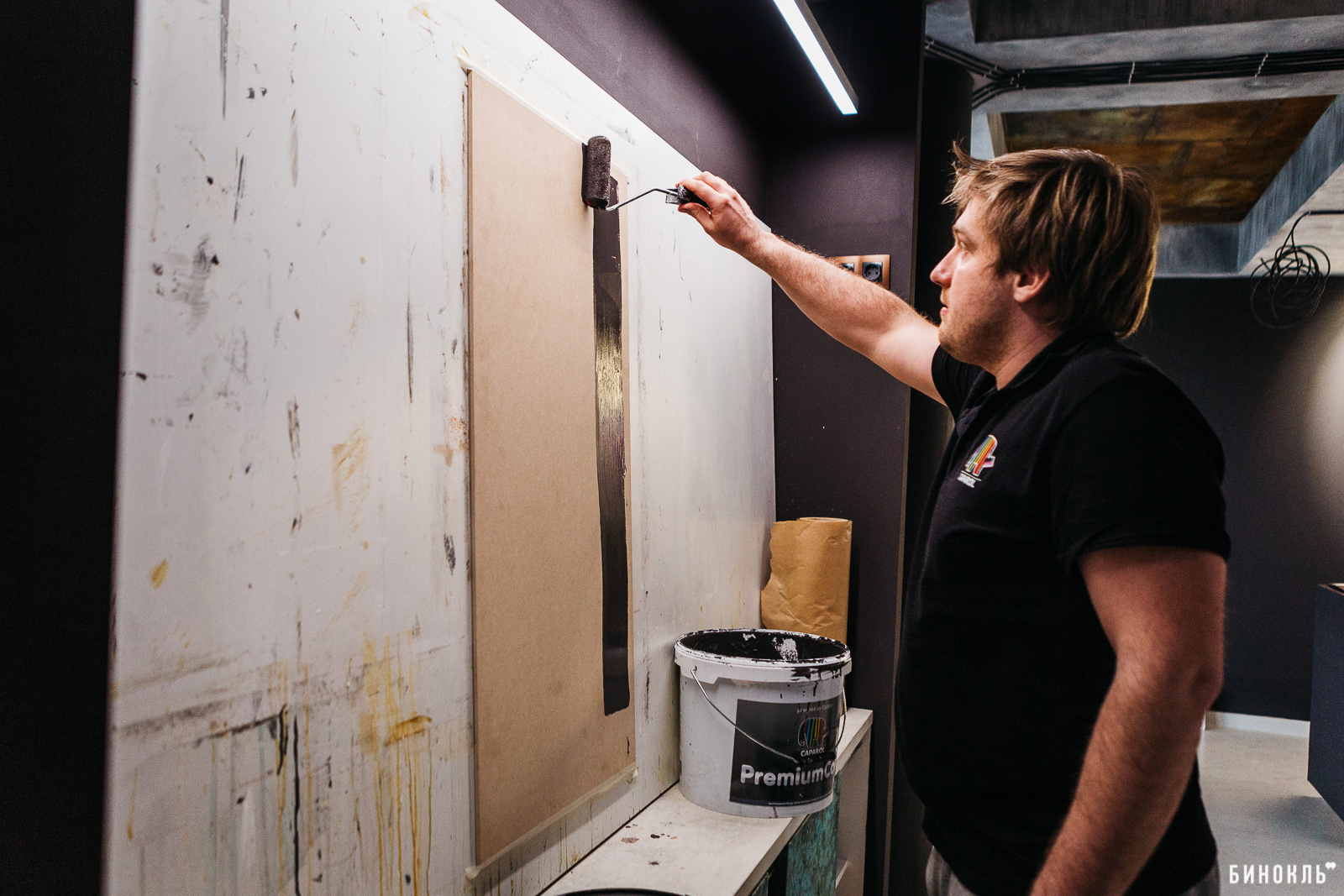 И несмотря на относительно скромный размер этого «сердца» всего помещения, места здесь хватает как для работы, так и для всевозможных баночек и образцов. Несмотря на брызги краски, пол в этой части зала закрывать не планируем: он хорошо моется, поэтому останется в своём первозданном виде.