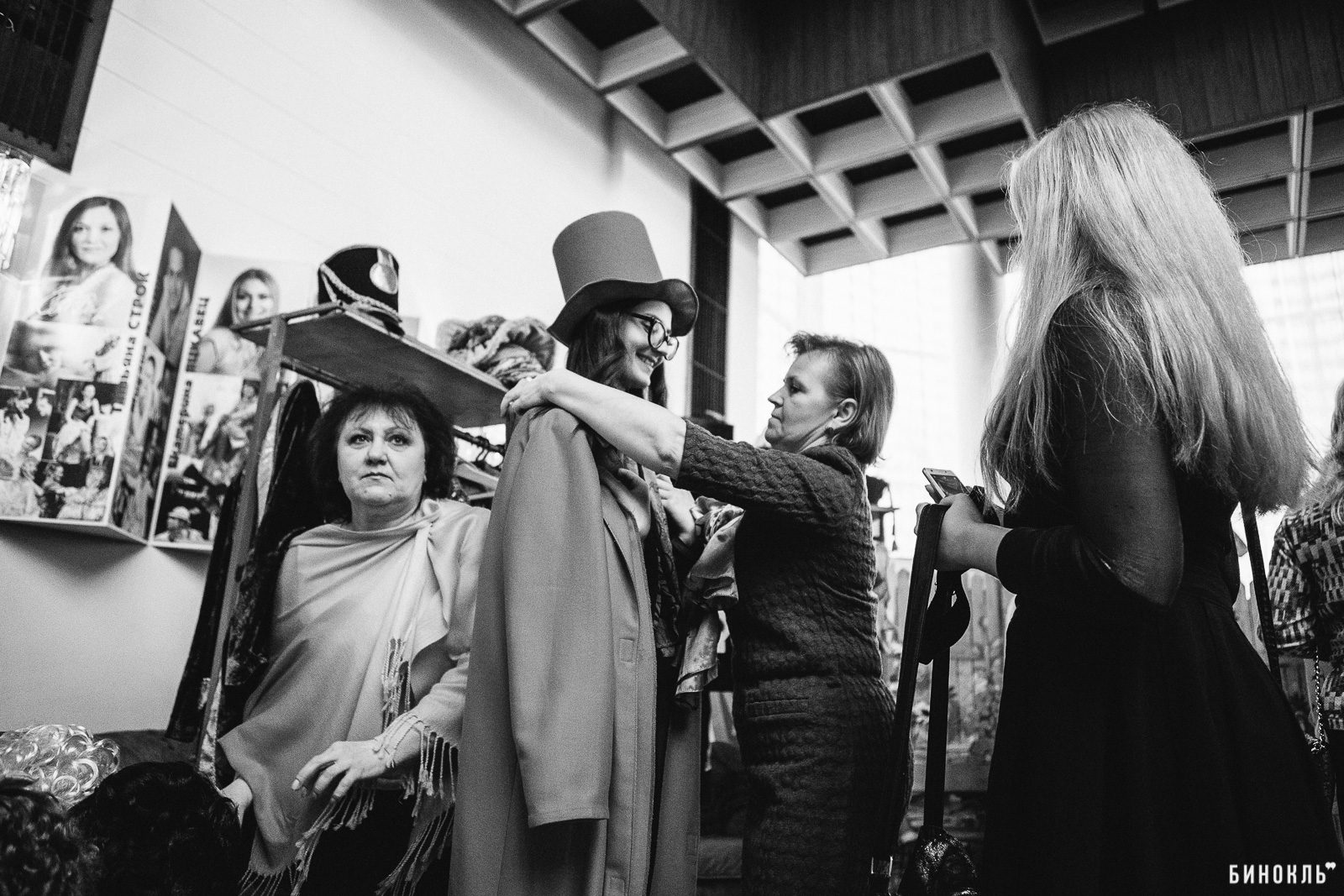 Пока одни поклонники сценического искусства выбирали, где провести следующий час, другие неспешно примеряли казённые сценические костюмы: такой аттракцион оценила значительная часть пришедших.