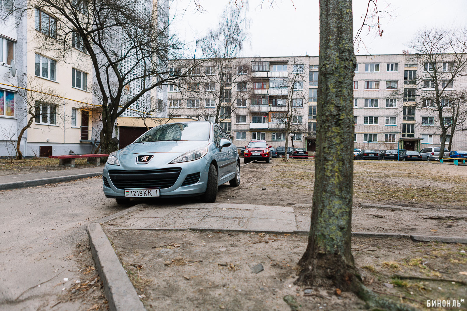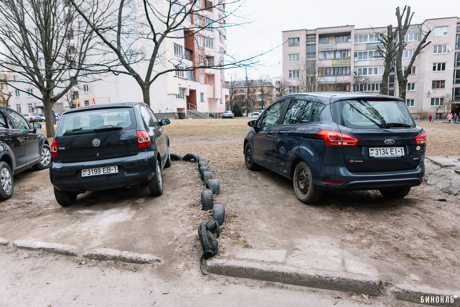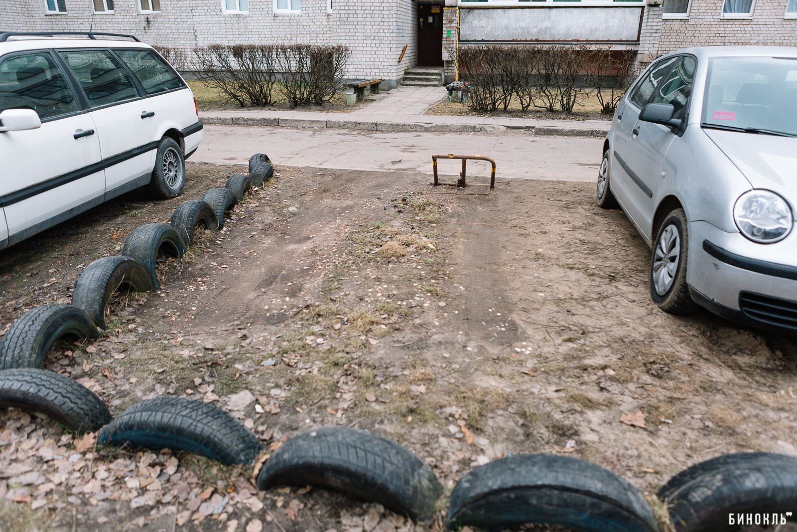 Смотри, видишь протекторы шин? — Гриша указывает на землю, где когда-то росла трава. — Видно, что здесь чье-то парковочное место. Многие люди паркуются возле подъездов, и это препятствует передвижению служебного транспорта. Этот двор небезопасен. Рядом две школы и детский сад. Дети в любой момент могут выбежать и попасть под машины. Прошлой осенью мы насчитали во дворах 115 машин, которые смело можно было штрафовать за неправильную парковку. Парадокс в том, что в пяти минутах ходьбы находятся три парковки: бесплатные возле “Короны” и “Санты” и платная (35 р. в месяц).
