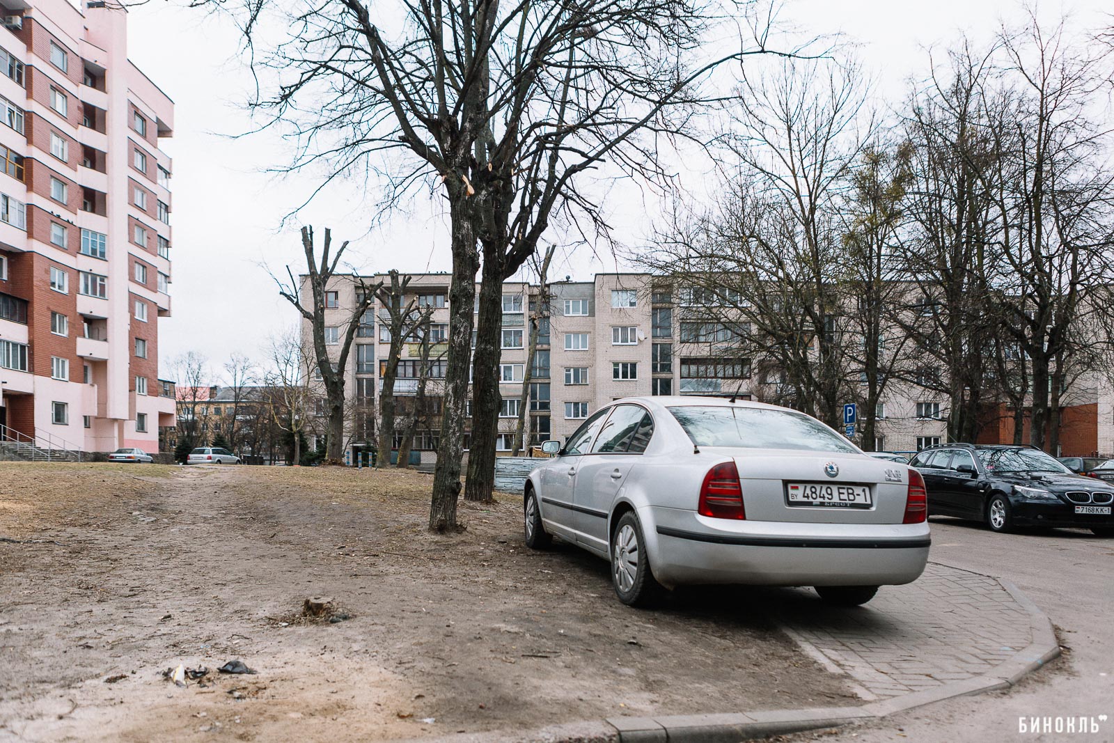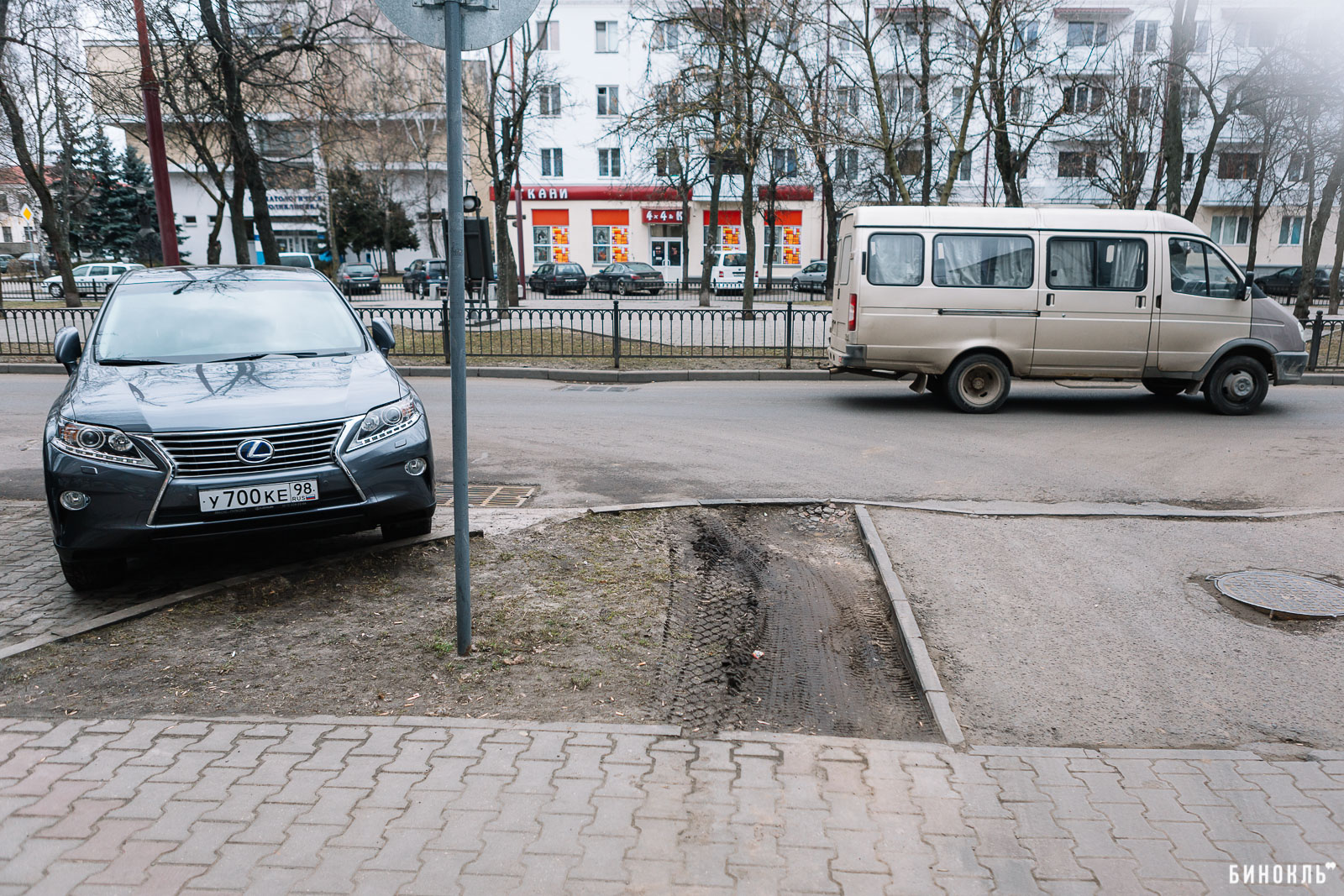 После общественных кампаний и публикаций в СМИ ситуация начала улучшаться и это соотношение изменилось — 70 на 30. Люди стали понимать, что можно припарковать машину на специально оборудованном паркинге и немного пройтись до дома. Мы сворачиваем на улицу Дзержинского и сразу же натыкаемся на припаркованные на зеленой зоне автомобили.