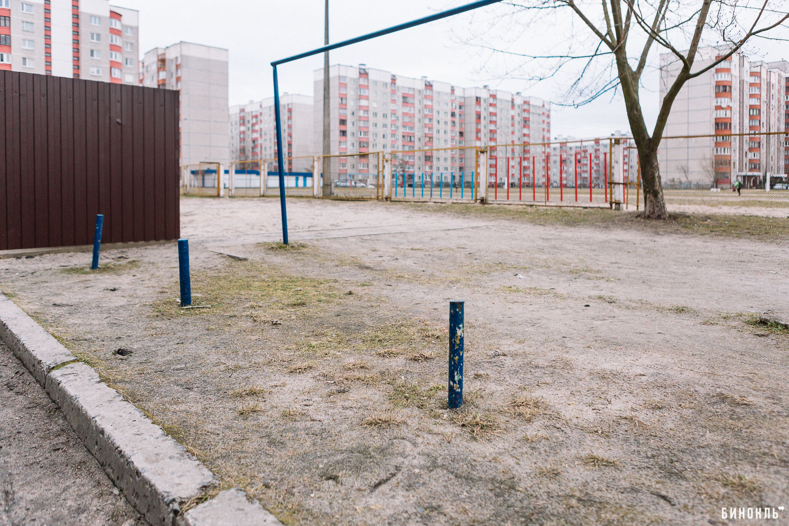 Возле школьного стадиона ситуация не лучше: машины стоят вплотную к нему. Замечаем старую конструкцию, которая мешает заезду. На земле наблюдаем какую-никакую растительность.