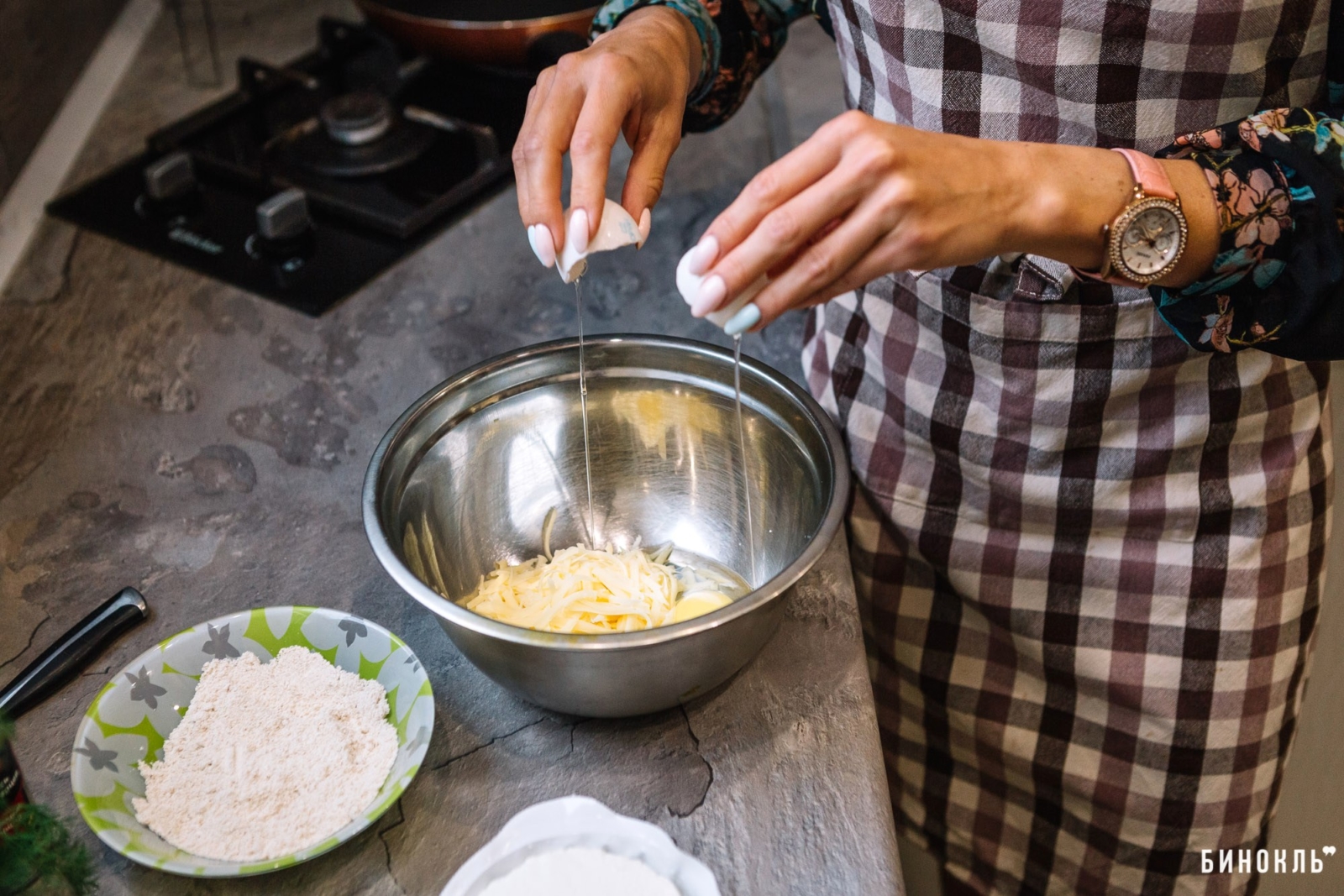 2. Добавить яйцо, натёртый на крупной тёрке сыр, специи.