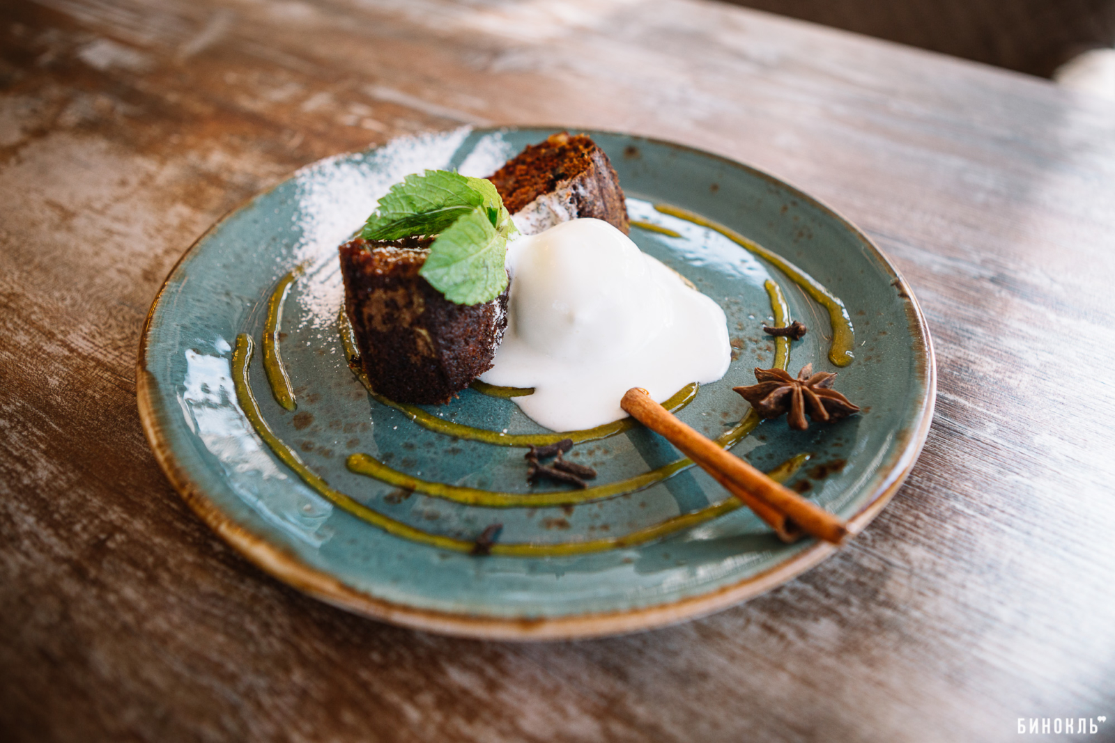 Блюда подают на крафтовой посуде — отдают ей предпочтение еще с «Бельмондо». Десерты в «Незабудке» готовит повар-кондитер, которая специализируется только на них.