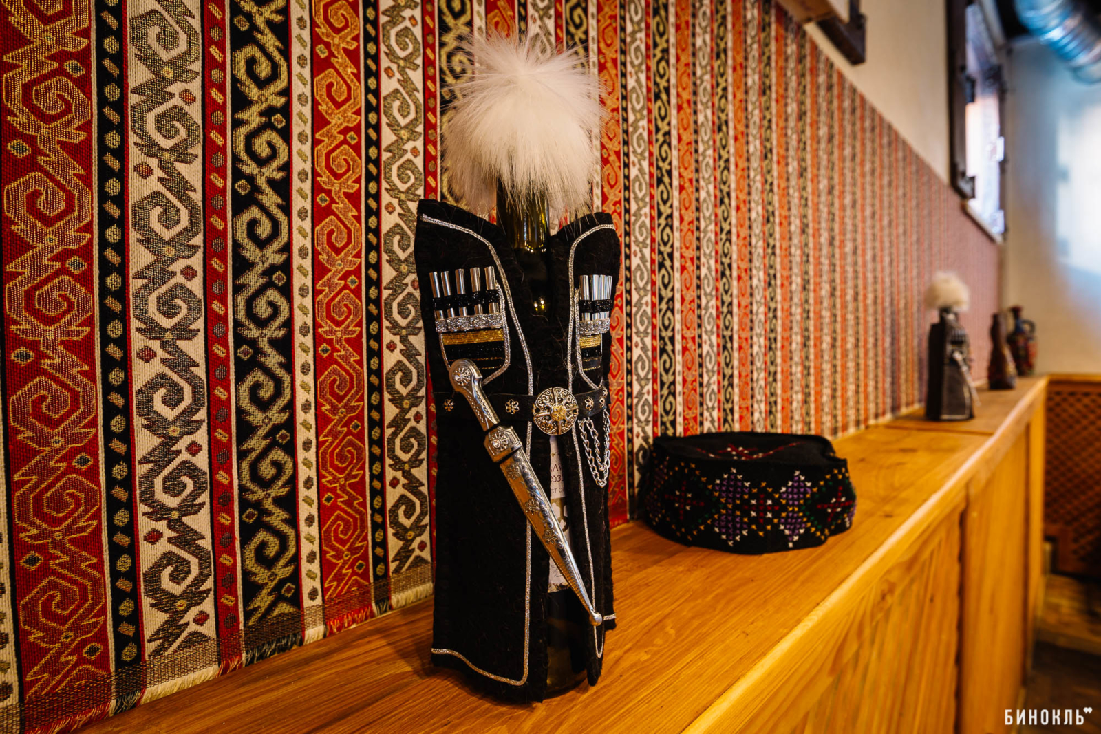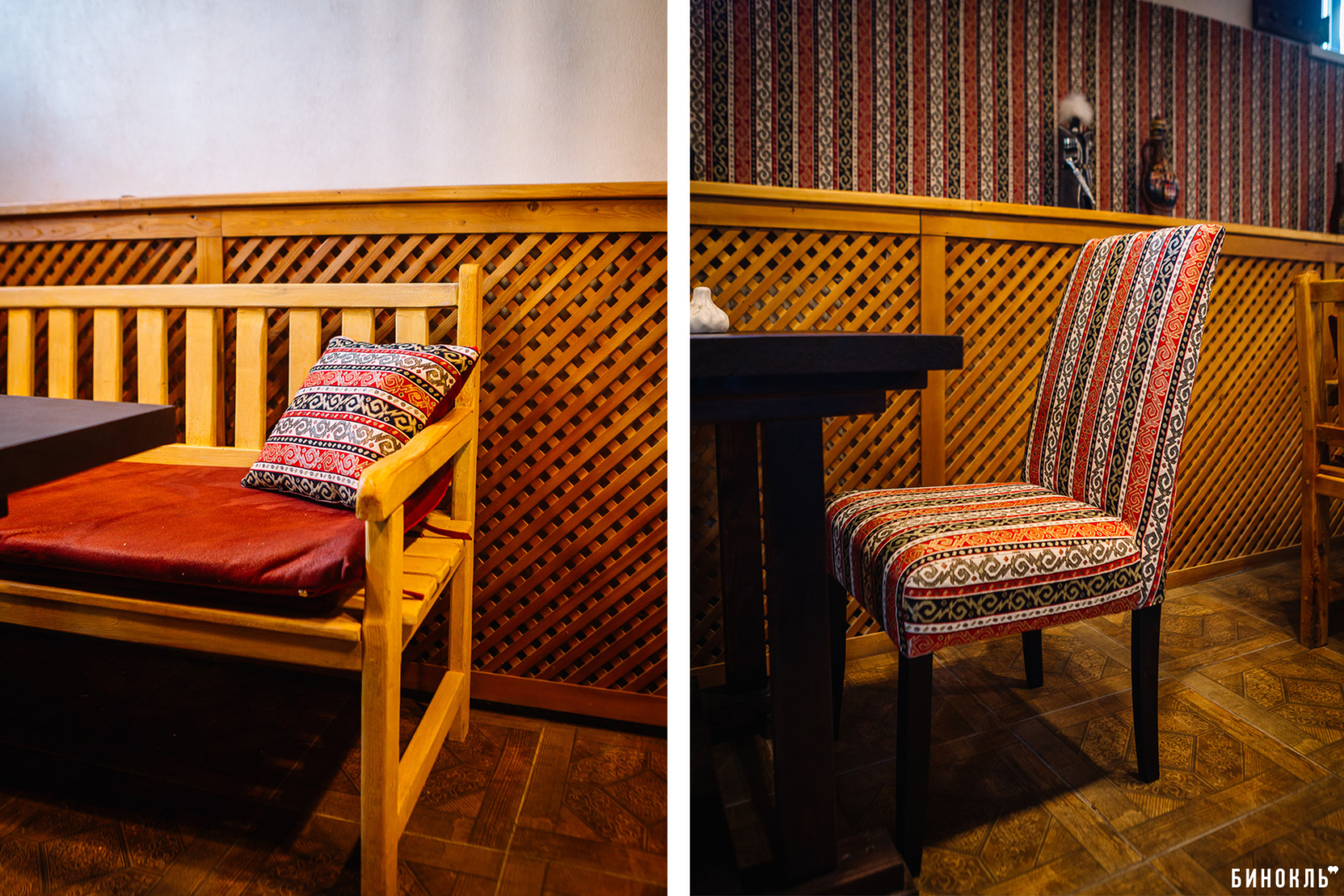В заведении – 25 посадочных мест. Над дизайном и интерьером работал хозяин, идеи не жалея подкидывали друзья – представители грузинской диаспоры в городе. Ресторан держит курс на аутентичность: натуральные материалы с добавлением традиционных национальных мотивов. Для обивки стульев, лавочек (и даже стен) везли ткань из Грузии, как и подушки с орнаментом. На входе – бушлат и пахаха: для привлекательных Insta-фото, разумеется.