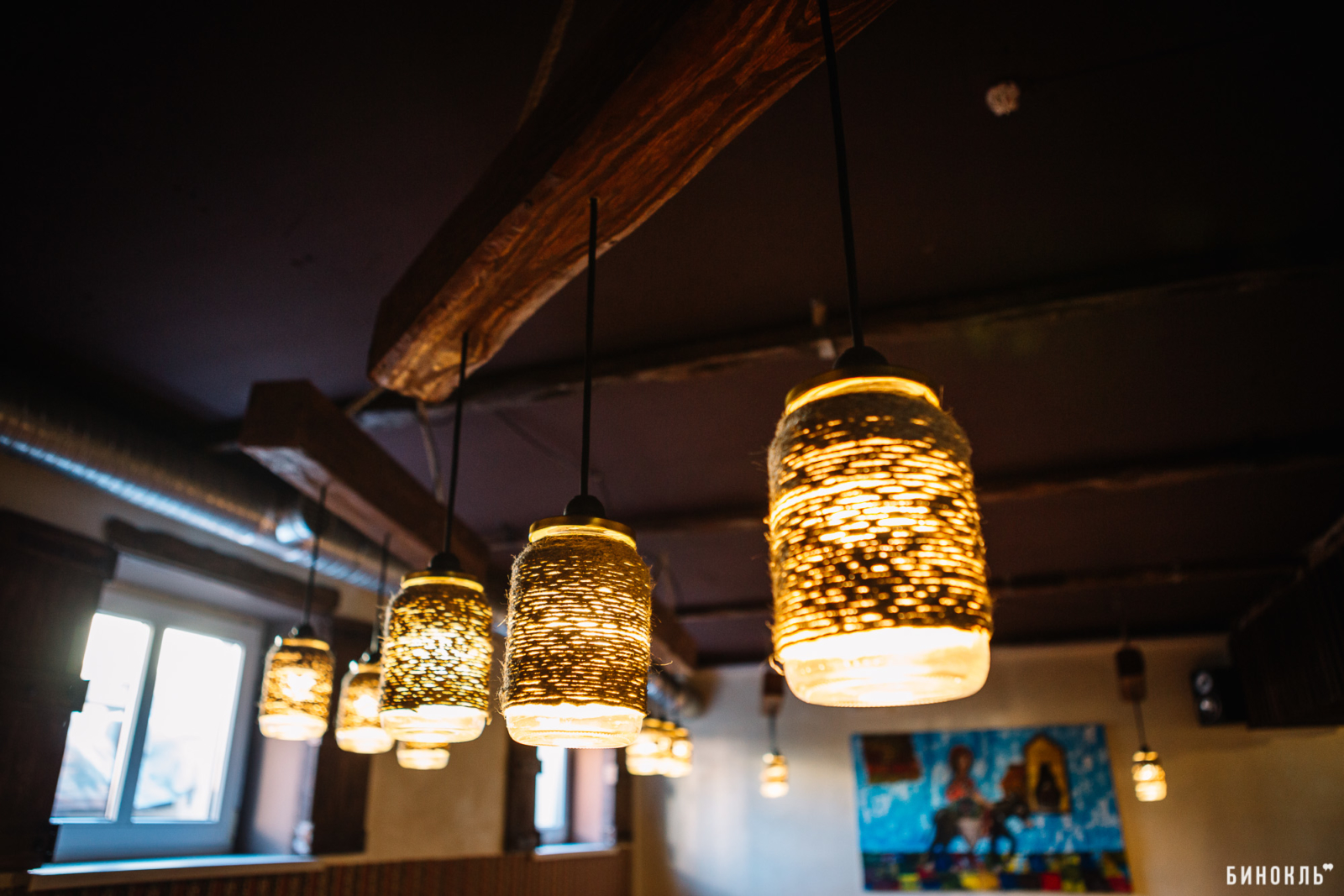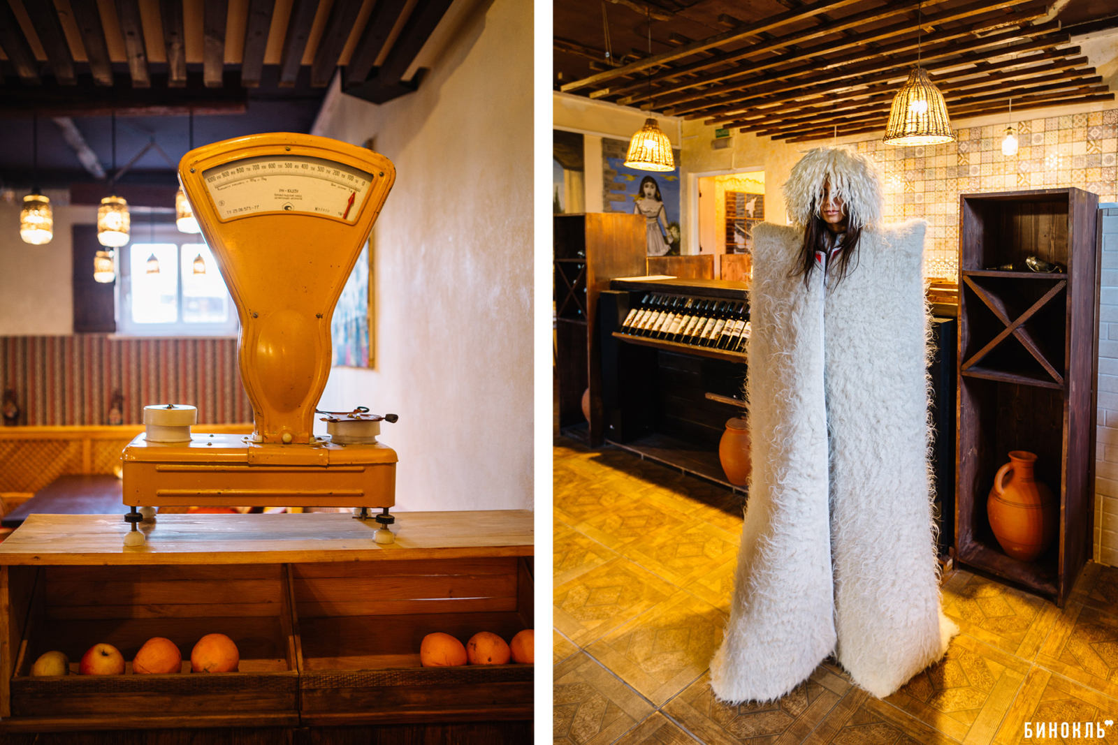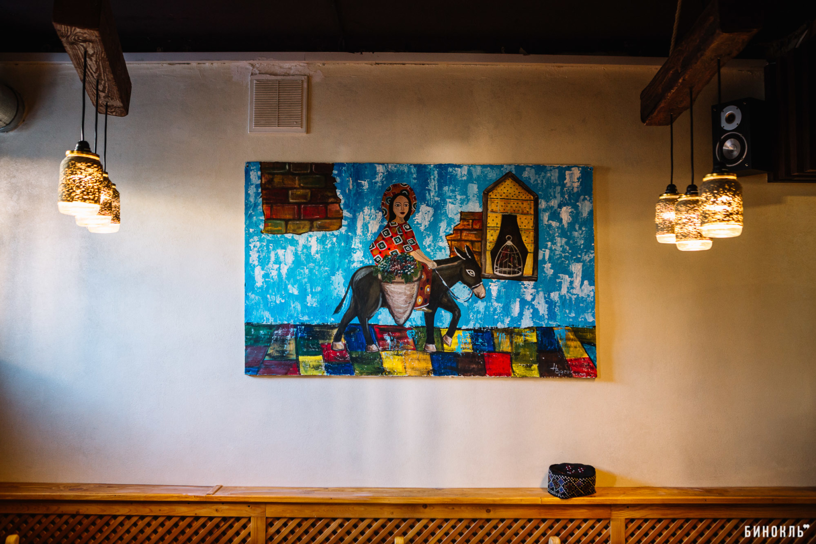 Всё – хендмейд: лепнина на входе, деревянная мебель: столы, стулья, барная зона, винный шкаф, ставни на окнах и лавочки (подсмотрены в Грузии), светильники-банки, глиняная посуда, роспись стен и репродукции известных картин художников, с акцентом на работы Пиросмани: «Праздник», «Актриса Маргарита» (художница – Надежда Вусик).